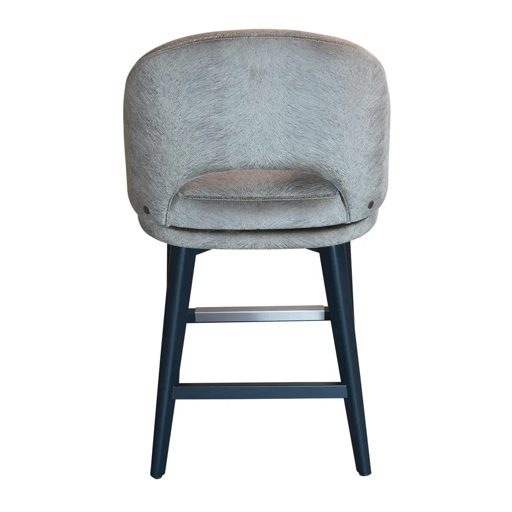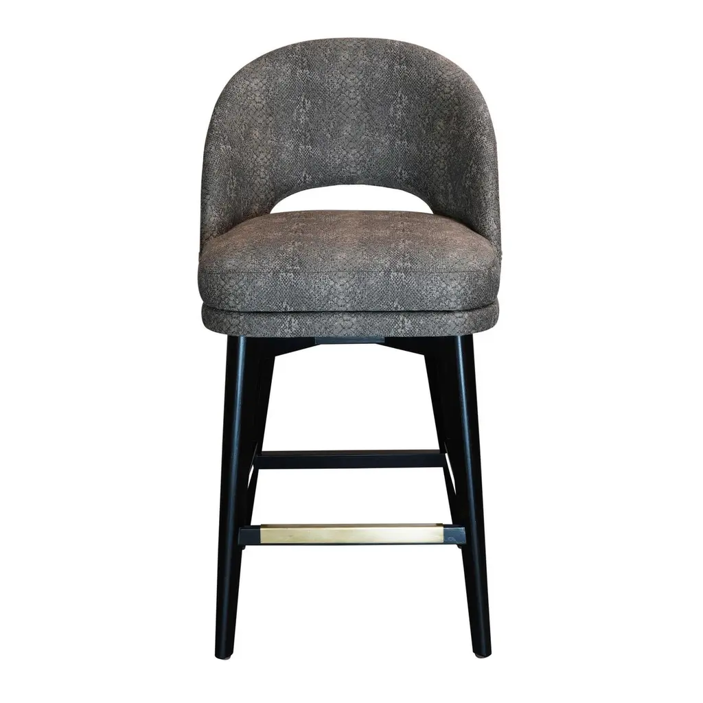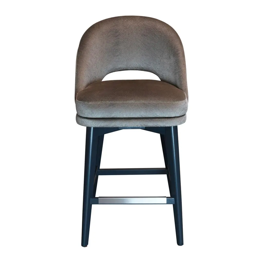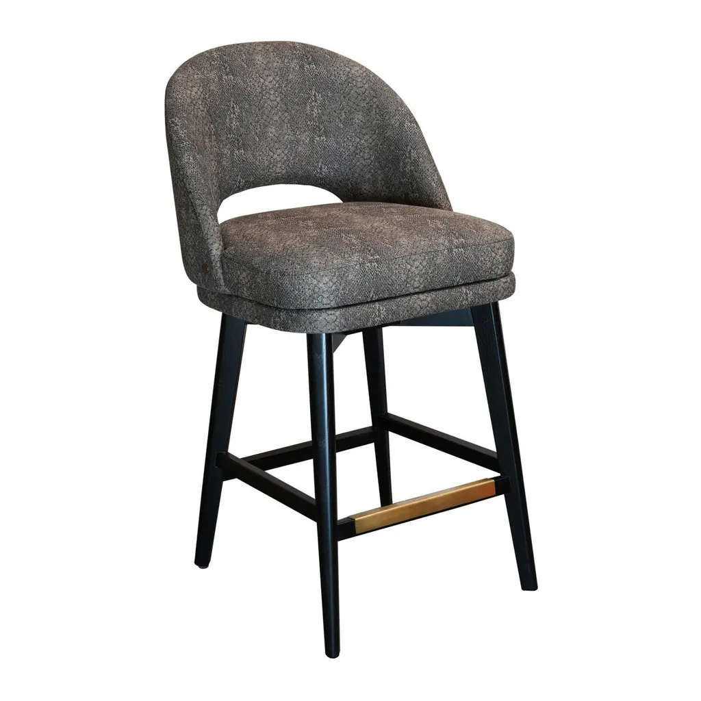 Counter stool with dark wenge stained beech legs, fully upholstered seat and back and brass footrest. COM.Available in counter or bar height and totally customizable including finish, wood, metal and COM. Leather and fabric options available at an additional price.Can be made with or with out a swivel seat.