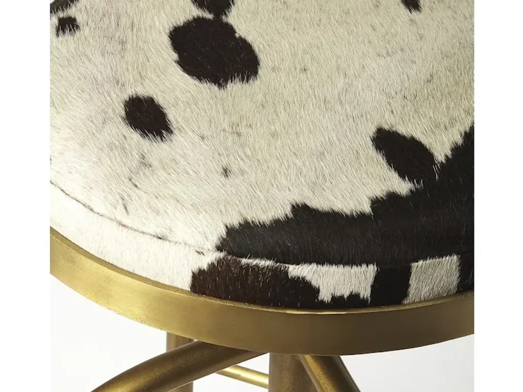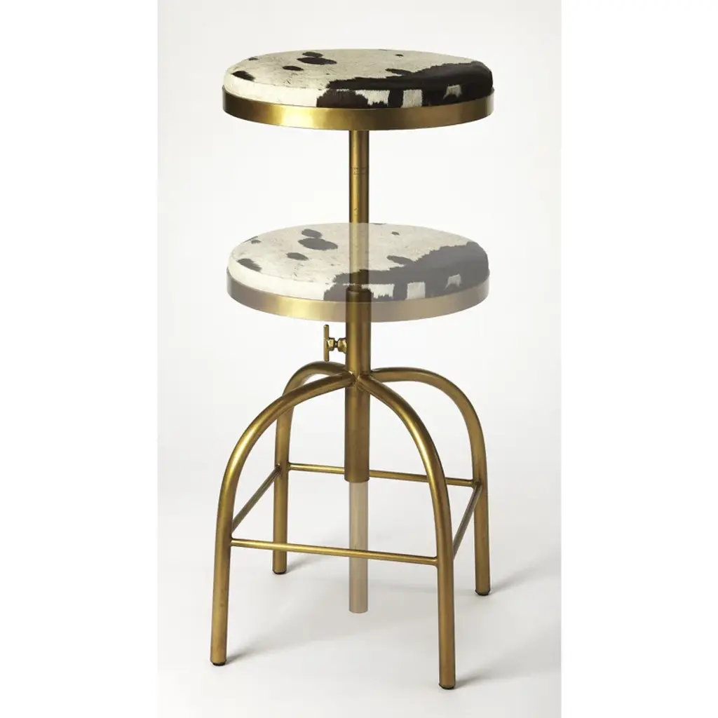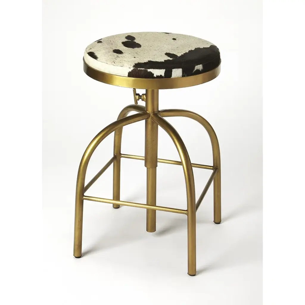 Perfect pulled up to your open-concept kitchen island or paired with a rustic home bar, this stylish swivel bar stool lends a touch of rustic appeal to any ensemble. Crafted of Iron in a gold finish, the four-legged frame features a hand adjustment and a built-in, square footrest. Sporting a warm brownish black and white finish, the backless Hair on Hiding leather seat features a mechanism to keep you in the flow of conversation, while a threaded column shaft adjusts the seat height for a customized fit.