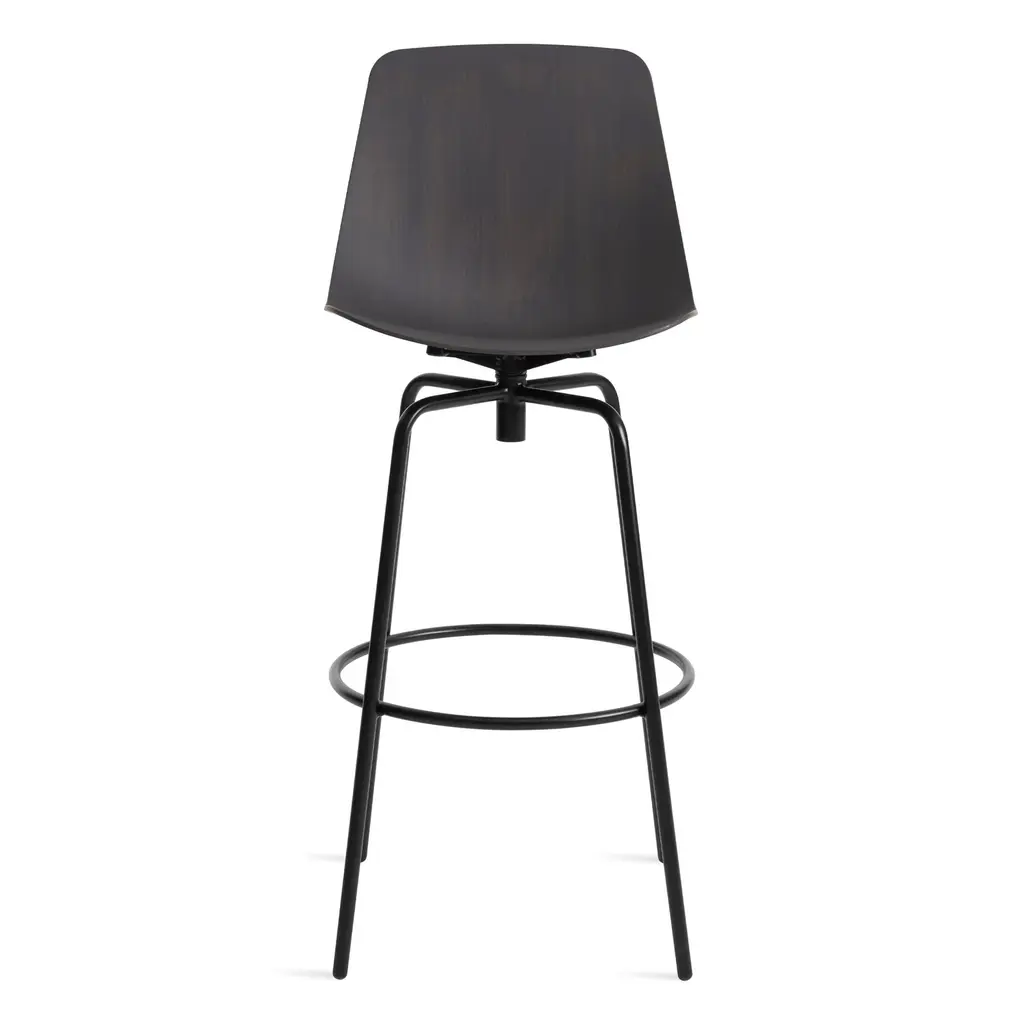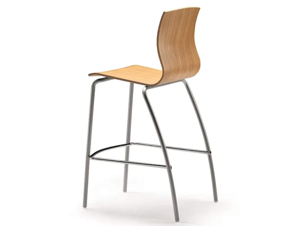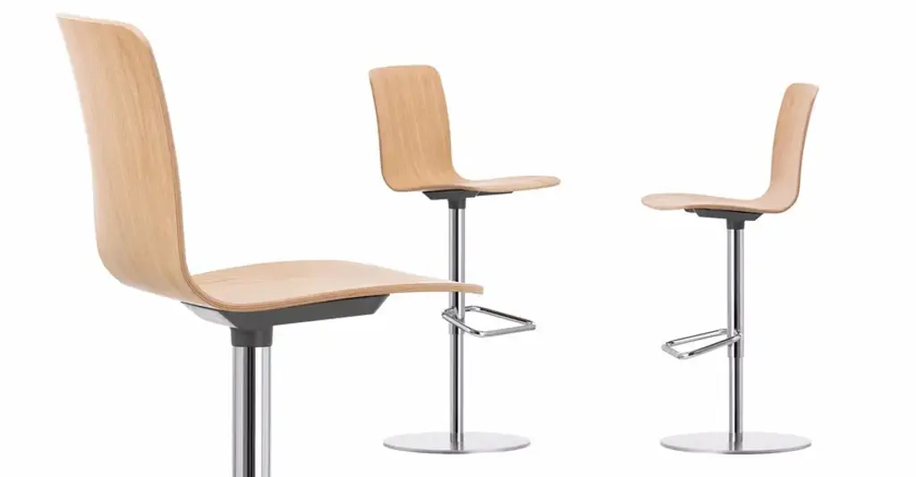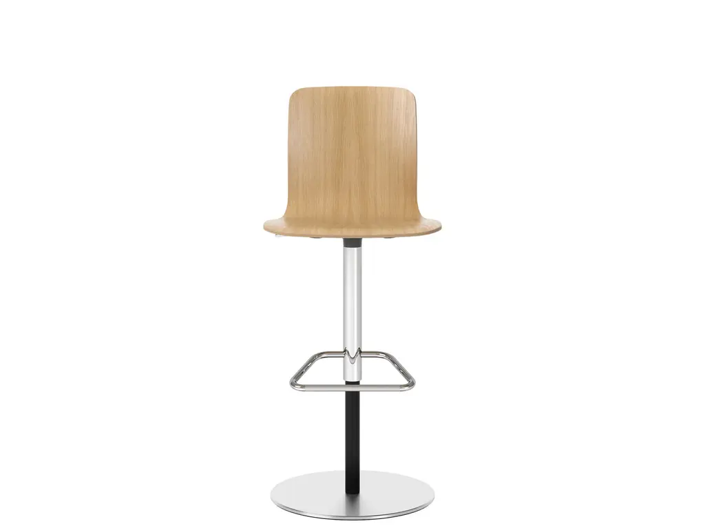 HAL Ply Barstool- Seat shell: swivel, plywood.- Base: height-adjustable tubular steel pedestal, pneumatic lift powder-coated in basic dark, column sleeve and footrest in chrome-plated tubular steel with anti-skid surface.HAL is Jasper Morrison's interpretation of a shell chair in the tradition of the Plastic Chair by Charles and Ray Eames, whose variety of different bases enables versatile use – from dining tables to meeting rooms, from bars to auditoriums. HAL is now also available in the version HAL RE with seat shells made of recycled plastic – as side chairs or armchairs.The chair bases exist in metal or wood, on castors as studio models or in high versions for bar stools and as a beam solution for waiting zones.These different base options can be combined either with a seat shell in plastic (HAL and HAL RE) or plywood (HAL Ply), or with a lightly padded shell covered in fabric (HAL Soft).The recycling material for HAL RE stems from Germany's 'Yellow Bag' (Gelber Sack) collection of household waste, which primarily consists of used packaging. Utilising this recycled material instead of conventional plastic generates fewer climate-damaging emissions and also significantly reduces energy consumption.Due to the composition of the recycled material, the different colours are interspersed with tiny specks of pigment. The colour white cannot be implemented in the new material at the moment and will follow as soon as technically feasible. The HAL RE seat shell can also be 100% recycled at the end of the product's life.When destined for use in large numbers in auditoriums, multipurpose rooms, training areas etc., HAL RE can be ordered with stackable bases, optional row connectors and seat numbering elements, as well as with a stacking trolley.The comfort of the pleasantly flexible plastic or wooden shells can be further enhanced through the addition of seat cushions or seat upholstery – or by opting for HAL Soft with its full upholstery.In the versions with a plastic shell and powder-coated base, HAL is also suitable for use in outdoor settings.The related HAL Armchair rounds out the HAL family.