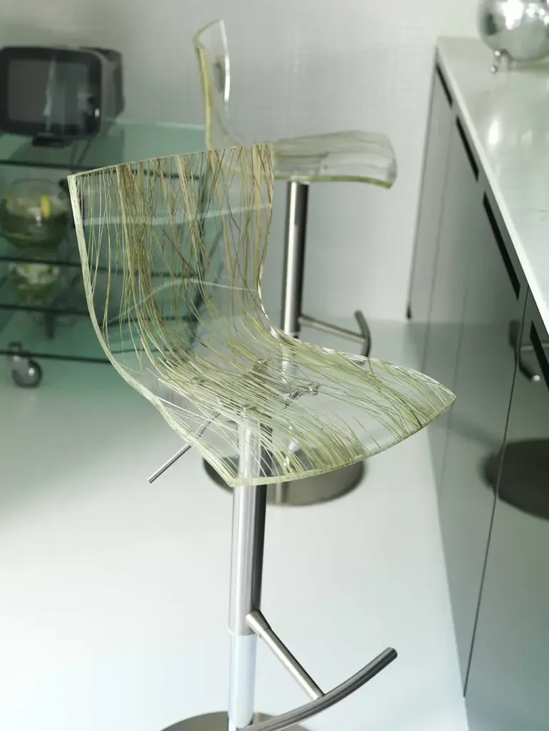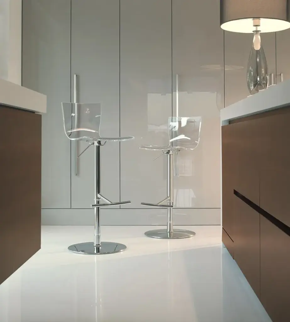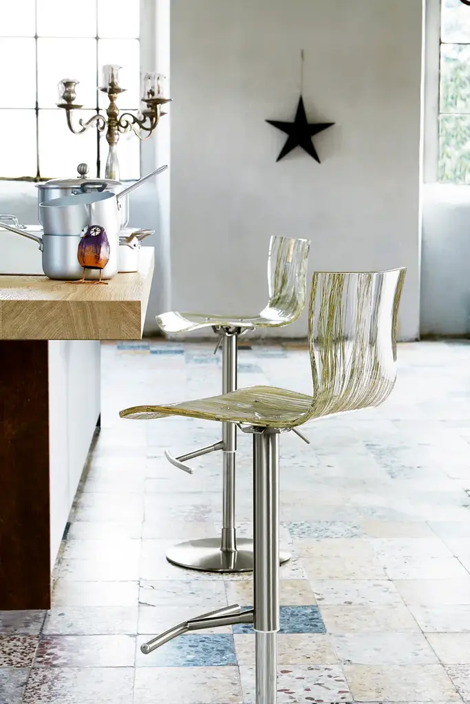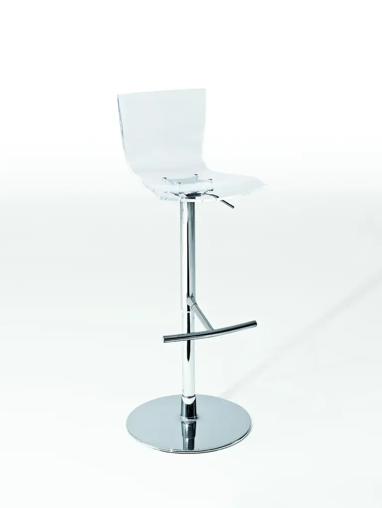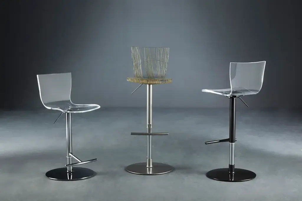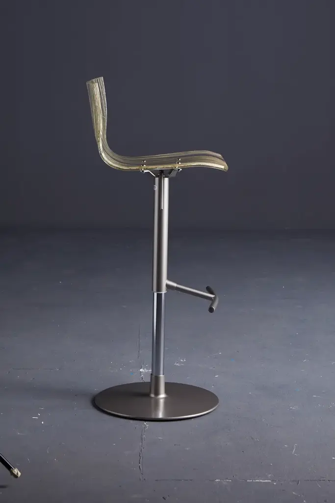 Hip.ss is a stool. Frame in varnished, chrome-plated or brushed stainless steel and aluminium adjustable in height by means of a varnished or chrome-plated gas piston. Swivel seat in transparent or marsh grass methacrylate.