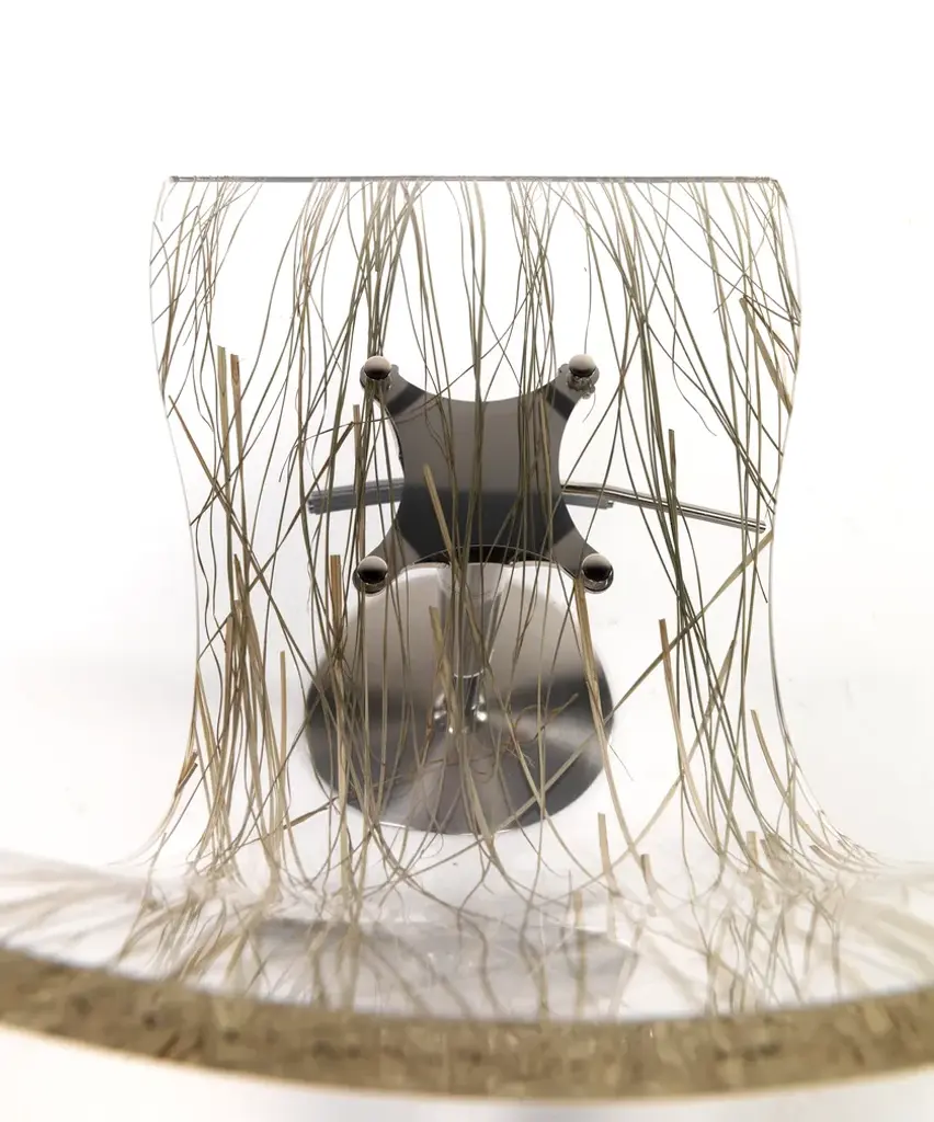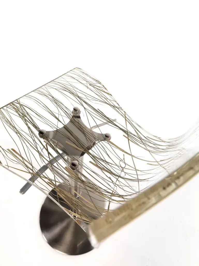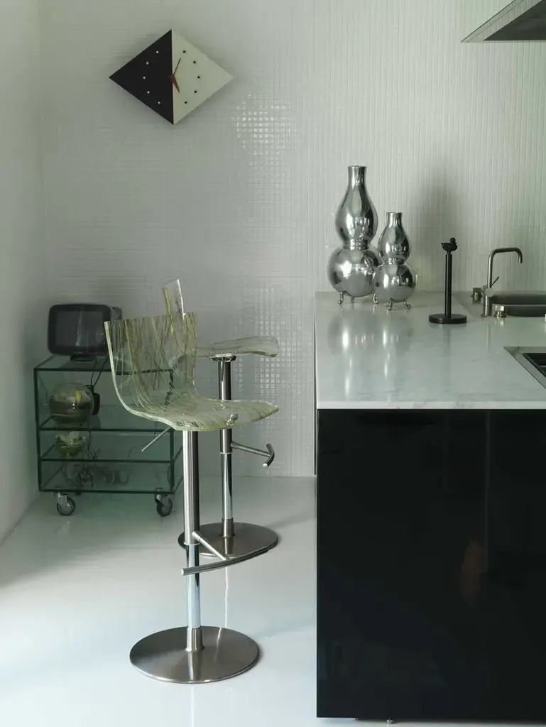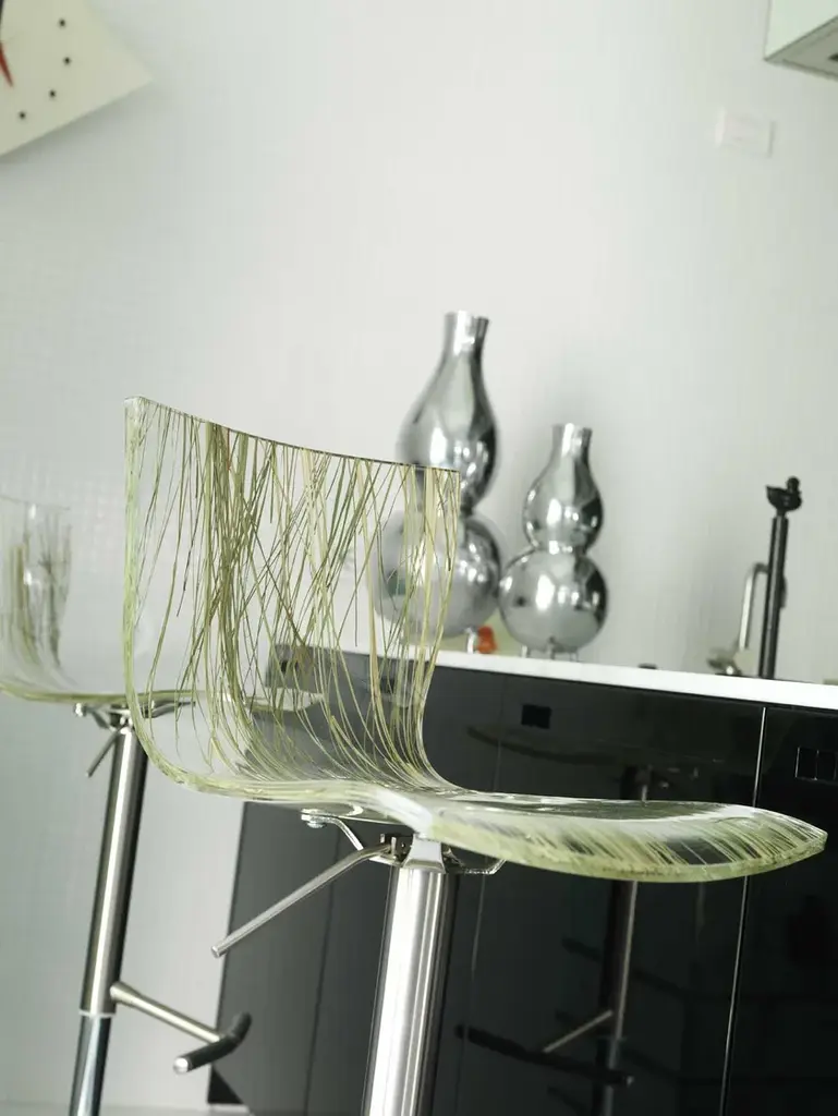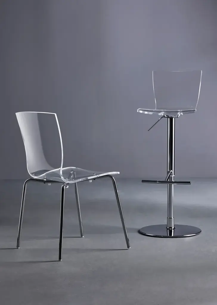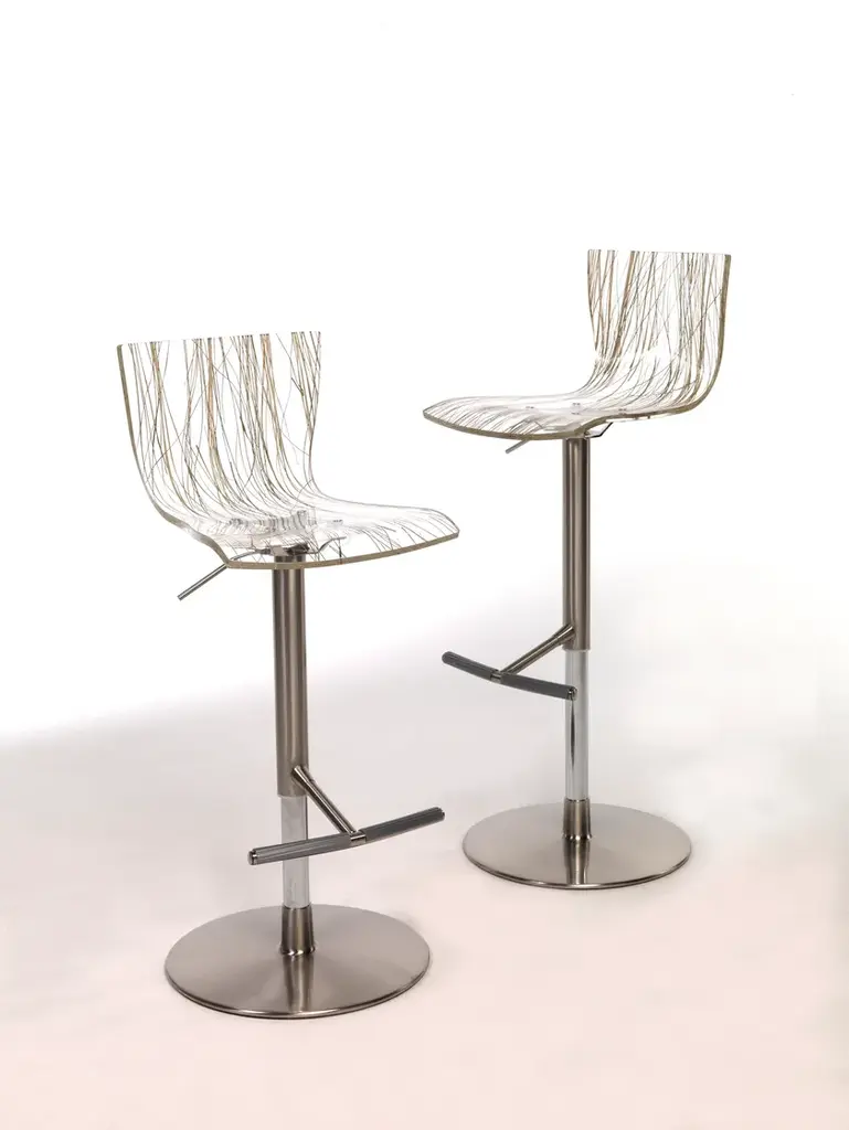Hip.ss is a stool. Frame in varnished, chrome-plated or brushed stainless steel and aluminium adjustable in height by means of a varnished or chrome-plated gas piston. Swivel seat in transparent or marsh grass methacrylate.