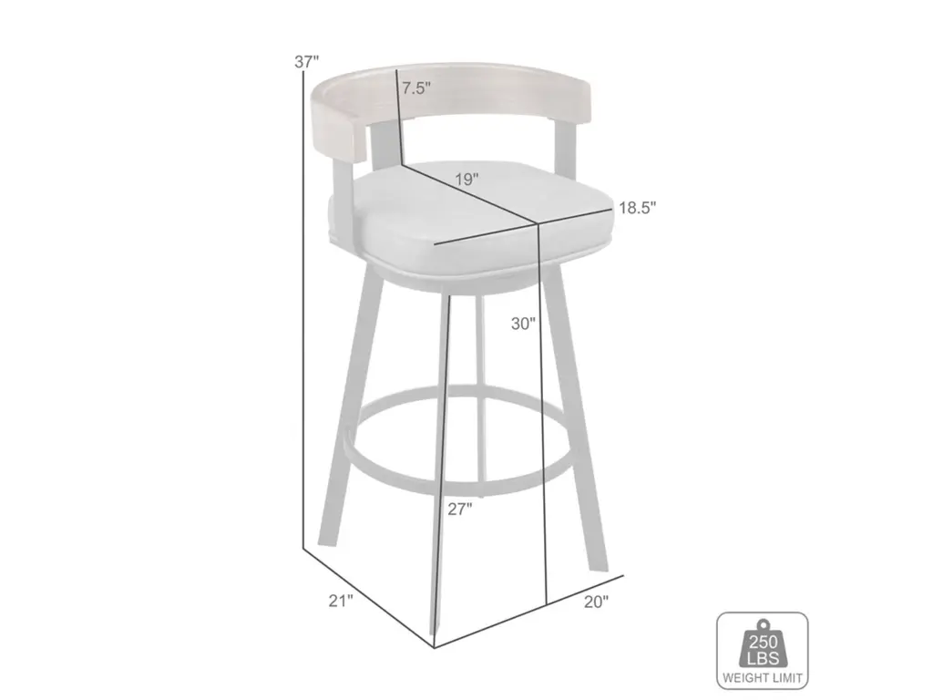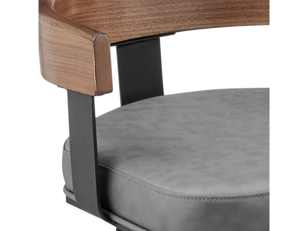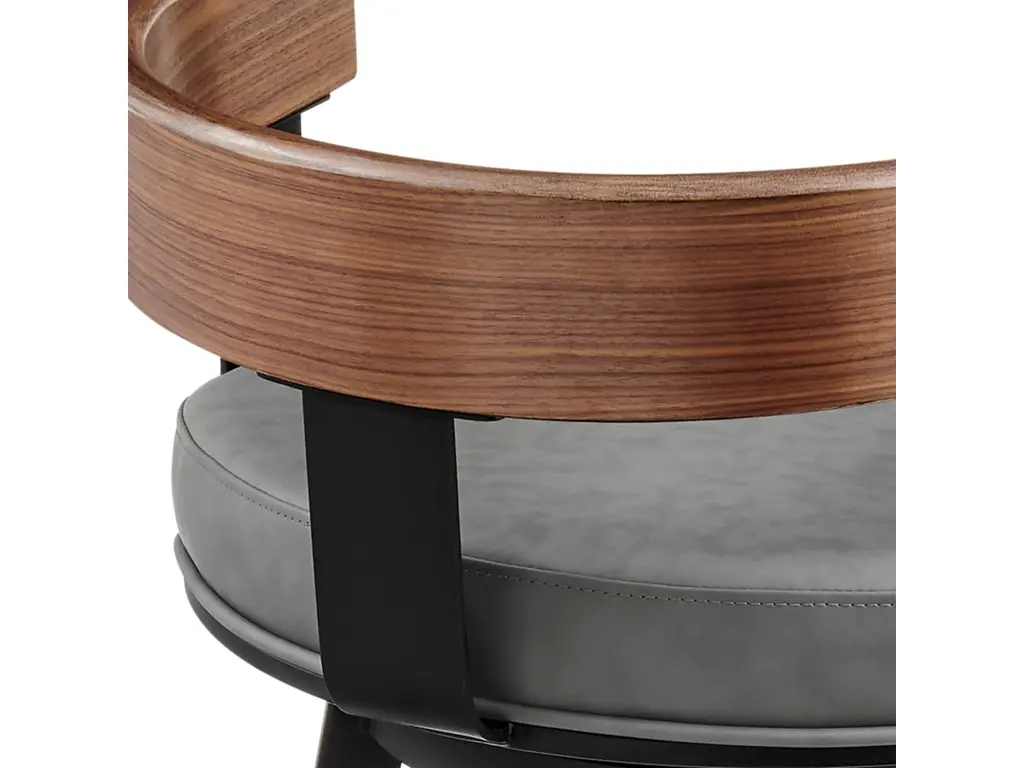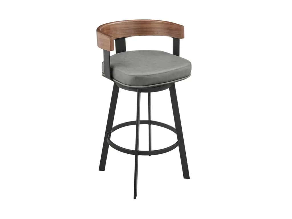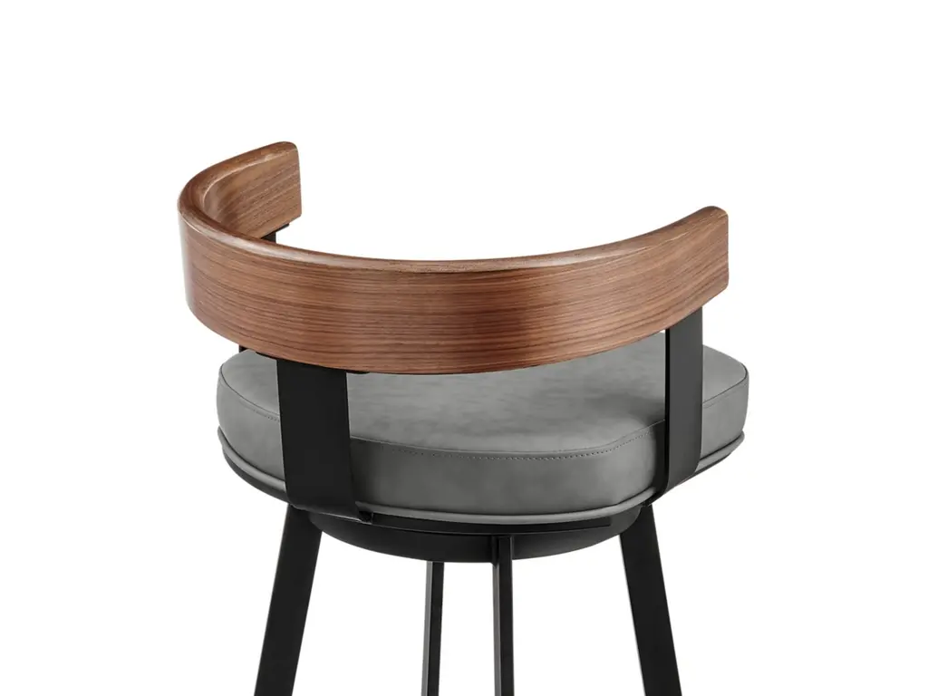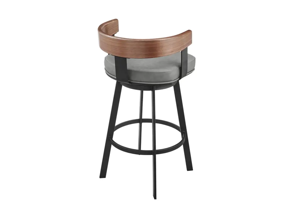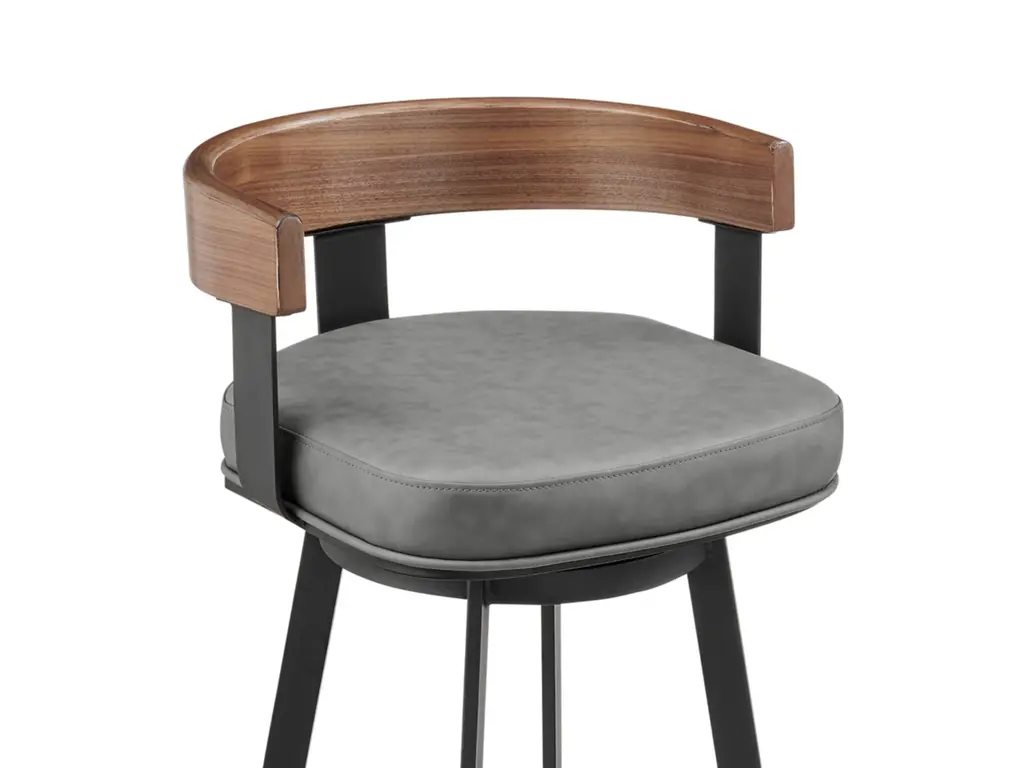 Upgrade your space with the sleek style and charm of the Idris Swivel Counter or Bar Height Stool in Faux Leather and Black Iron by Armen Living. Inspired by mid-century modern design principles, this barstool offers an elevated appearance and exceptional comfort. A refined barrel back envelopes your body, and the thick, high-density cushion offers extraordinary support. The generously padded seat is wrapped with luxurious faux leather to offer a premium seating experience. Perched upon tapered metal legs, our barstool ensures strength and long-lasting enjoyment anywhere from your kitchen to your home office. It lends a sophisticated touch to your kitchen island, pub table, home bar, or adjustable desk. The stool includes a built-in circular footrest, and its smooth, 360-degree swivel function enables you to change direction with ease and engage with everyone around you. The Idris Swivel Counter and Bar Height Stool is available in Black Iron and classic Walnut accent with your choice Vintage Gray or Vintage Black faux leather upholstery, providing versatile options to perfectly complement your home decor.