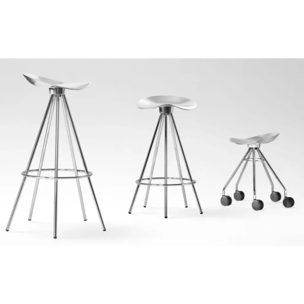 Jamaica All black stool by Pepe CortesDimensions: Diameter 51 x Height 78 cm Materials: A steel chromed five-legged stool. Swivel seat in a bright polished cast aluminum AG3 and anodized silver, or integrated with a solid varnished beech wooden seat. Available with wheels in a lower version.Available in sizes medium and small.We present a new “All Black” version. A renewed version in black with an aluminium or stained wooden seat in two heights, 77 cm (bar) and 66 cm (kitchen).In 1972, a group of young architects and designers from Barcelona created BD with the aim of producing and marketing furniture and other objects for our projects, with complete creative freedom and with a criterion that has turned out to be quite different from the norm at companies in the sector, regarding both the shape and function.