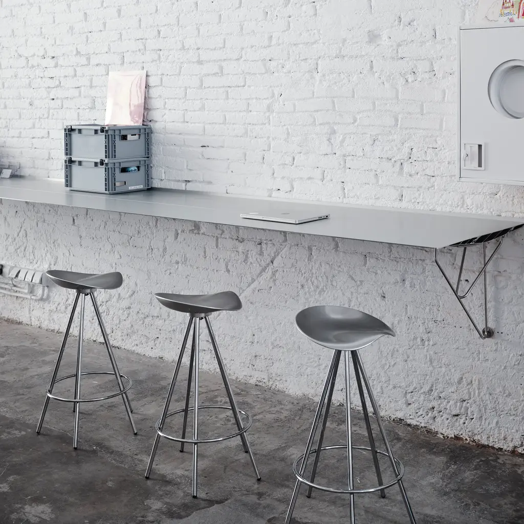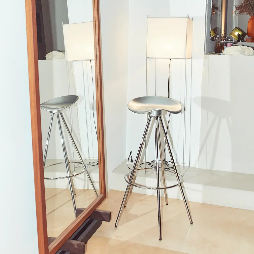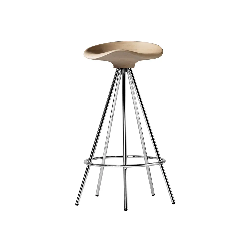 Originally created for the bar at a '90s Catalan discotheque, Jamaica has a distinctive but timeless look with an emphasis on its ergonomically shaped swivel seat in silvered aluminum or solid varnished beechwood. Offered in both bar or counter heights, the stool has a 5-legged steel tubing base that comes in a choice of complementary chromed or black-stained finishes.