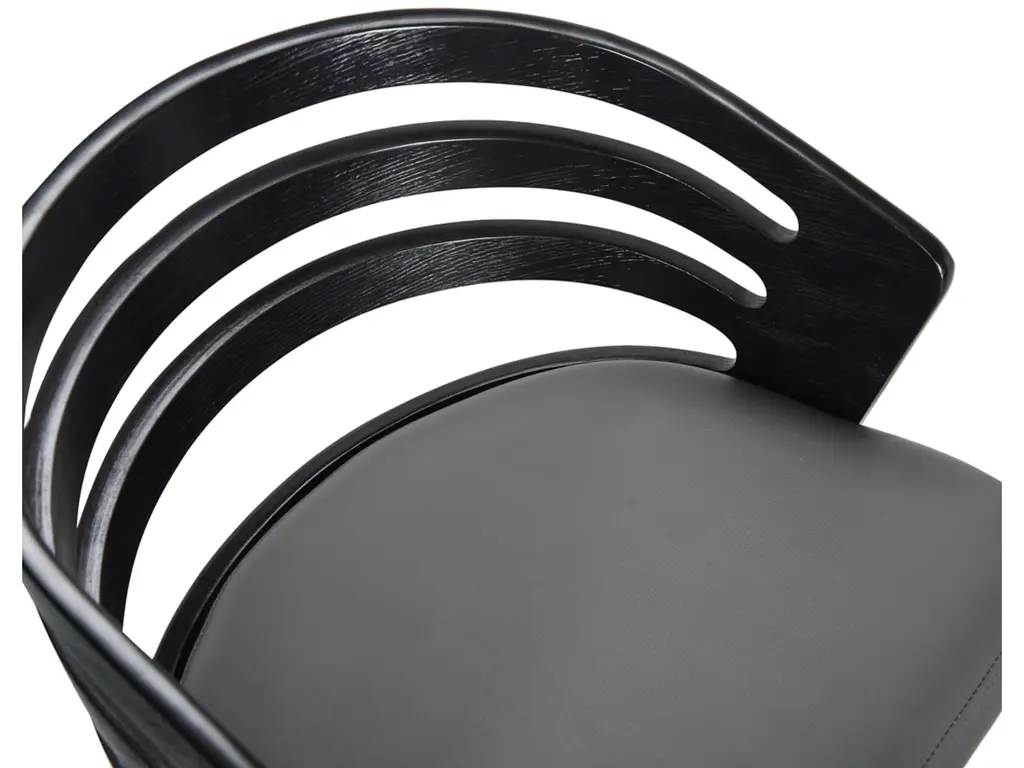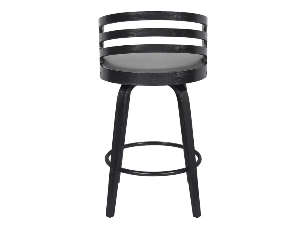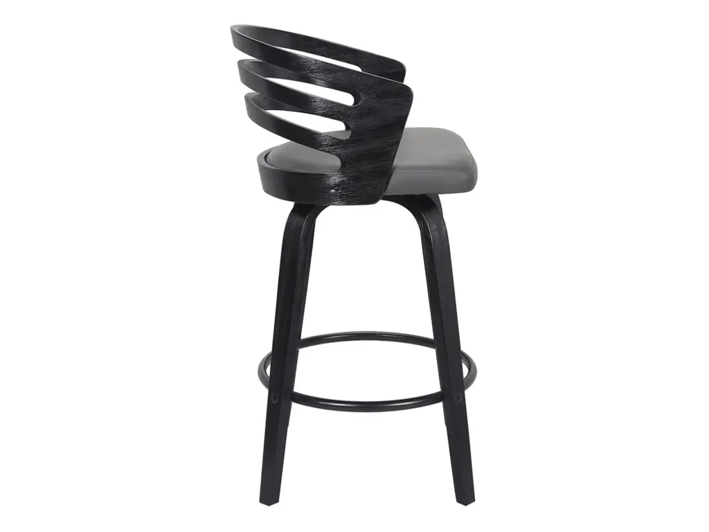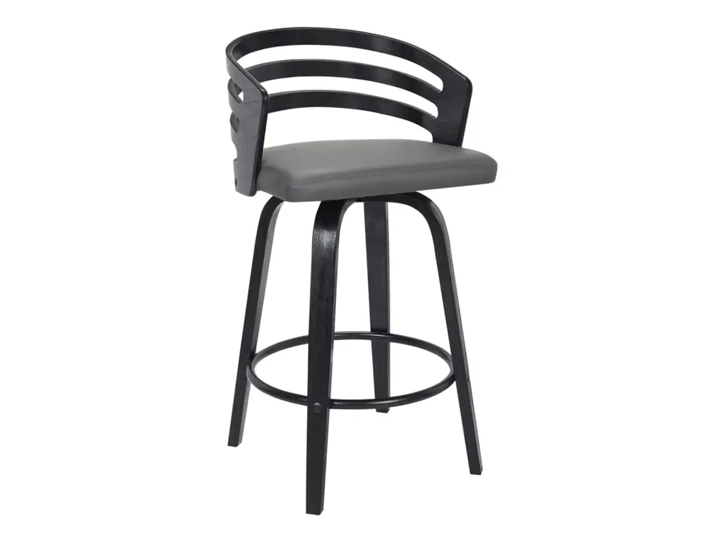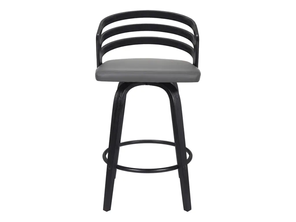 The Jayden 26" Counter Height Swivel Gray Faux Leather and Black Wood Bar Stool from Armen Living adds a touch of mid-century modern appeal to any home. The rounded seat back features ergonomic properties to keep your back healthy and properly aligned and serves as a beautiful design feature. The plush seat cushion is constructed from high-density foam and wrapped in luxurious faux leather upholstery that is stylish and durable, allowing for easy clean up. The Jayden counter stool easily pulls up to your kitchen island, peninsula counter or home bar and the 360-degree swivel function helps you easily engage with your friends and family regardless of their place in the room. The metal ring footrest gives you an added point of convenience and allows for comfortable seating for hours on end. Although the flared bentwood legs and silhouette are reminiscent of mid-century modern times, the Jayden kitchen stool is a timeless piece that will last for many years to come.