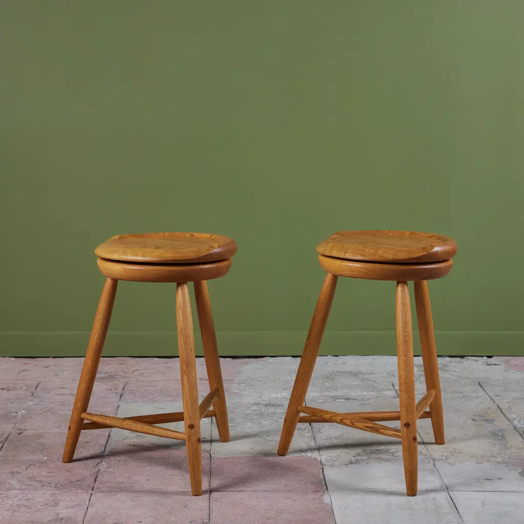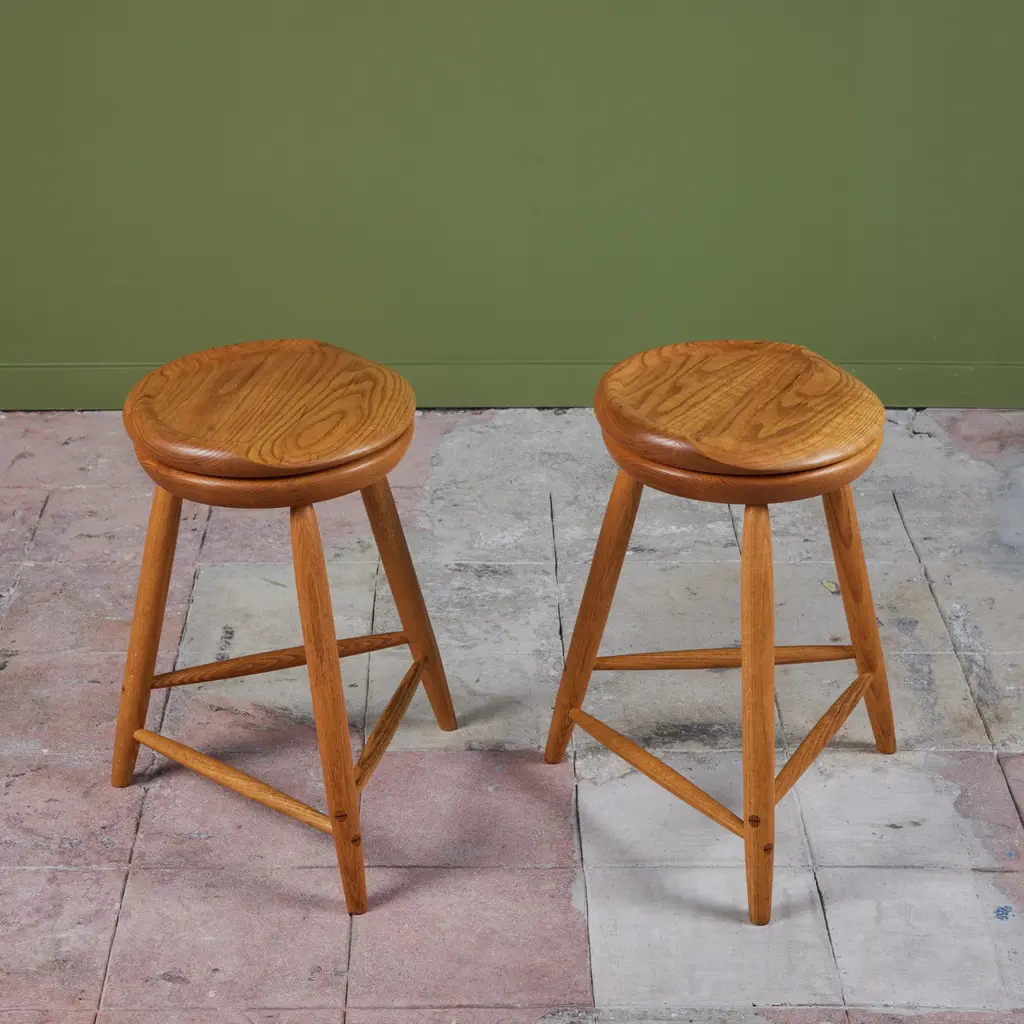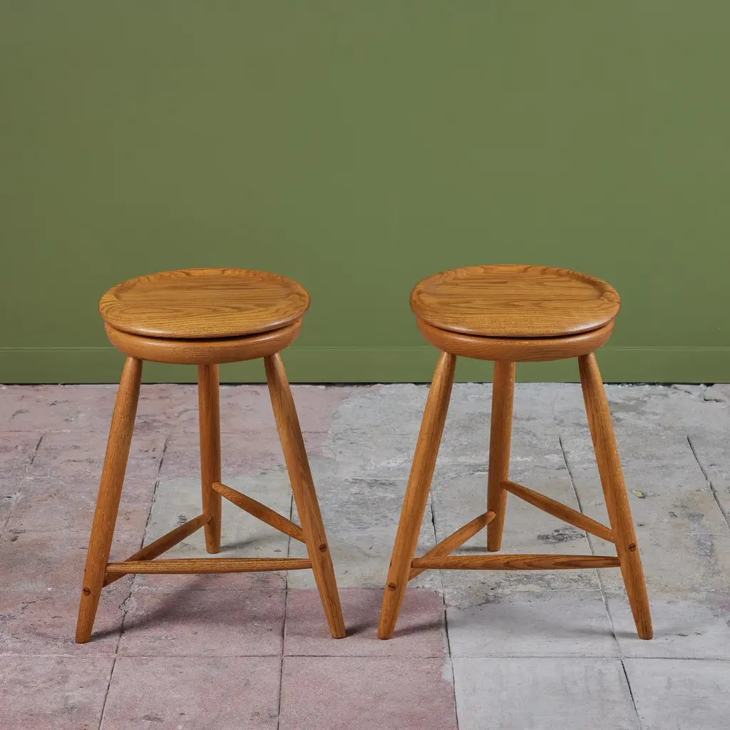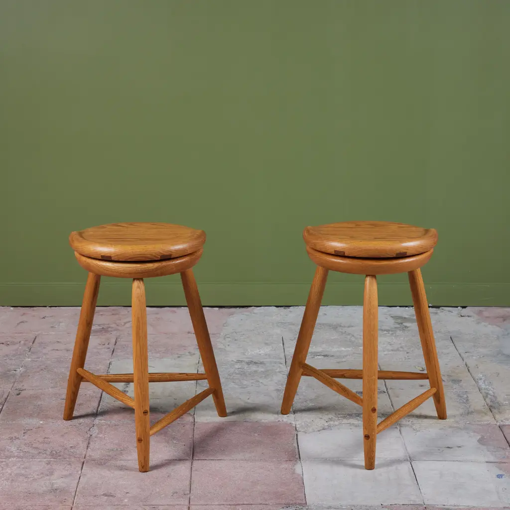 Studio craft stool made by Kai Pedersen c.1987, USA. The oak stool showcases a minimalist design with a swivel seat and rounded edges. The stool is supported by three dowel legs with stretchers. 2 available, signed Kai Pedersen - 1987. Dimensions 15.25" width x 15.75" depth x 24.75" height. Condition Excellent restored condition; professionally refinished.