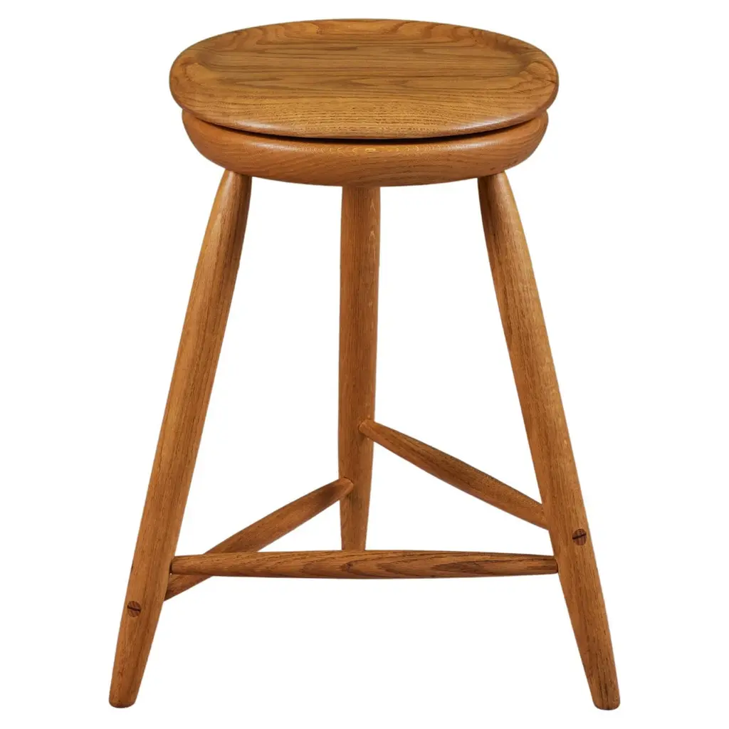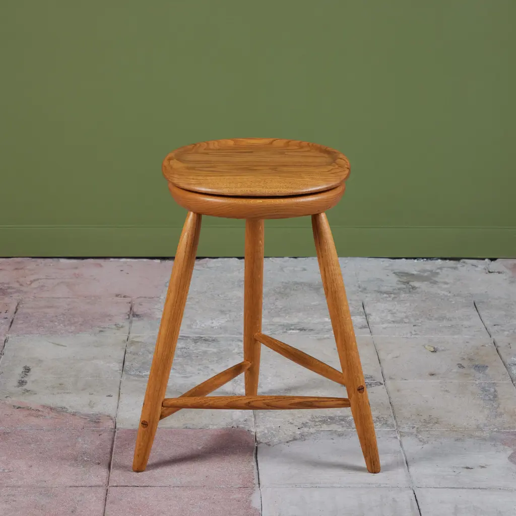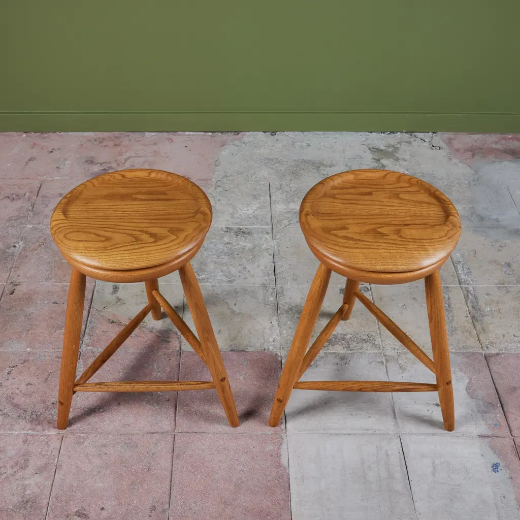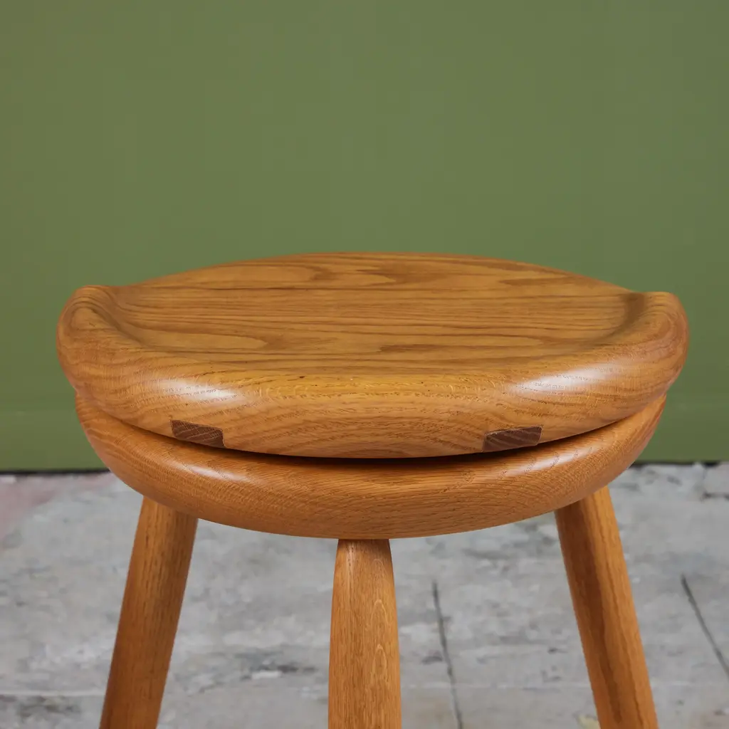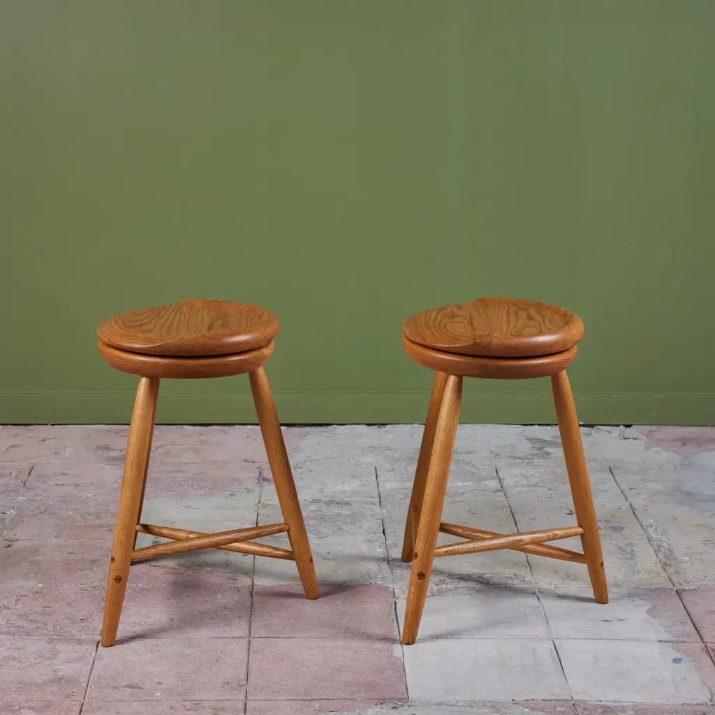 Studio craft stool made by Kai Pedersen c.1987, USA. The oak stool showcases a minimalist design with a swivel seat and rounded edges. The stool is supported by three dowel legs with stretchers. 2 available, signed Kai Pedersen - 1987. Dimensions 15.25" width x 15.75" depth x 24.75" height. Condition Excellent restored condition; professionally refinished.