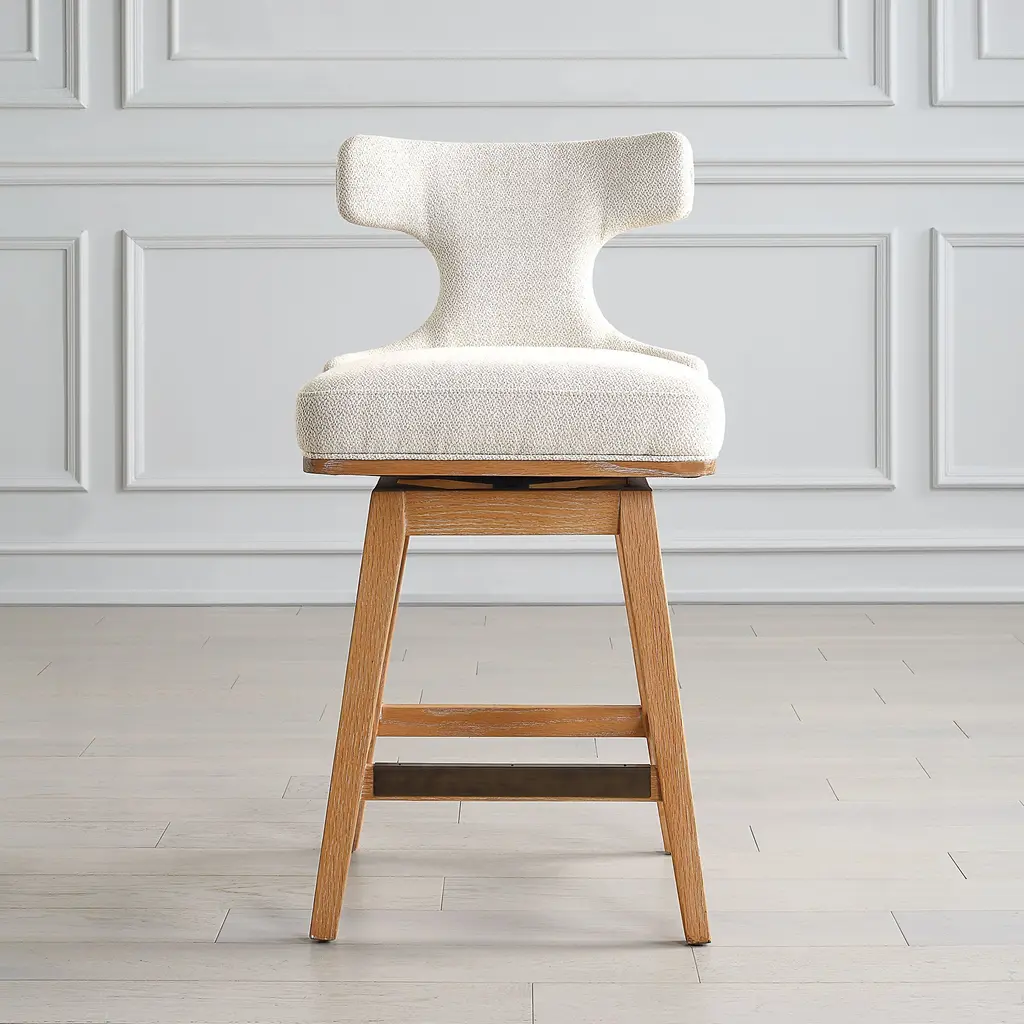 A Modern Take On The Classic Klismos Design, This Counter Stool Is Reminiscent Of Mid-century Style. Upholstered In A Textured Off-white Fabric With A Swivel Return Seat With A Toxin-free, Eco Friendly Treatment To Help Resist Water Based Stains. Paired With Naturally Finished Oak Legs With A Bronze Kickplate. Seat Height Is 26".