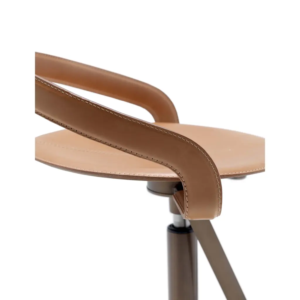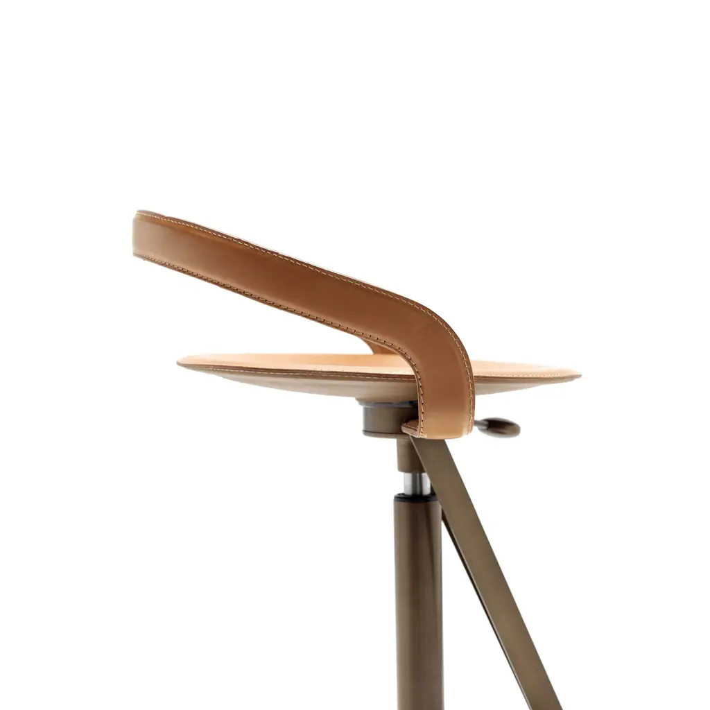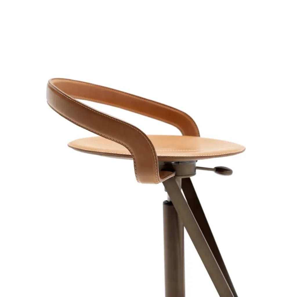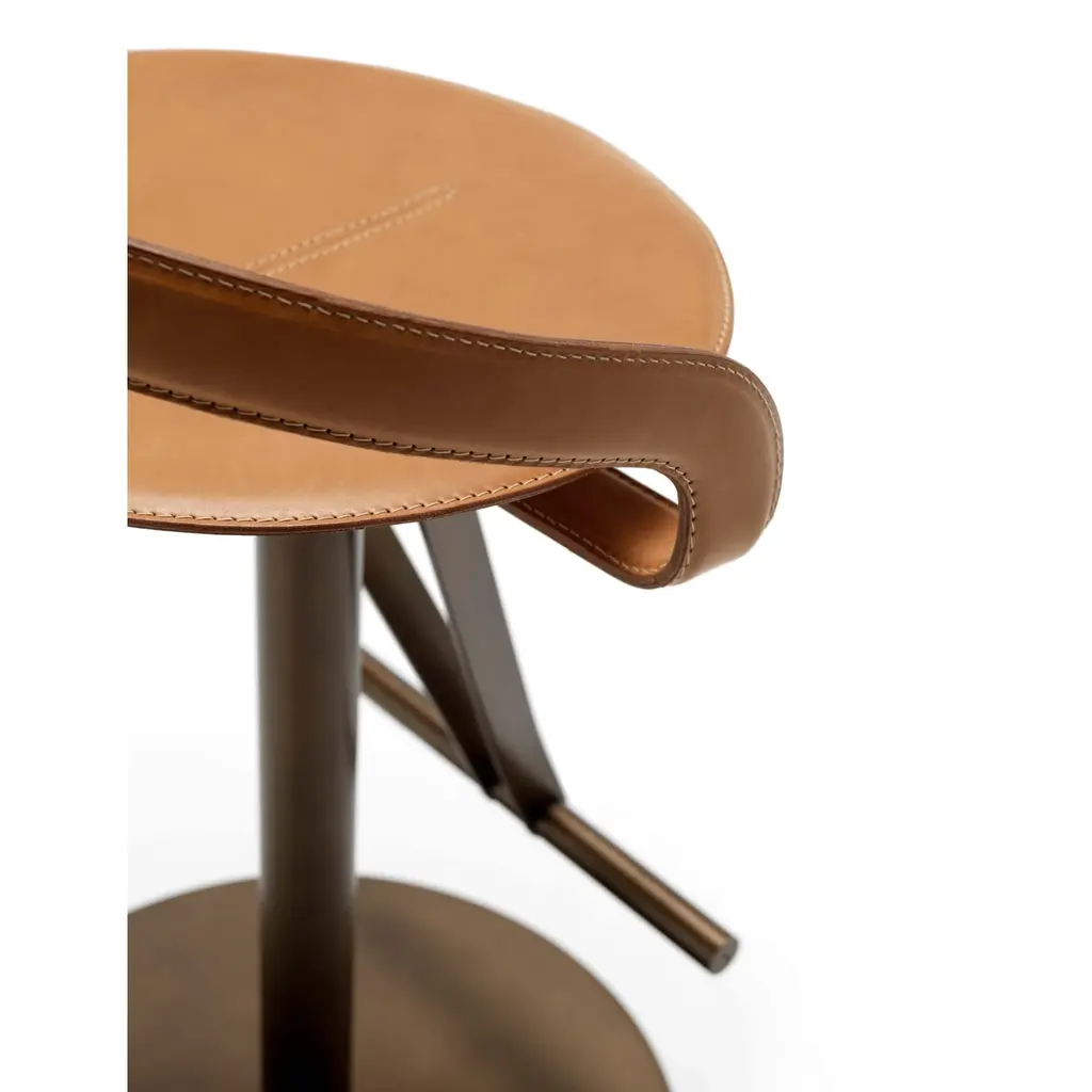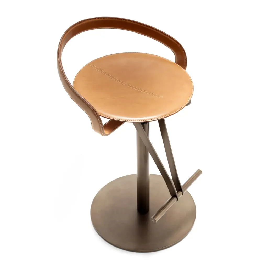 The Cayman Bar BT is a round-base stool with a footrest and a swivel steel frame available in various finishes, featuring a gas height adjustment. The seat is made of full-grain leather or high-quality leather, and the backrest can be in steel in various finishes or upholstered in either full-grain leather or high-quality leather. It is ideally suited for both bar settings and kitchens when style is a top priority.