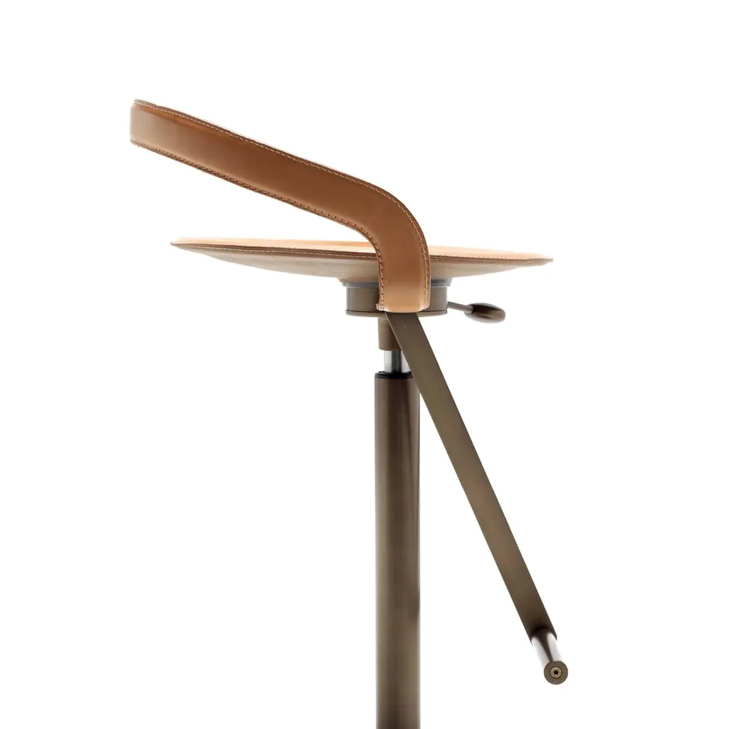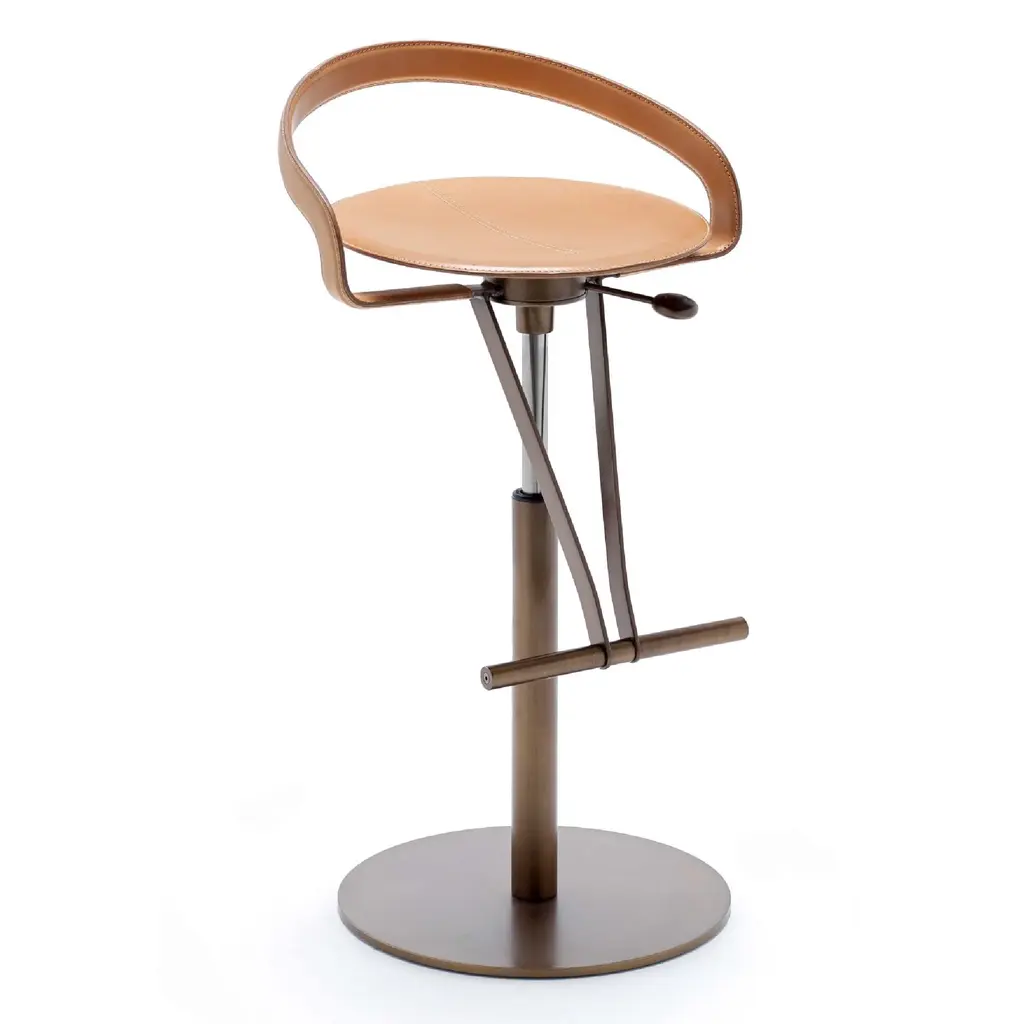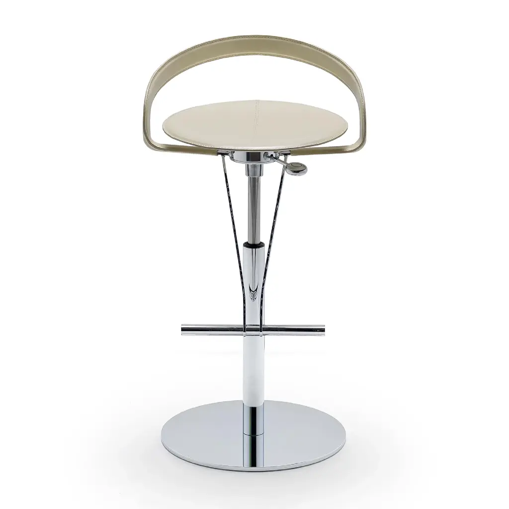 The Cayman Bar BT is a round-base stool with a footrest and a swivel steel frame available in various finishes, featuring a gas height adjustment. The seat is made of full-grain leather or high-quality leather, and the backrest can be in steel in various finishes or upholstered in either full-grain leather or high-quality leather. It is ideally suited for both bar settings and kitchens when style is a top priority.