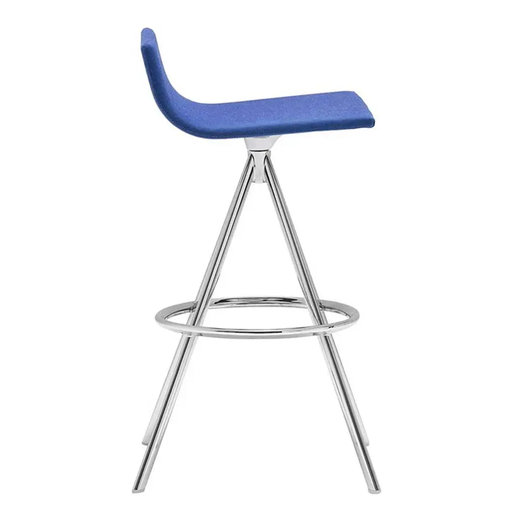Barstool with oak plywood shell and 4 legged steel swivel base finished in polished chrome, white or black. Fully upholstered shell. Optional Parallel upholstery. Lineal is a collection of stackable side chairs, armchairs, bar and counter height stools with upholstered seats made from curved plywood and metal or wood bases. The elegance of its lines allows the piece to be integrated into any environment. The designs forms have been reduced to the minimum elements, highlighting its formal synthesis. Its full meaning and function are clearly reflected in its name: a line that extends from its backrest to the seat and balanced by the high precision metal or wood base.