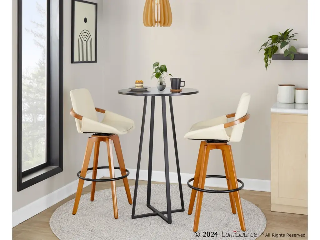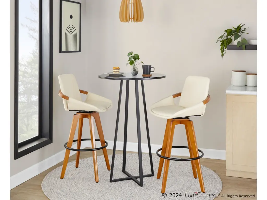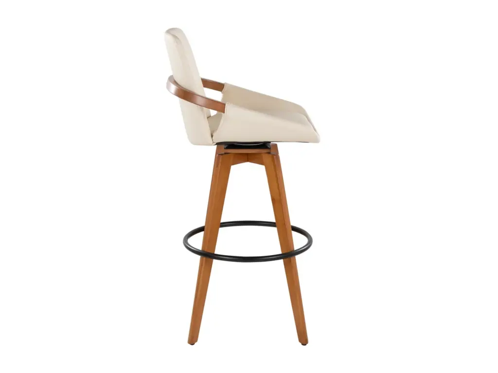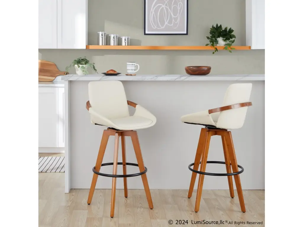 Mid-Century inspired, the Cosmo Fixed-Height Bar Stool by LumiSource combines style and comfort! A faux leather seat is accented by stylish walnut bamboo armrest and legs, with smooth swivel capability. Available in a variety of color combinations, choose the one that fits your space the best.