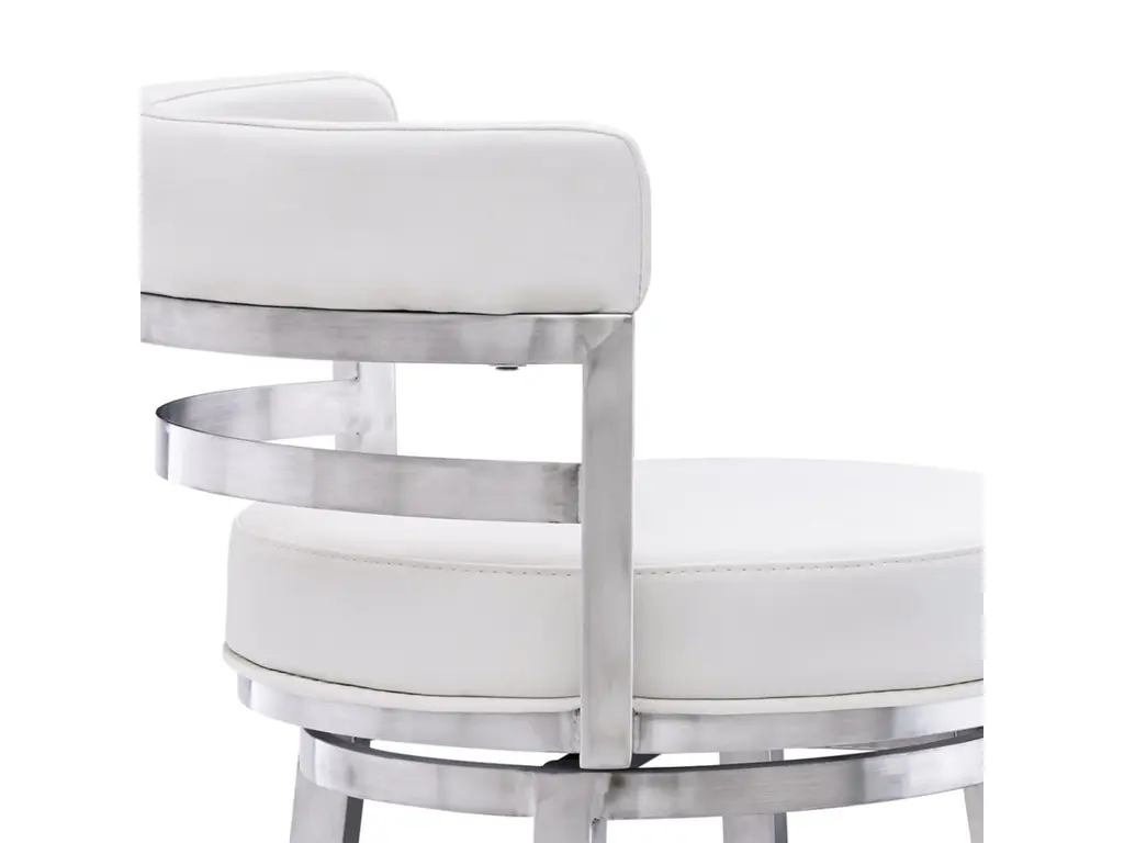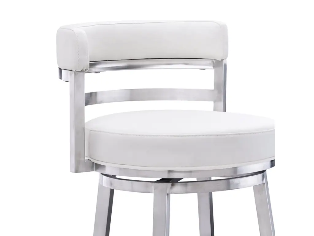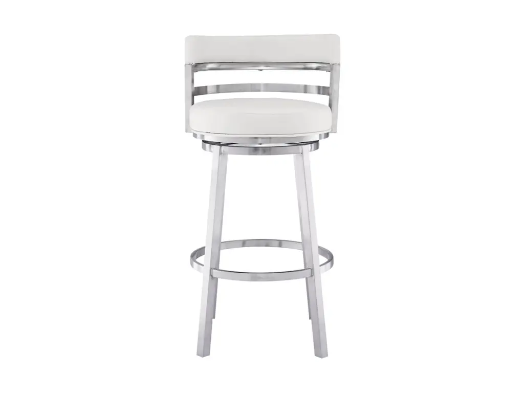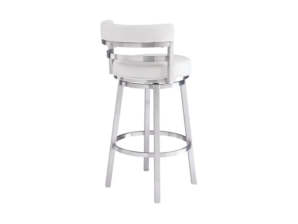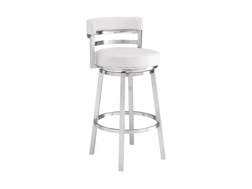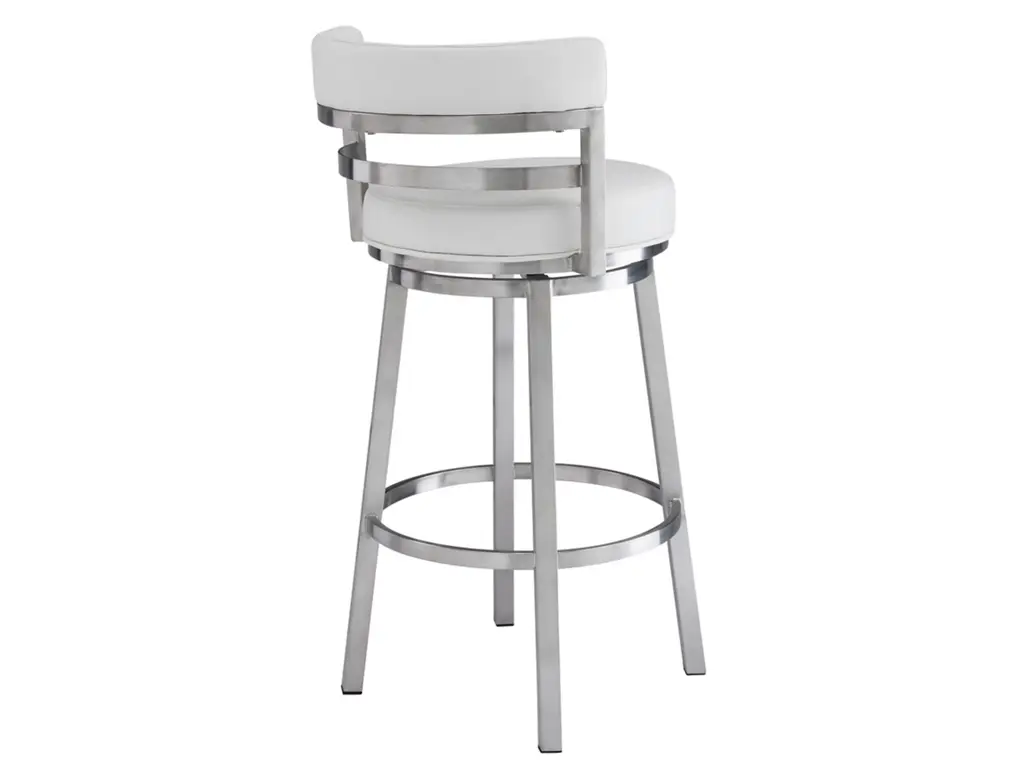 The Armen Living Madrid armless barstool features a unique aesthetic that is certain to work well in any modern household. The Madrid’s durable brushed stainless steel frame is accompanied beautifully by its white faux leather seat and back. The upholstered low back is rounded, providing the user with exceptional support while the 360 degree swivel seat allows for enhanced mobility. The Madrid’s contemporary straight leg design endows the barstool with a chic quality that is further accented by the inclusion of a round footrest. The Madrid’s legs are tipped with floor protectors, assuring that the barstool will not slip on or scratch hardwood or tile floors. The beautiful Madrid is available in two industry standard sizes; 26 inch counter and 30 inch bar height.