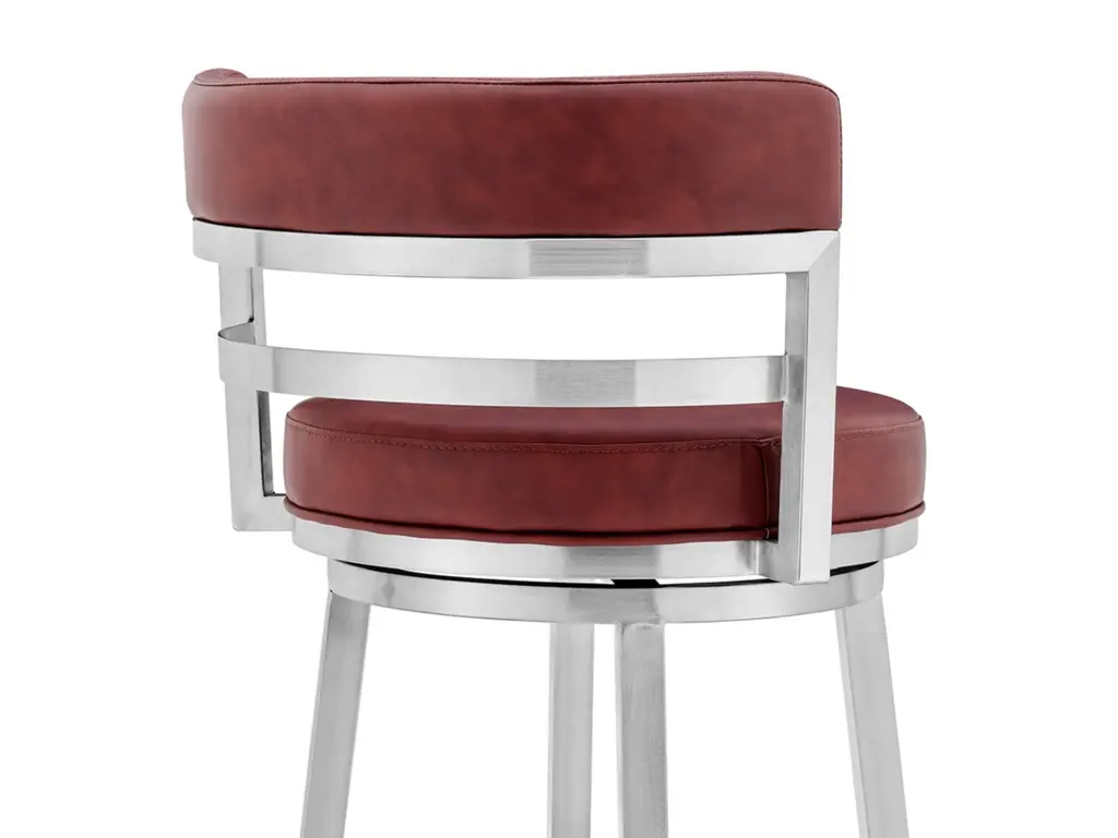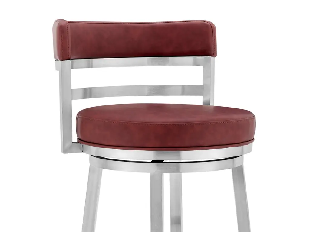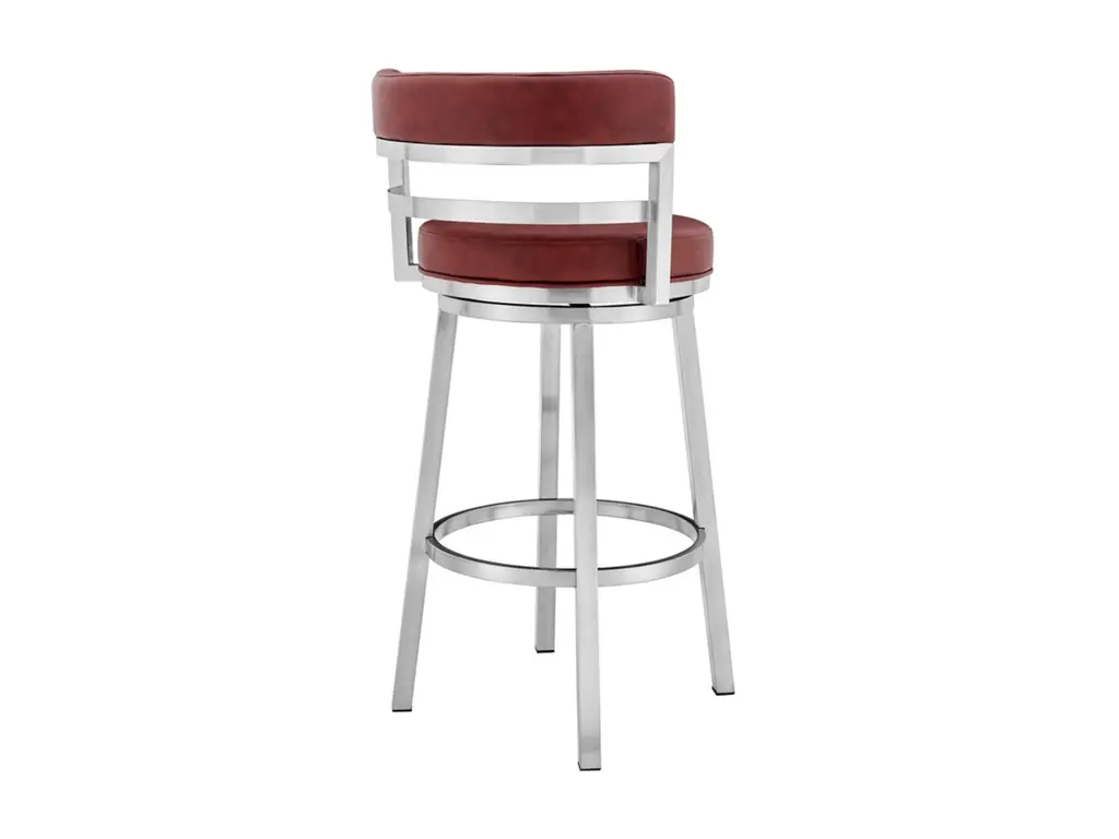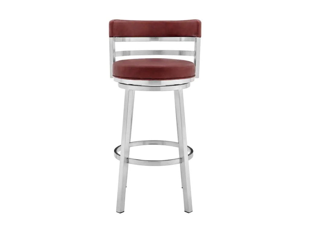 The Armen Living Madrid armless bar stool features a unique aesthetic that is certain to work well in any modern household. The Madrid’s durable brushed stainless-steel frame is accompanied beautifully by its faux leather seat and back. The upholstered low back is rounded, providing the user with exceptional support while the 360 degree swivel seat allows for enhanced mobility. The Madrid’s contemporary straight leg design endows the barstool with a chic quality that is further accented by the inclusion of a round footrest. The Madrid’s legs are tipped with floor protectors, assuring that the bar stool will not slip on or scratch hardwood or tile floors. The beautiful Madrid is available in two industry standard sizes: 26 inch counter and 30 inch bar height and comes with a stainless steel finish and your choice of grey, white, black, red, blue, or green faux leather upholstery.