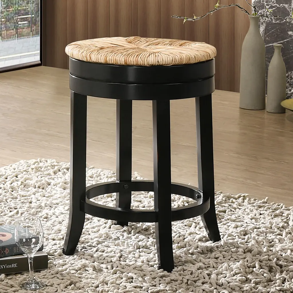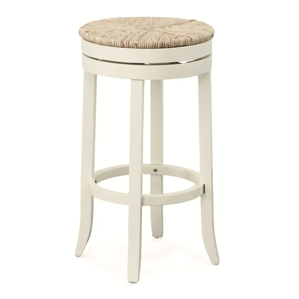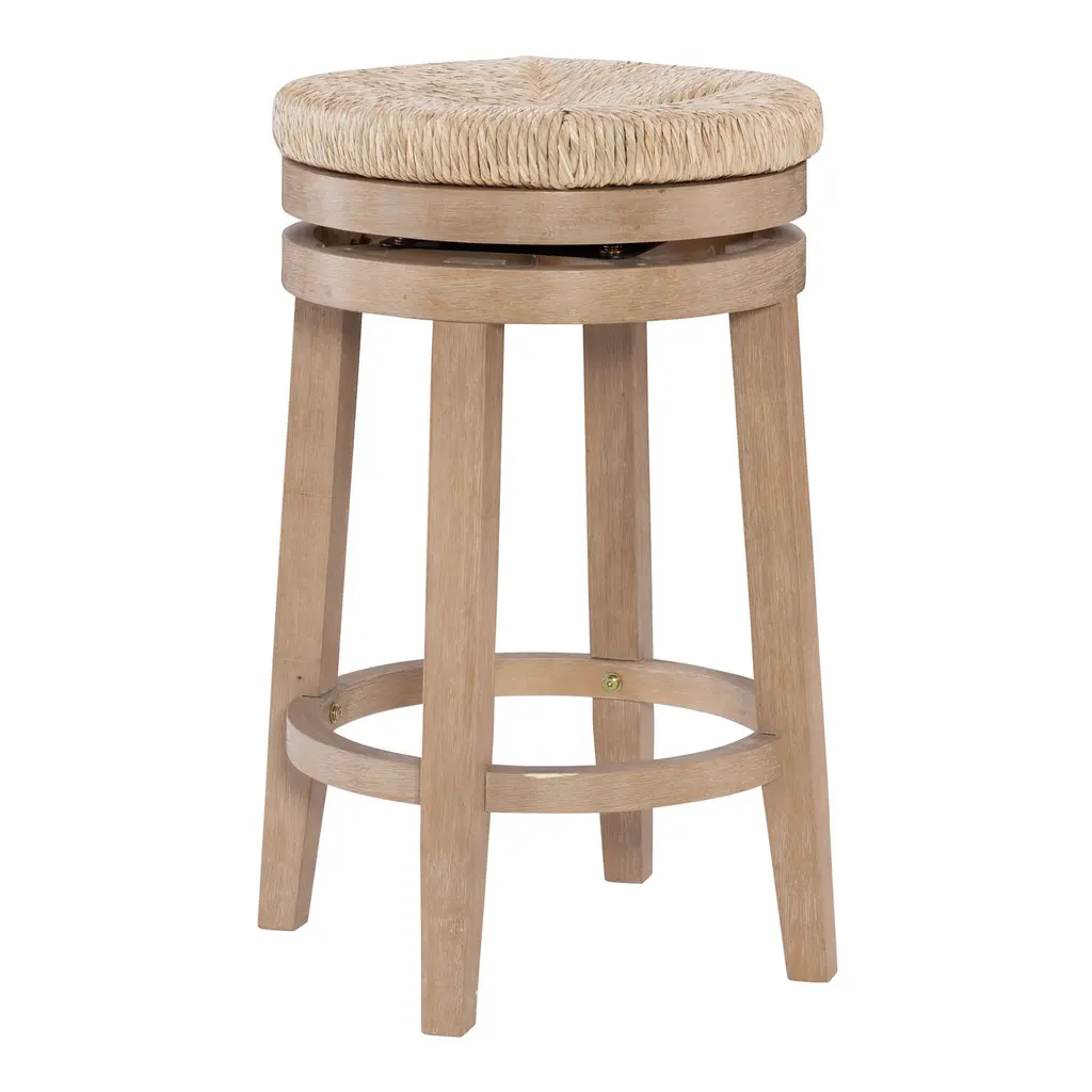 Crafted of solid wood in a selection of finishes, the Market barstool features a round rush seat that swivels through a full range of motion. This coastal bar chair contrasts the curving legs and circular stretcher of its sleek frame with textured natural fiber. A breezy addition to contemporary dining rooms with an effortless swivel, this backless stool saves space at your home bar and tucks under a pub table.