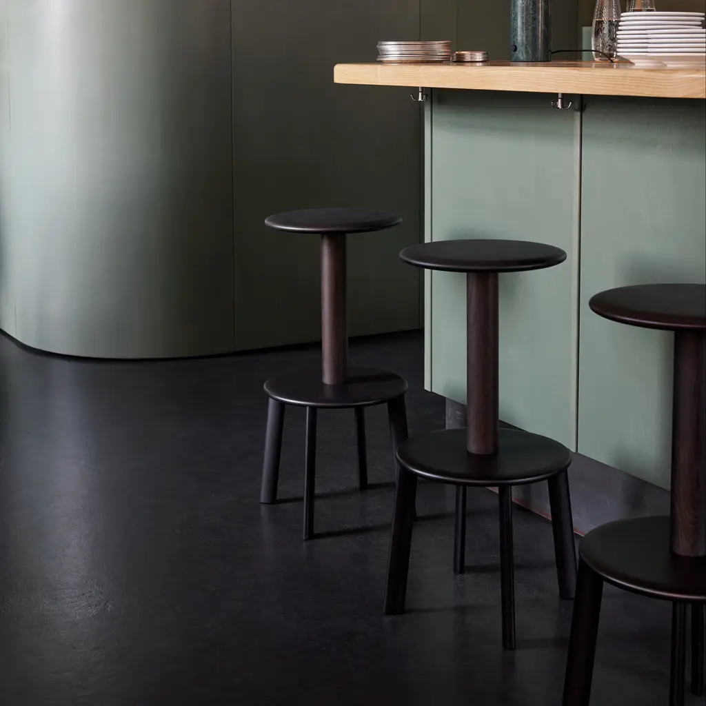 The Massif AV39 and AV40 stools stand out with their bold, totem-like design. Created by Anderssen & Voll, they come in bar and counter heights with a smooth swivel feature for practicality. Crafted from solid oak or walnut, the natural grain of the wood is highlighted through premium treatments, giving the stools a warm and tactile presence. The sleek lines and compact form make them well-suited for a variety of spaces, including kitchen islands or bar settings. Metal accents combined with natural wood bring a balanced and grounded look to the overall design.