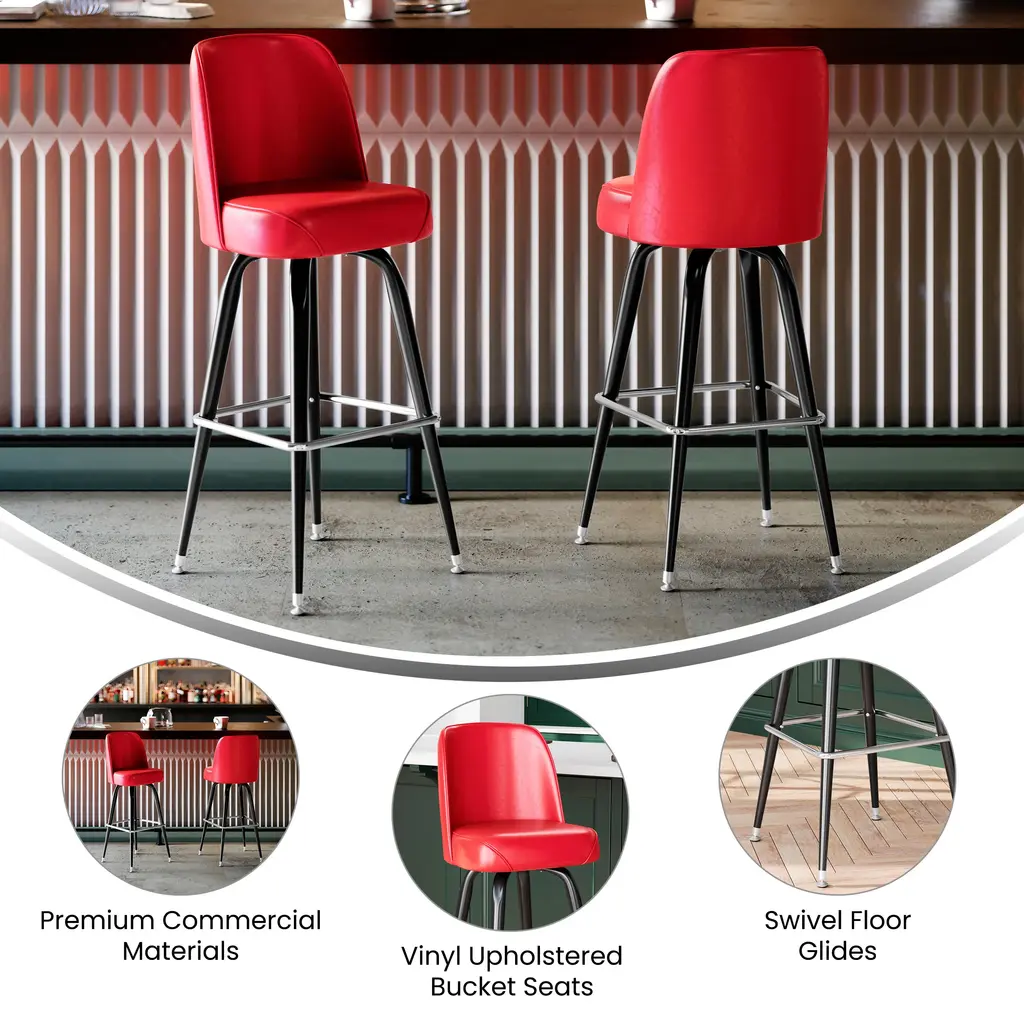 Commercial furniture needs to be both durable and low maintenance so metal barstools are a popular choice for furnishing restaurants, pool halls, lounges, bars and other high traffic establishments. This stool is easy to clean, which is an important aspect when it comes to a business. Add seating to your home bar or furnish the bar in your hotel with these durable upholstered stools. The contoured bucket seat envelopes the user in comfort. The tubular footrest not only supports your feet, but acts as additional reinforcement to help secure the legs. The swivel floor glides help protect your floors and ensure smooth gliding. Use this bar height stool in your kitchen, dining room or home bar and give your decor a fresh look.