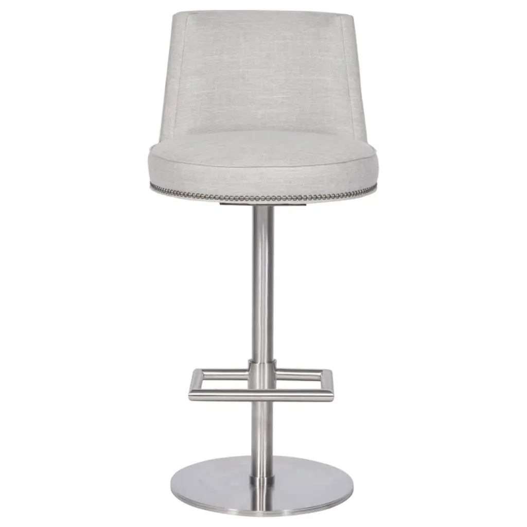 The stool is part of the Michael Weiss collection. Michael Weiss has proven to be as enduring as the classic furniture he designs. His signature style, defined by clean lines and architectural simplicity, expresses an acute awareness of the evolution of design. This bar stool features nail head detailing, a return swivel, and a brushed nickel base.
