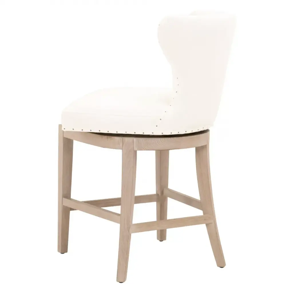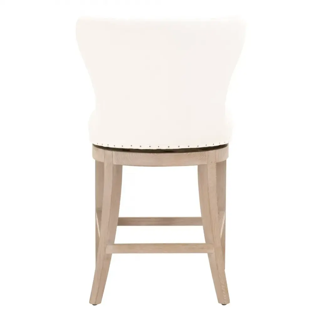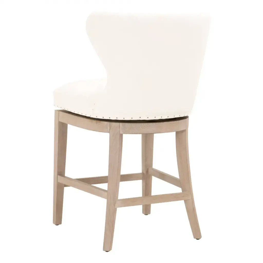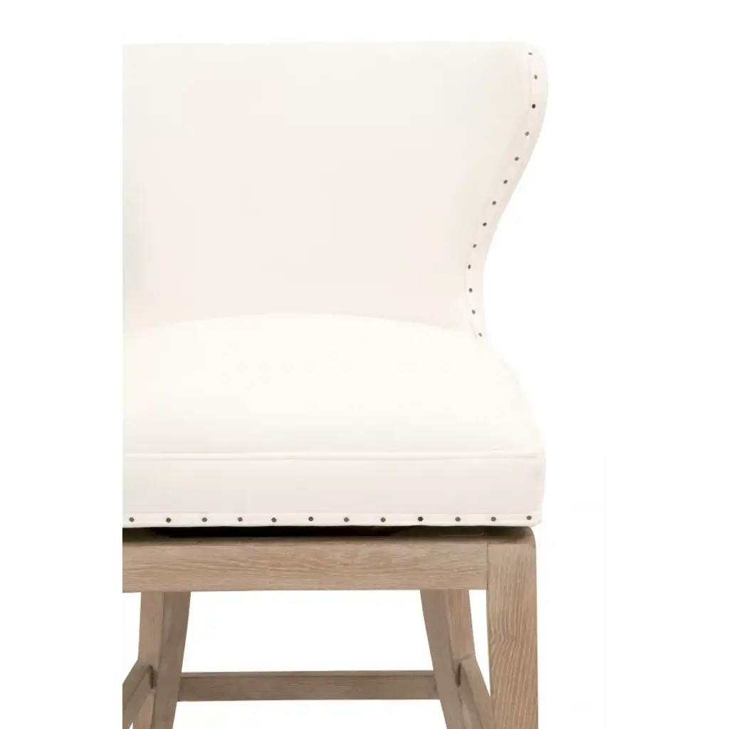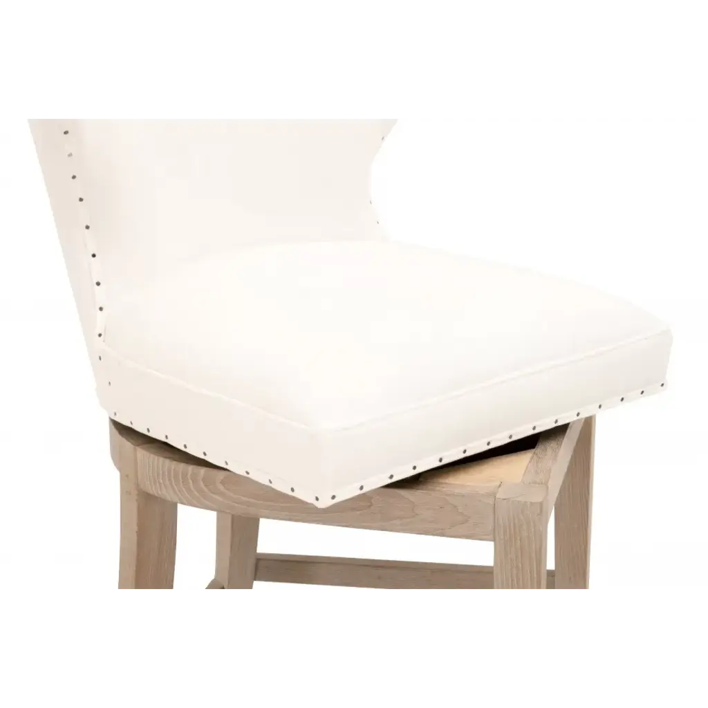 It’s all the fine details that make this transitional counter stool so beautiful. From the white upholstery, to the 180-degree swivel design, to the black nail tack detailing, this stool has many features that make it unique. The base of the stool is constructed with solid ash wood with gray undertones and includes leg stretchers for extra support. The stunning white upholstery is made of a high-performance fabric that makes cleaning easy and manageable. The white fabric and light wood make this stool an ideal fit with many color schemes and interior styles. Furnish your kitchen, bar or dining room with this French country inspired counter stool.