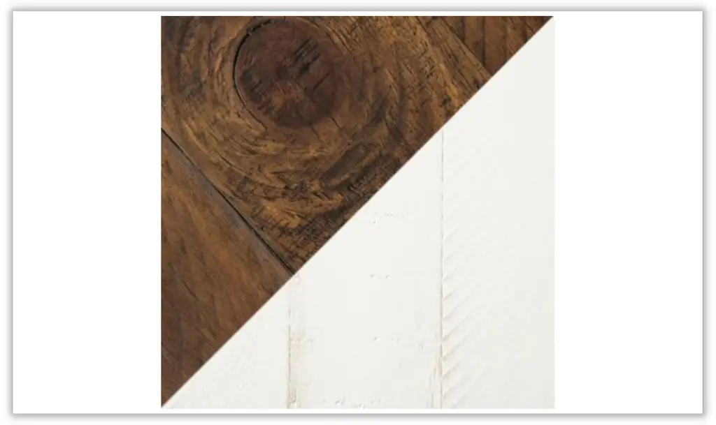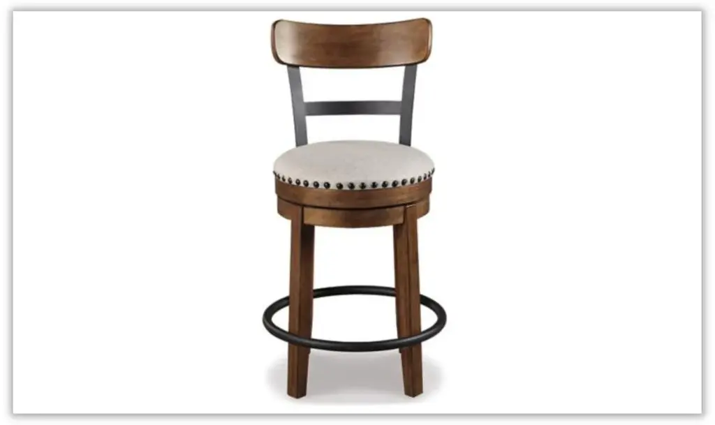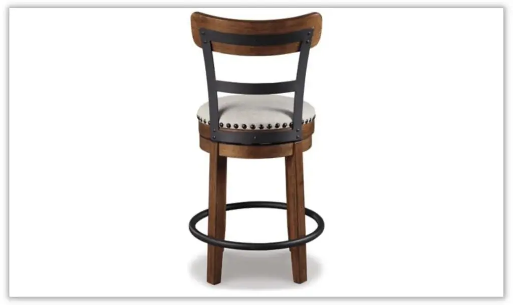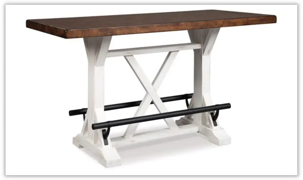 Experience the charm of rustic farmhouse living with the Valebeck counter-height wooden dining set in brown. Crafted from pine wood, veneers, and engineered wood, this 5-piece set exudes a timeless appeal. The two-tone finish features a brown tabletop paired with a distressed vintage white base, creating a striking contrast. Black metal footrests add a distinctive twist, blending rustic and industrial elements seamlessly. The set includes a counter-height table that seats up to 4, making it perfect for intimate gatherings. The cushioned bar stool enhances the rustic-industrial style with its linen-colored polyester upholstery and nailhead trim detail. Enjoy the flexibility of a smooth 360-degree swivel for added comfort. Bring warmth and character to your dining space with the Valebeck Counter Height Dining Set – where farmhouse charm meets functional design. Assembly is required to complete the transformation of your space into a welcoming haven.Note:5 Pieces Include: Counter Height Dining Table + 4 Bar Stools