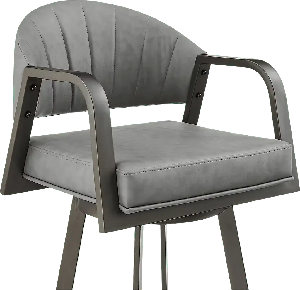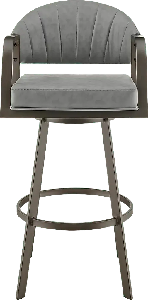 Give a sleek and stylish update to your home with the Nightwater gray counter height stool. Combining modern and industrial notes, this stool is ready to impress with its timeless charm and comfort. The sturdy, iron arms and built-in circular footrest demonstrate how this stool was designed with comfort in mind. The curved backrest provides support for a long, comfortable stay. The channeling detail and luxurious faux leather upholstery lend chic and modern appeal. This polyurethane faux leather does not crack easily and is water, fade, and stain-resistant to offer easy maintenance and a longer lifespan for your new favorite piece of furniture. This stool includes a smooth 360-degree swivel function that allows you to engage with everyone around you while being able to navigate compact spaces. Customer assembly is required.