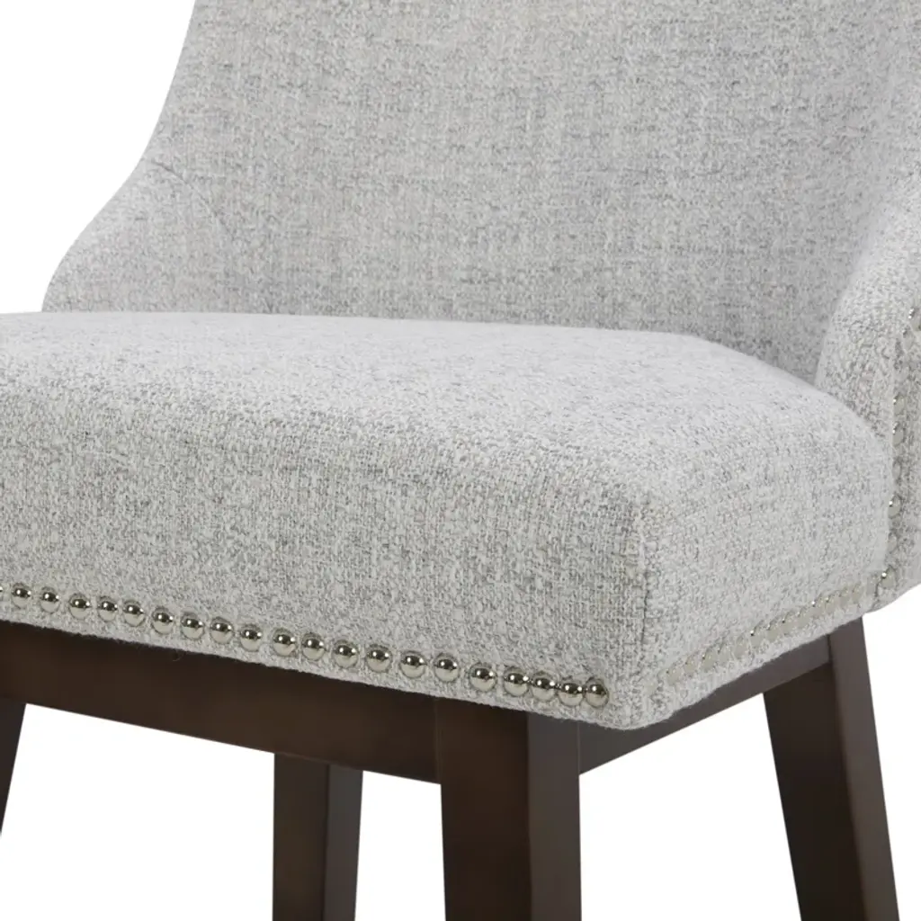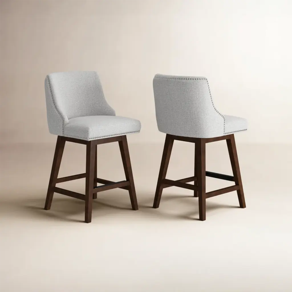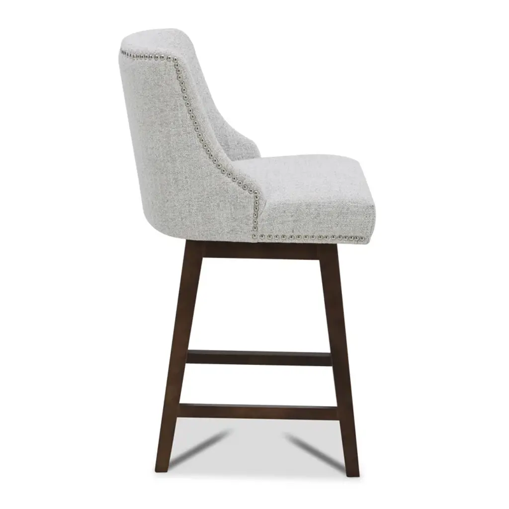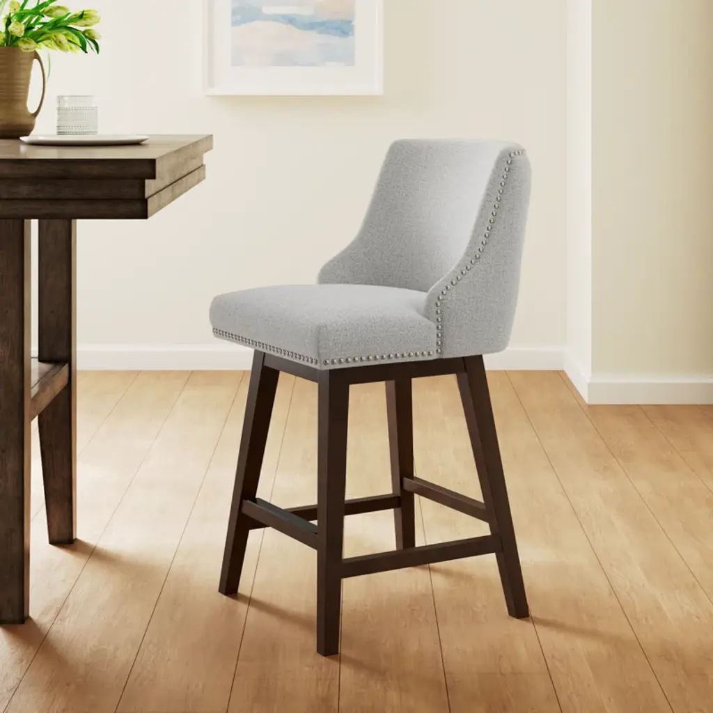This transitional bar stool adds classic sophistication to your home bar or kitchen counter. Crafted from solid pine wood in a walnut finish, it features a full-back design and a 360° swivel seat upholstered in neutral cream fabric. The stool's vertical slat-back design gives it an elegant appearance, while nailhead trim along the seat adds a touch of refinement. Its sturdy construction supports up to 300 lbs., and it's equipped with plastic glides to protect your floors.