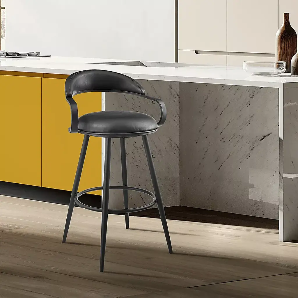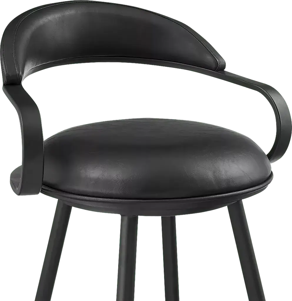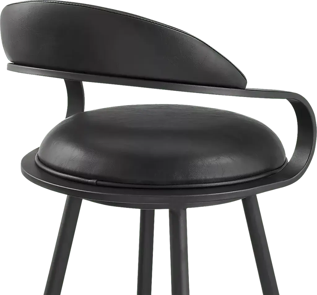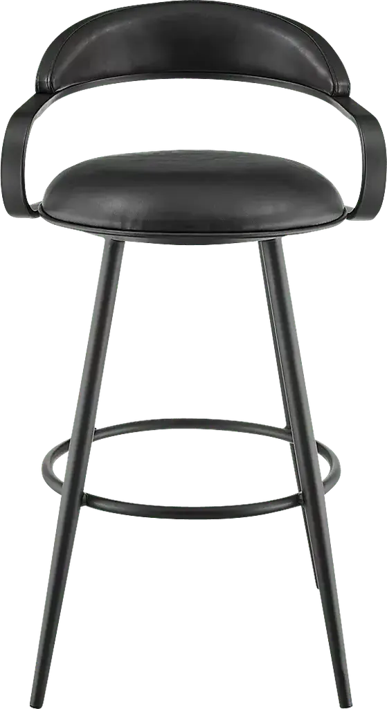 Revitalize any space with the sleek and inviting charm of the Orcone black counter height stool. The refined profile and sleek curves offer instant appeal and comfort. With a floating back and curved arms, this stool is ready to make a chic statement. Its hugging back and round seat are covered in easy-to-maintain faux leather to offer lasting style and comfort. The slim arms flow seamlessly into the small but comfy backrest. It lends a dynamic seating solution for your kitchen island, pub table, home bar, or adjustable desk. The built-in, circular footrest relieves pressure on your legs and back to offer a more comfortable seating experience. This stool includes a smooth, 360-degree swivel function, which allows you to turn and change directions with ease to promote smooth-flowing conversations in any arrangement. Customer assembly is required.