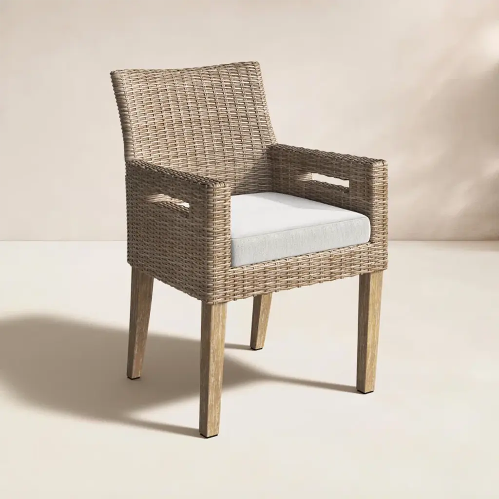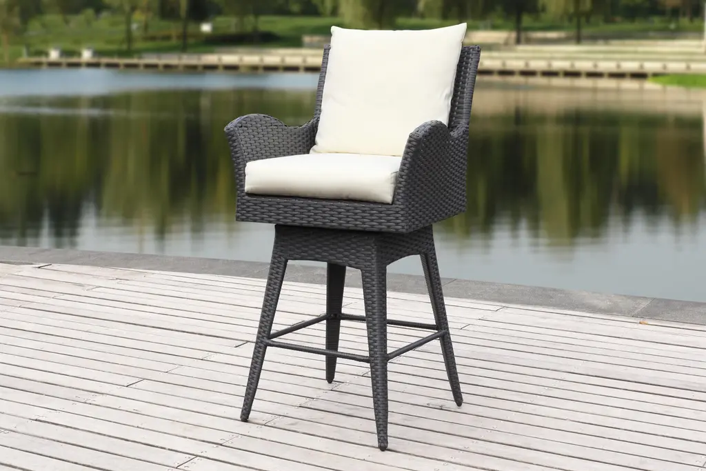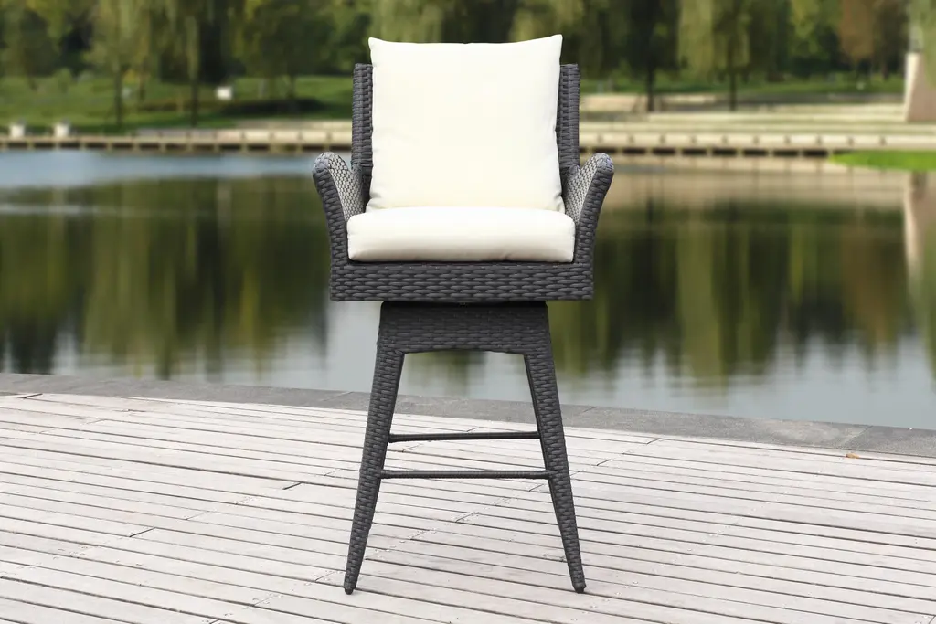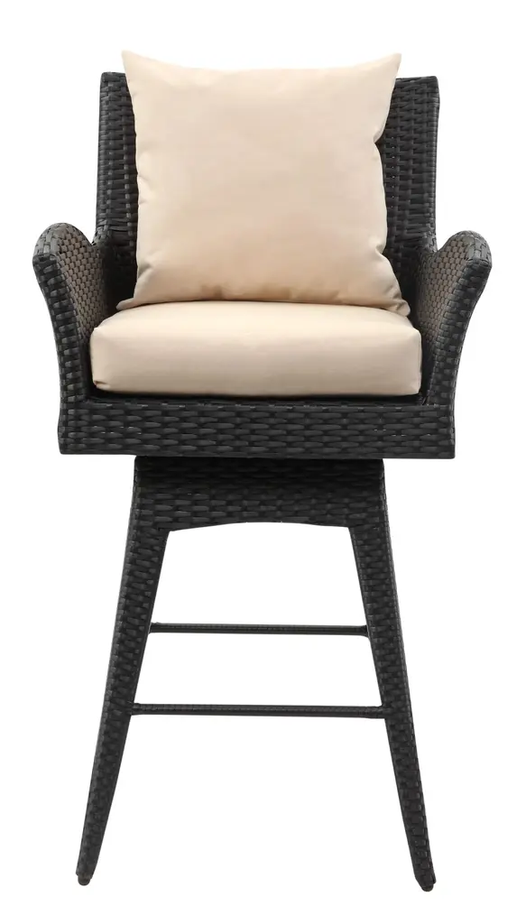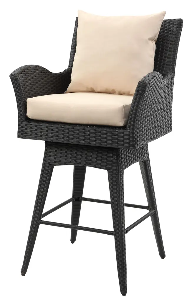 Versatile and stylish, this outdoor wicker swivel counter stool with arms is a must-have for entertaining. Perfect for cocktails or canapes, guests love taking a spin on it's plush upholstered seat. Designers adore it's chic black construction and beige cushion. Store outdoor furniture indoors or cover well when not in use. Remove wooden furniture from standing water. Dust regularly with small brush or vacuum. Spills should be taken care of immediately before they harden or stain with a slightly dampened sponge. Do not use bleach solutions. Some assembly required.