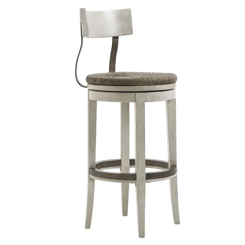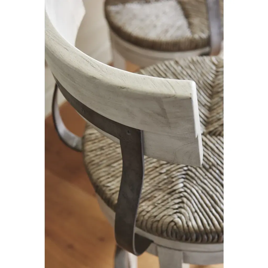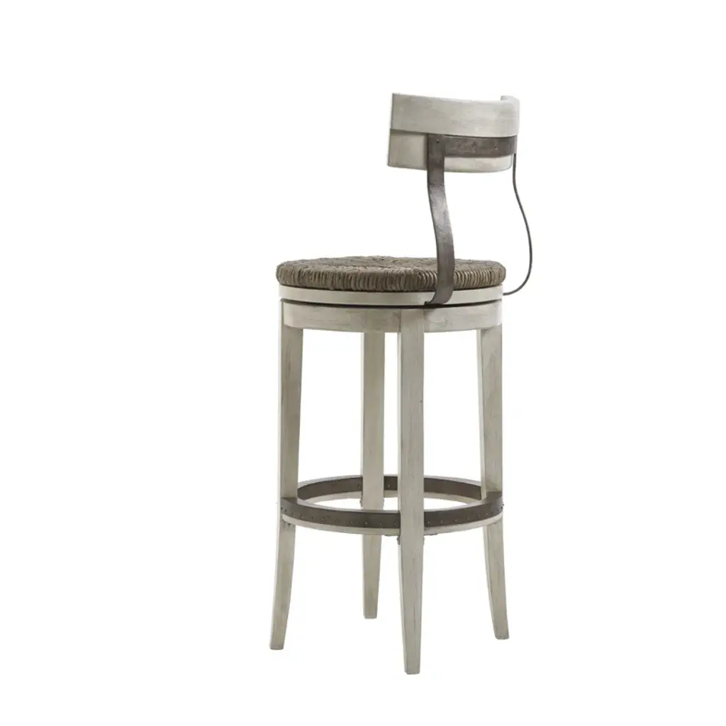 Casual, yet sophisticated, these swivel counter and bar stools feature a hand-woven rush seat and shaped metal back support.