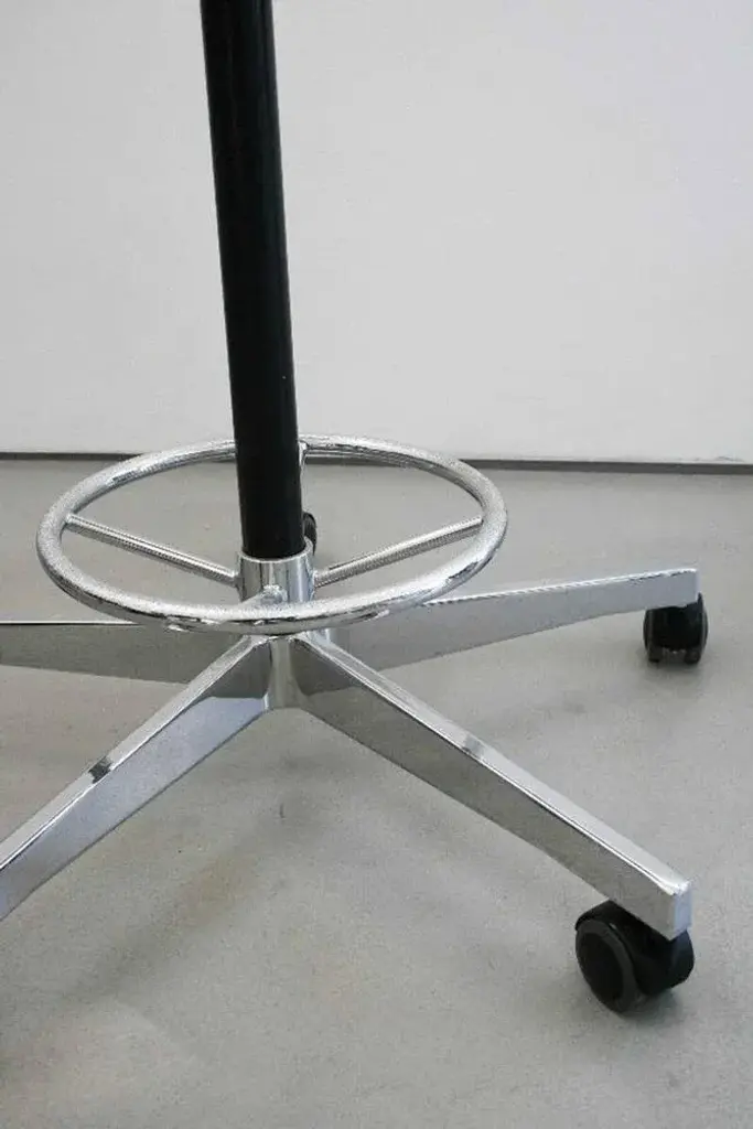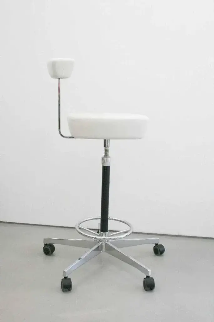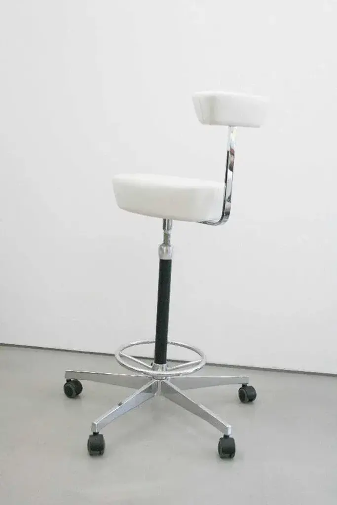 Perch Rhinister Stock Authority Stools. Last braked rollers. Cover leather white. the pictures. This piece has an attribution mark, I am sure that it is completely authentic and take full responsibility for any authenticity issues arising from misattribution