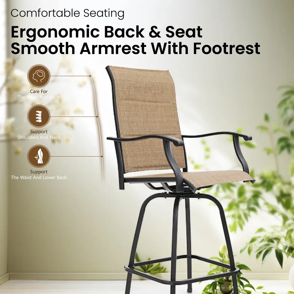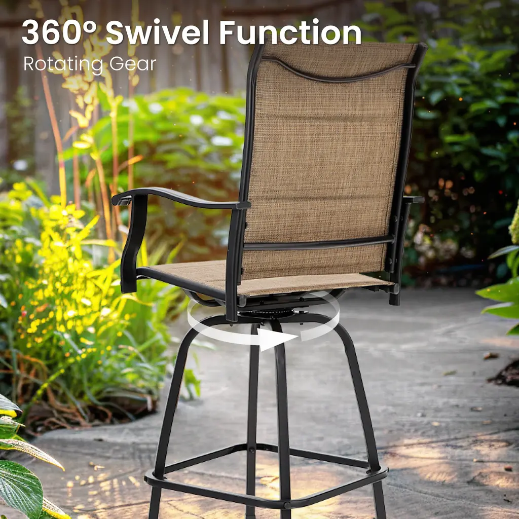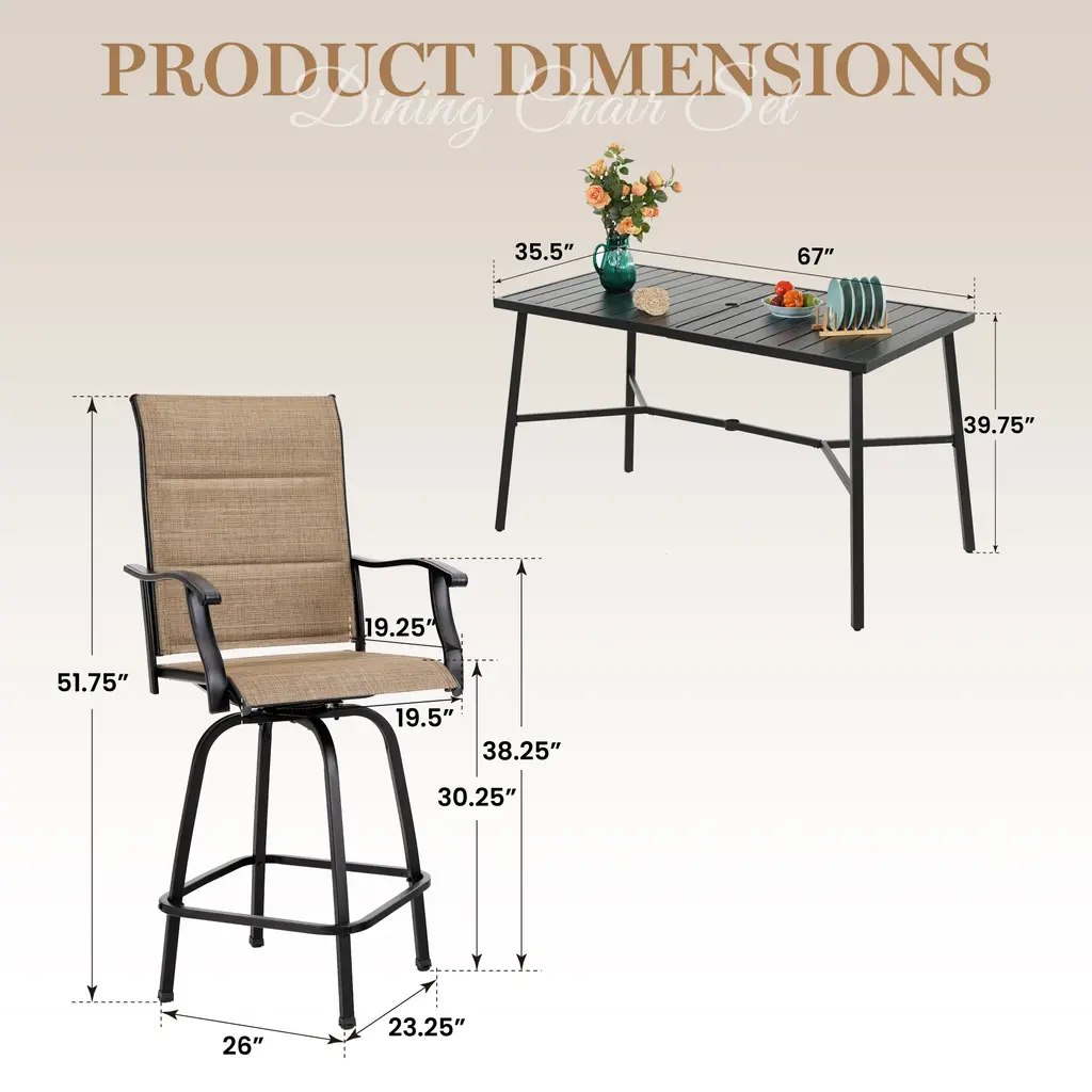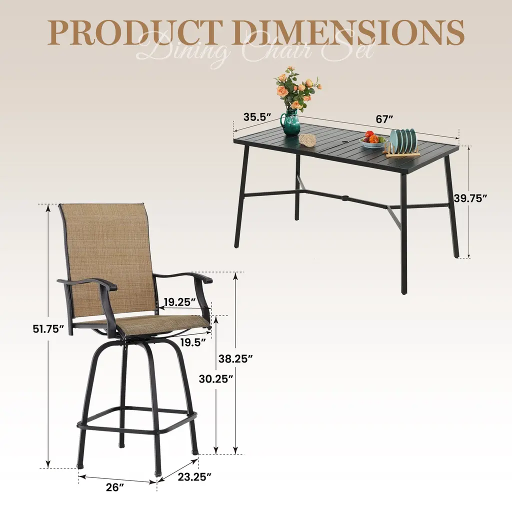 The durable, anti-rust metal frame supports up to 300 lbs. Breathable Textilene sling fabric keeps you cool in summer. Comfortable outdoor swivel barstools swivel smoothly, with curved arms and well-ventilated seats for long-lasting comfort. Whether you prefer the sling fabric or padded versions, these outdoor bar stools with backs are perfect for relaxing on your patio bar and stools setup. Features a 1.57" diameter umbrella hole and fixing holes to keep them in place on the tabletop—ideal for your outdoor patio bar stools collection.
