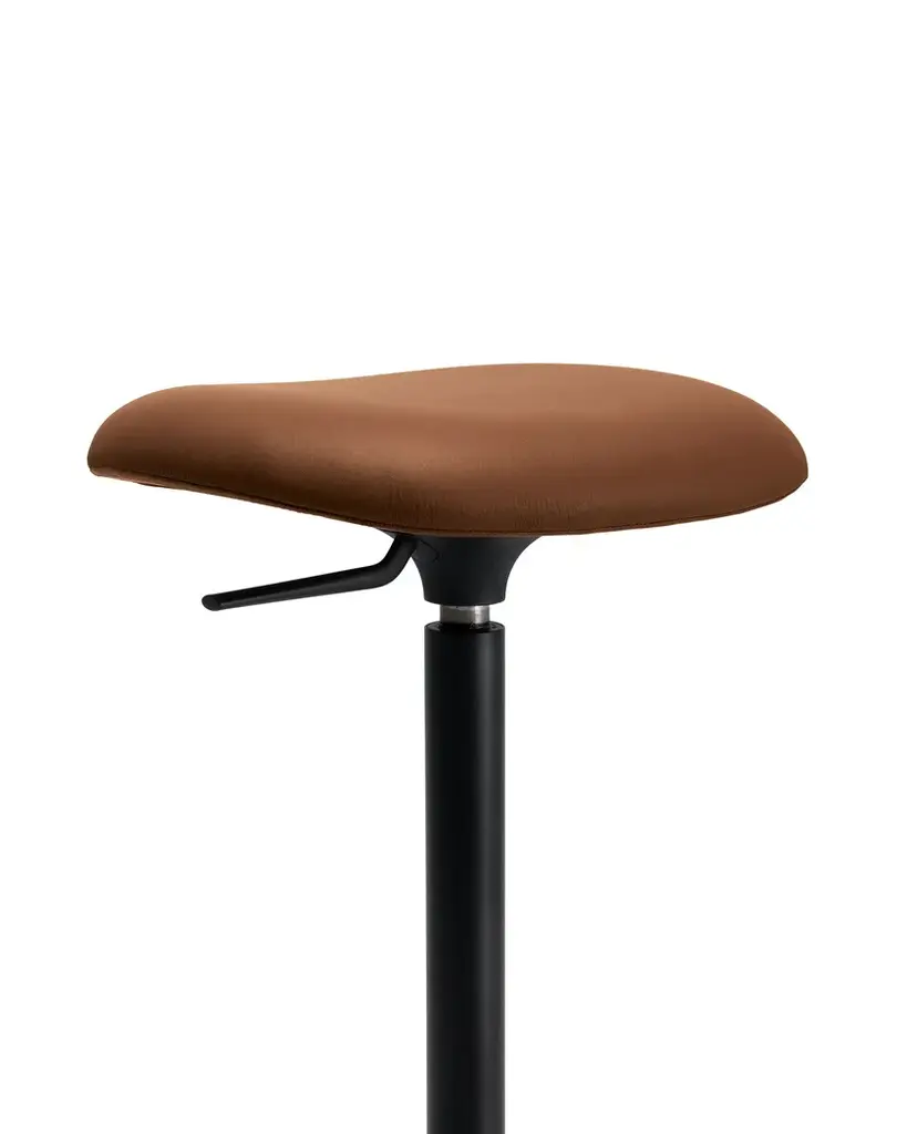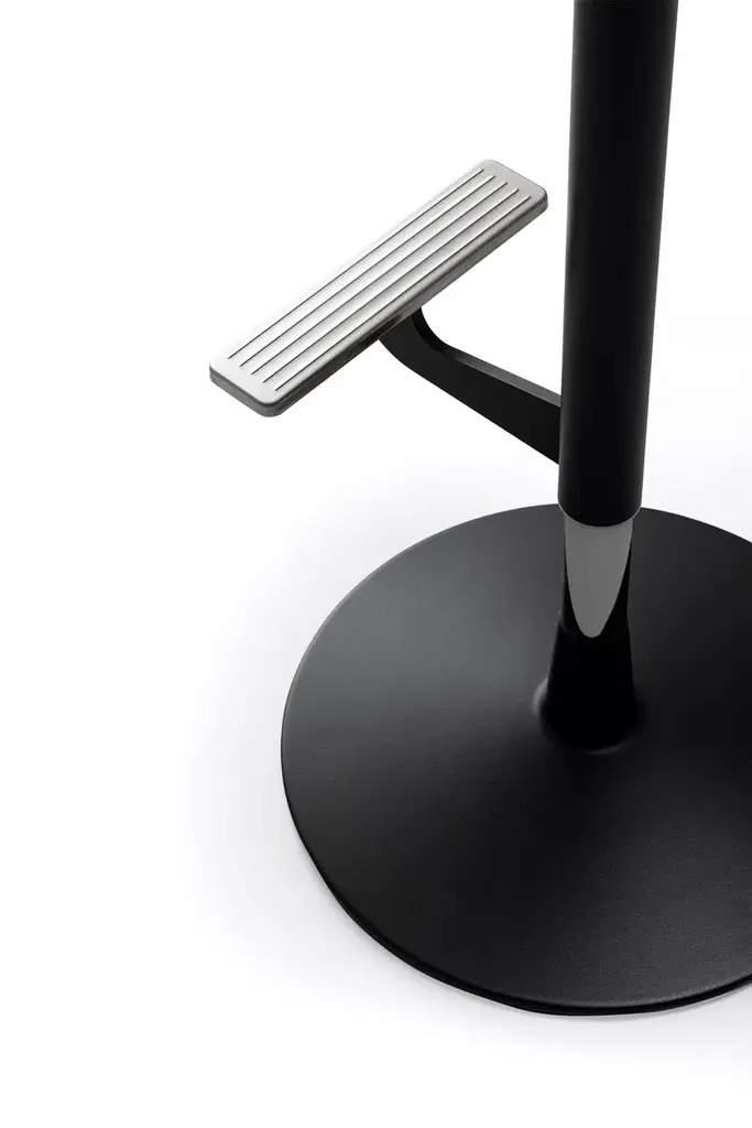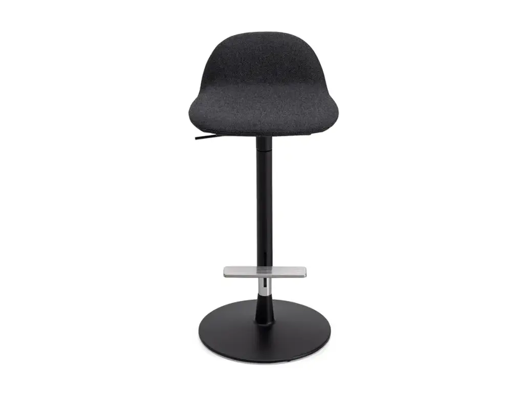 Pilat is a swivel stool that can be adjusted in height by means of a gas-lift cylinder. It features simple lines and timeless shapes: the disc-shaped base supports the central element and a seat with rounded contours, thus ensuring an ergonomic seat despite its limited depth. The seat is available in two versions: one with a low backrest in multilayer wood or padded and upholstered, the other, without a backrest, has a padded and upholstered seat.
