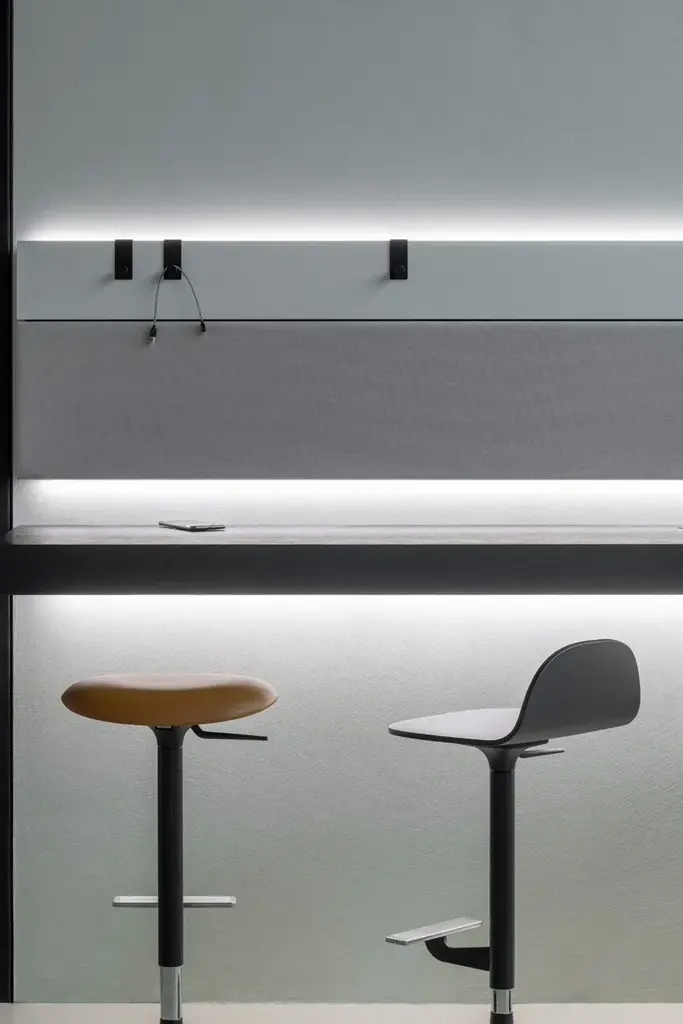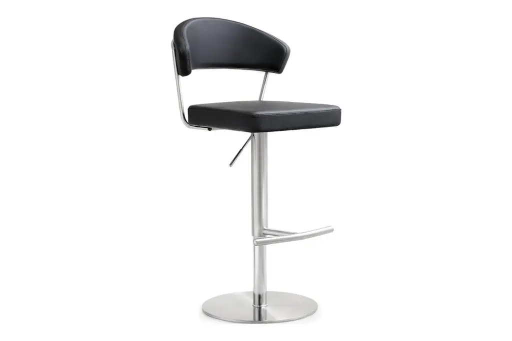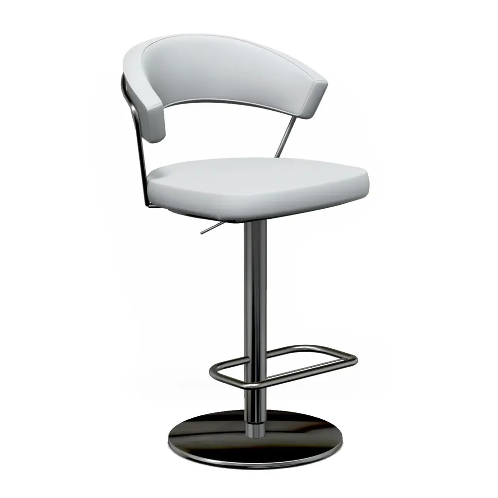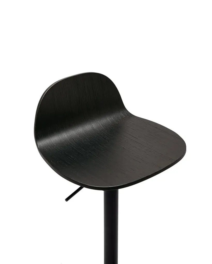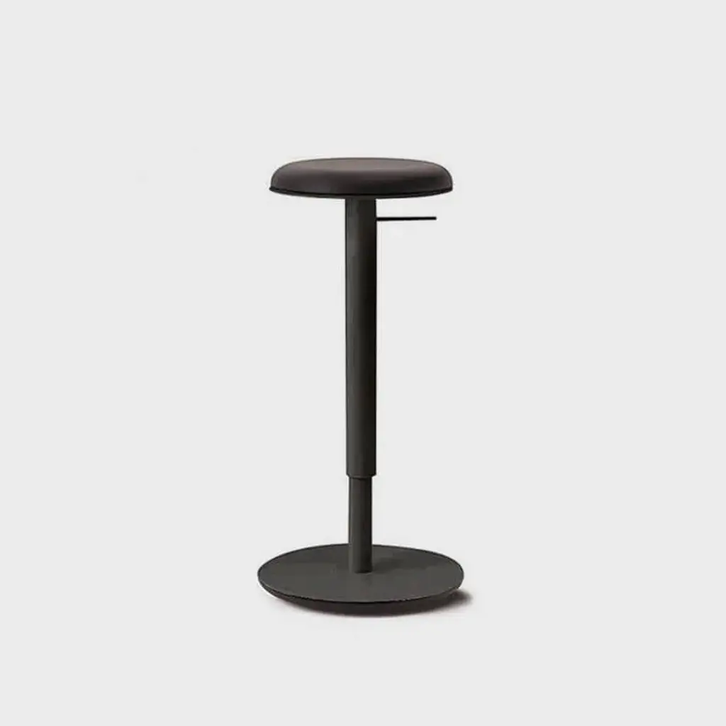 Pilat is a swivel stool that can be adjusted in height by means of a gas-lift cylinder. It features simple lines and timeless shapes: the disc-shaped base supports the central element and a seat with rounded contours, thus ensuring an ergonomic seat despite its limited depth. The seat is available in two versions: one with a low backrest in multilayer wood or padded and upholstered, the other, without a backrest, has a padded and upholstered seat.