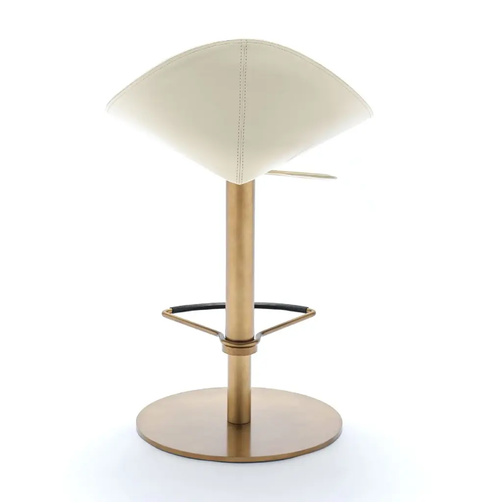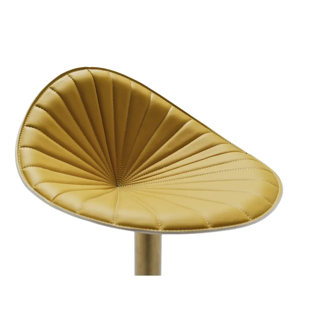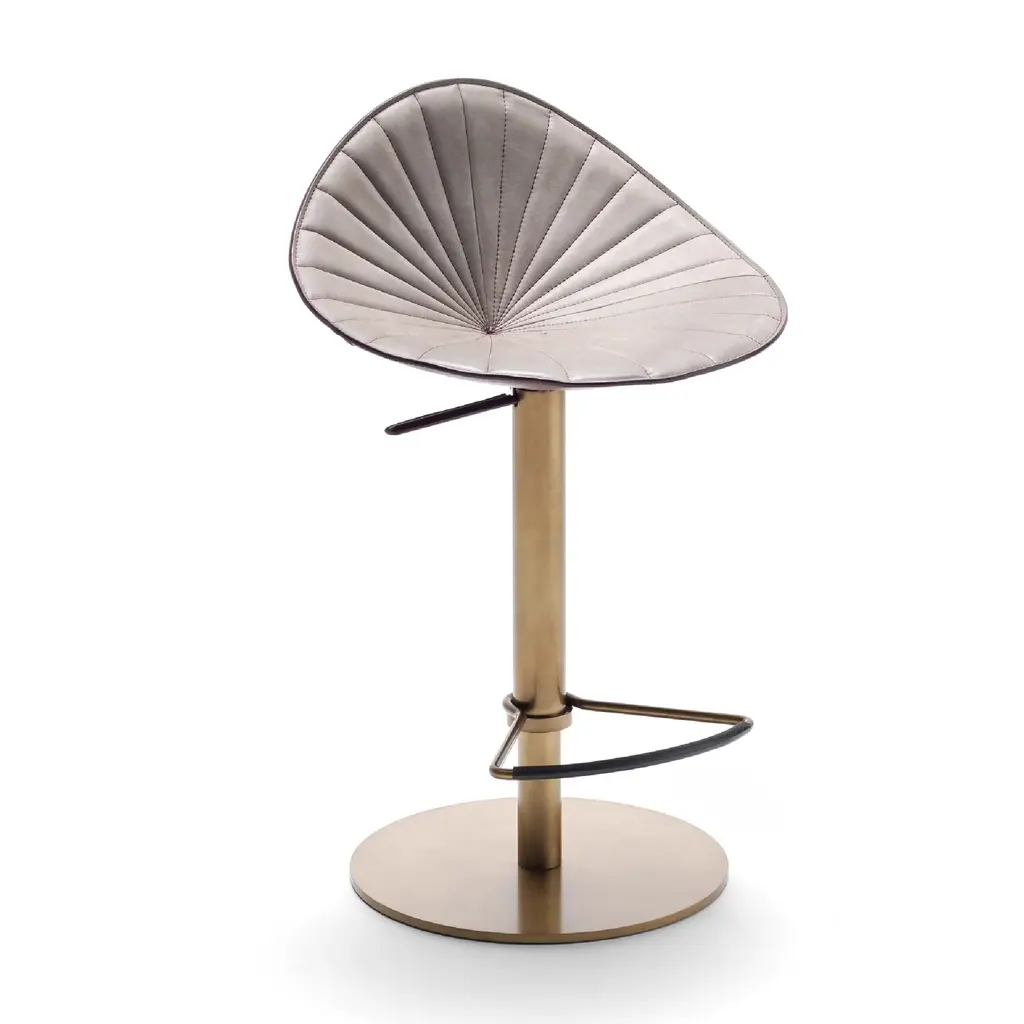 The Fiorile Bar Plisse BT is a round stool that swivels and features adjustable height, with a structure made of steel in various finishes. The shell is crafted from slightly padded Hirek® and upholstered internally in pleated premium leather and externally in contrasting full-grain leather or entirely in premium leather. It includes a footrest and gas height adjustment. The height adjustment lever is covered in full-grain leather, showcasing elegance through its design and skilled craftsmanship.