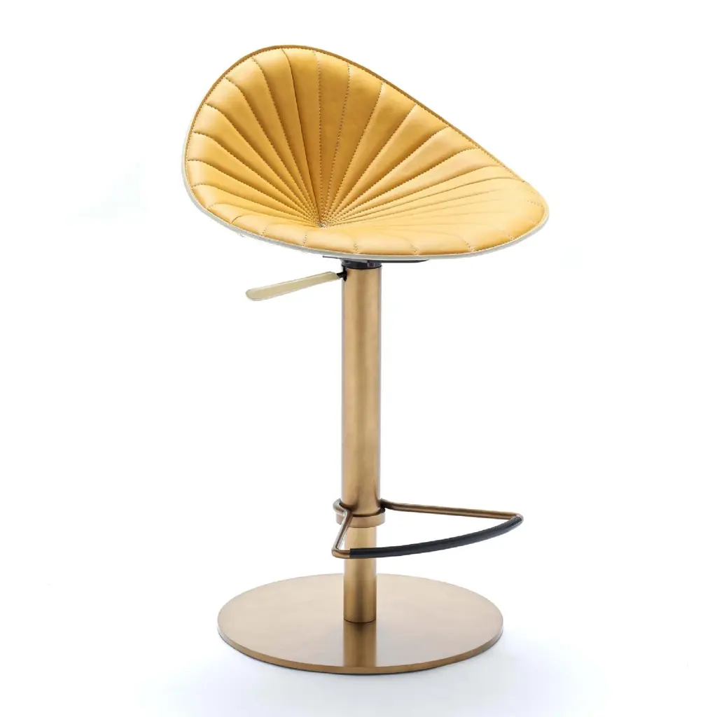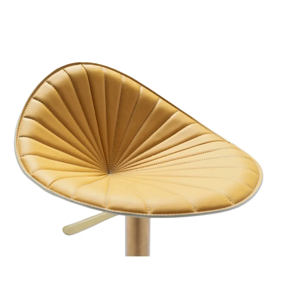 The Fiorile Bar Plisse BT is a round stool that swivels and features adjustable height, with a structure made of steel in various finishes. The shell is crafted from slightly padded Hirek® and upholstered internally in pleated premium leather and externally in contrasting full-grain leather or entirely in premium leather. It includes a footrest and gas height adjustment. The height adjustment lever is covered in full-grain leather, showcasing elegance through its design and skilled craftsmanship.