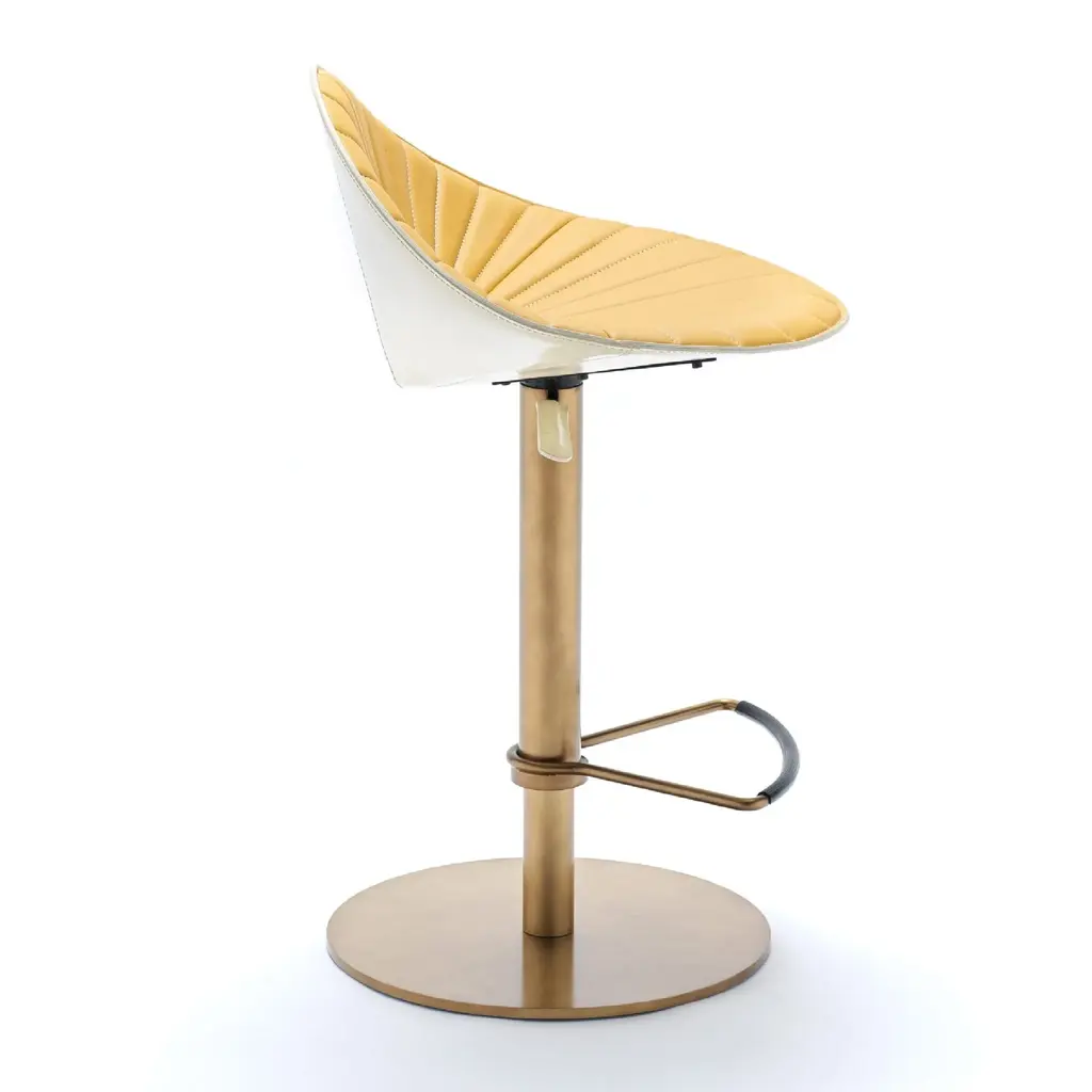 The Fiorile Bar Plisse BT is a round stool that swivels and features adjustable height, with a structure made of steel in various finishes. The shell is crafted from slightly padded Hirek® and upholstered internally in pleated premium leather and externally in contrasting full-grain leather or entirely in premium leather. It includes a footrest and gas height adjustment. The height adjustment lever is covered in full-grain leather, showcasing elegance through its design and skilled craftsmanship.