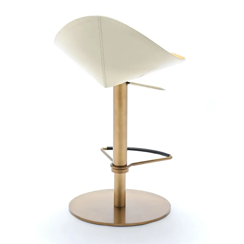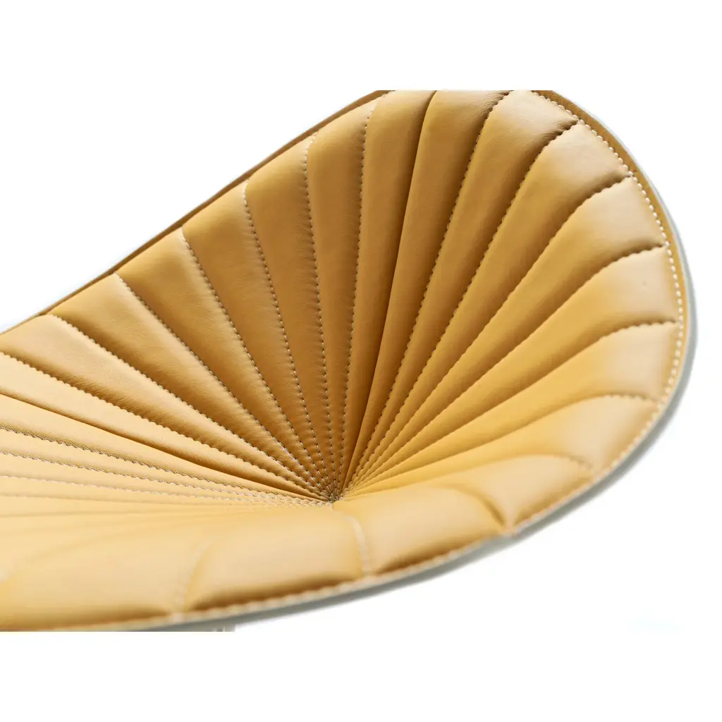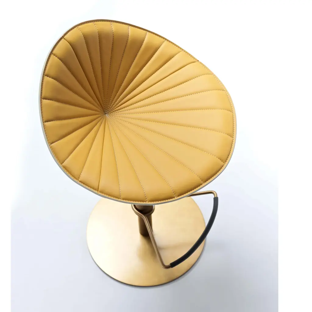 The Fiorile Bar Plisse BT is a round stool that swivels and features adjustable height, with a structure made of steel in various finishes. The shell is crafted from slightly padded Hirek® and upholstered internally in pleated premium leather and externally in contrasting full-grain leather or entirely in premium leather. It includes a footrest and gas height adjustment. The height adjustment lever is covered in full-grain leather, showcasing elegance through its design and skilled craftsmanship.