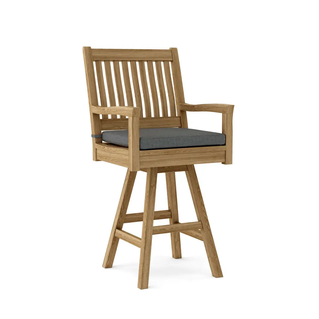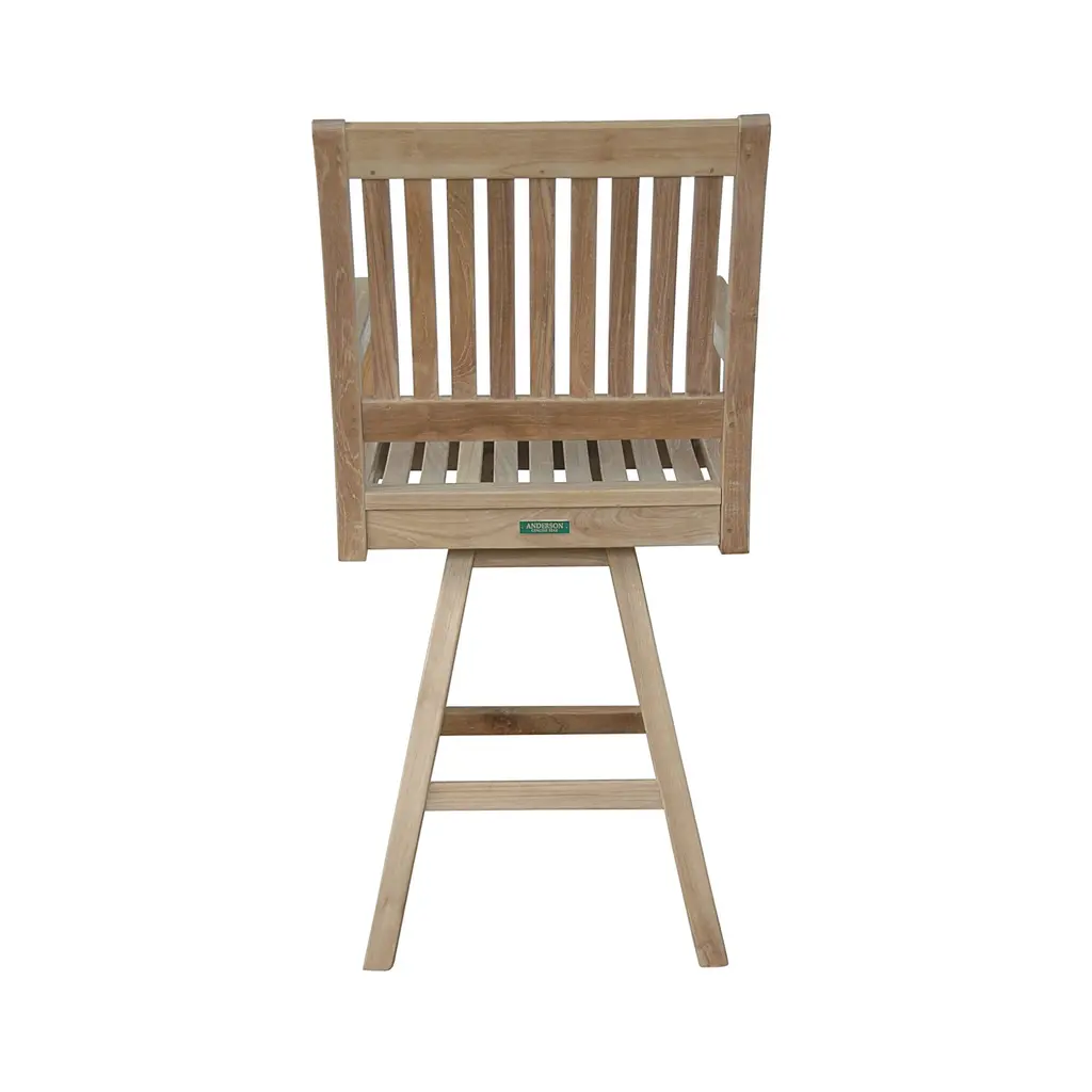 Enjoy your favorite pint of ale with this Rialto Teak Bar Stool with Swivel-Base. Made for a wide range of movement it features a full 360 degrees of swivel movement that doesn't snap back, but remains smoothly in place within any degree. The perfect complement to any high bar table, it can also be mix and matched with Anderson Teak's numerous Bar Table Collections. Constructed from Premium Teak wood sanded smooth, it is the perfect material for weathering the outdoors through rain, hail, or shine.