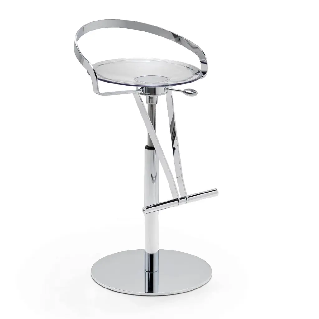 Cayman Bar Poli BT is the round-base stool with a footrest and a swivel structure made of steel in various finishes, featuring height adjustment via gas lift. The seat is made of transparent polycarbonate, and the backrest is made of steel in various finishes. It adds a modern, lightweight touch with sophisticated design.