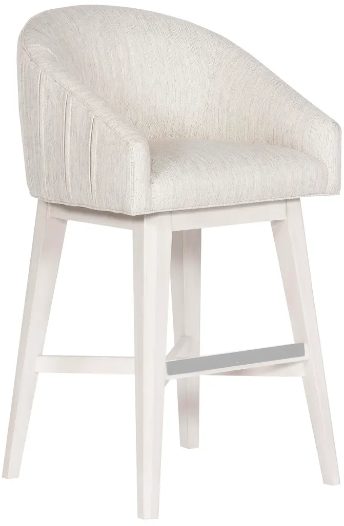 Vanguard Furniture's artisans hand-apply all finishes, taking careful steps to ensure each piece has the care and attention required to enhance the natural character of the furniture. No two pieces are the same — every piece of furniture is truly unique. This Ryder Bar Stool with a Wood Retro Swivel Base features Index Porcelain fabric, Casablanca finish and a brushed Nickel kickplate.