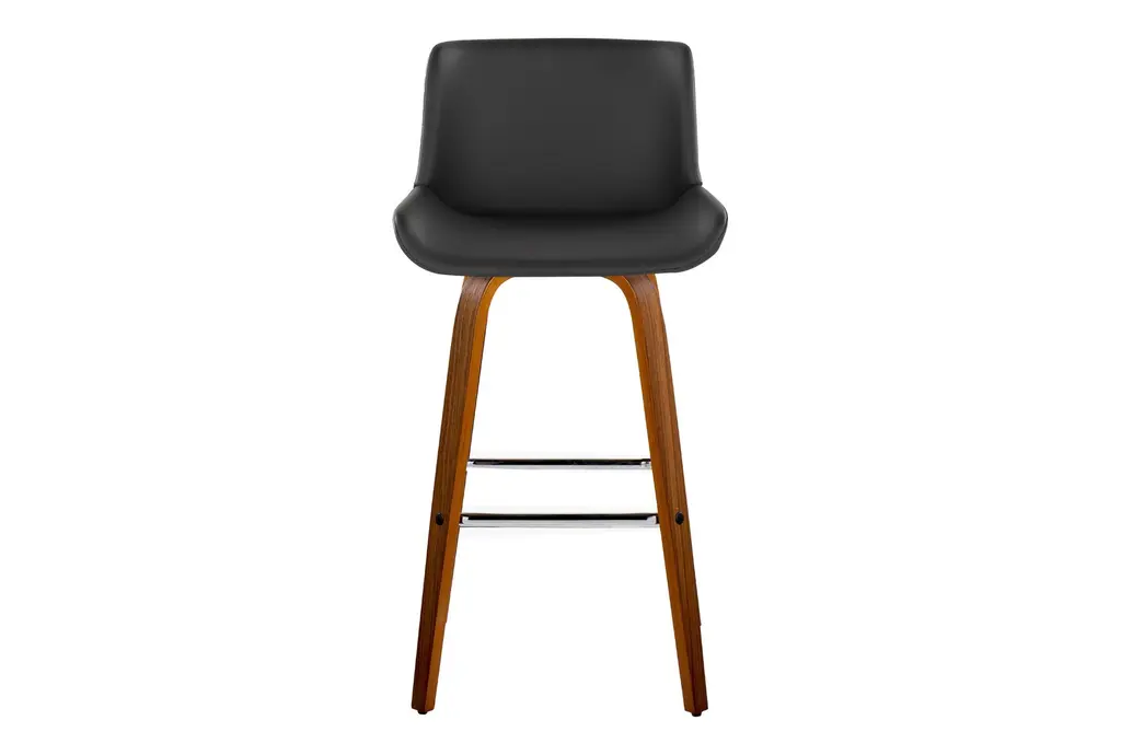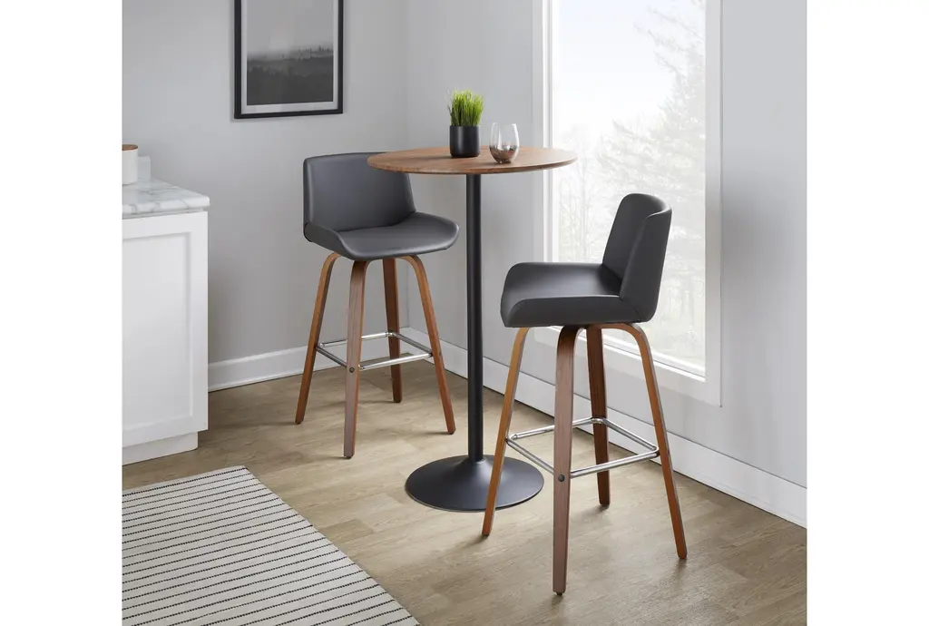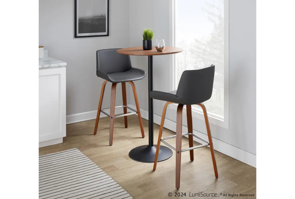 Enhance your home bar or kitchen island with the Santi 30" Midcentury Modern Fixed-height Barstool. This set of 2 barstools features a sleek grey faux leather upholstery and a stylish walnut wood finish, perfectly blending mid-century modern and contemporary design elements. The fixed bar height and 360-degree swivel functionality provide both comfort and convenience.