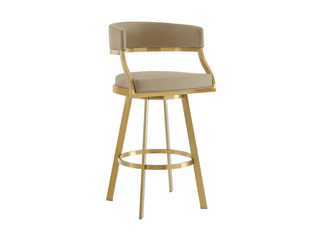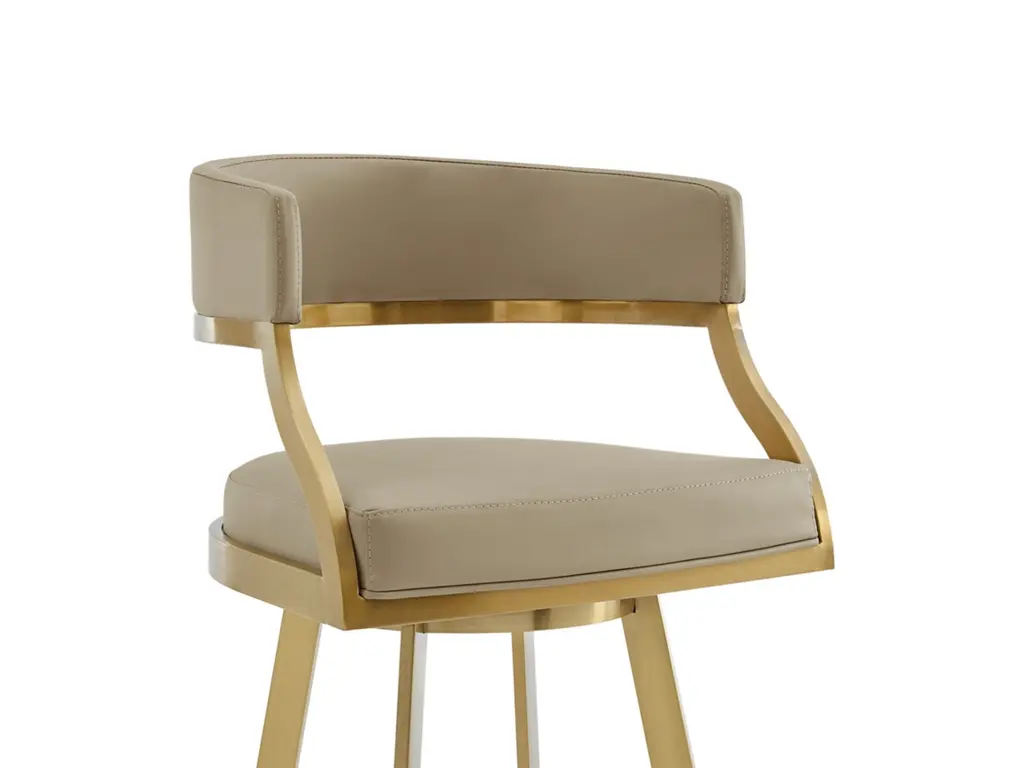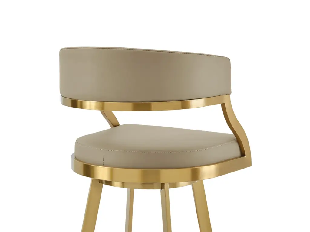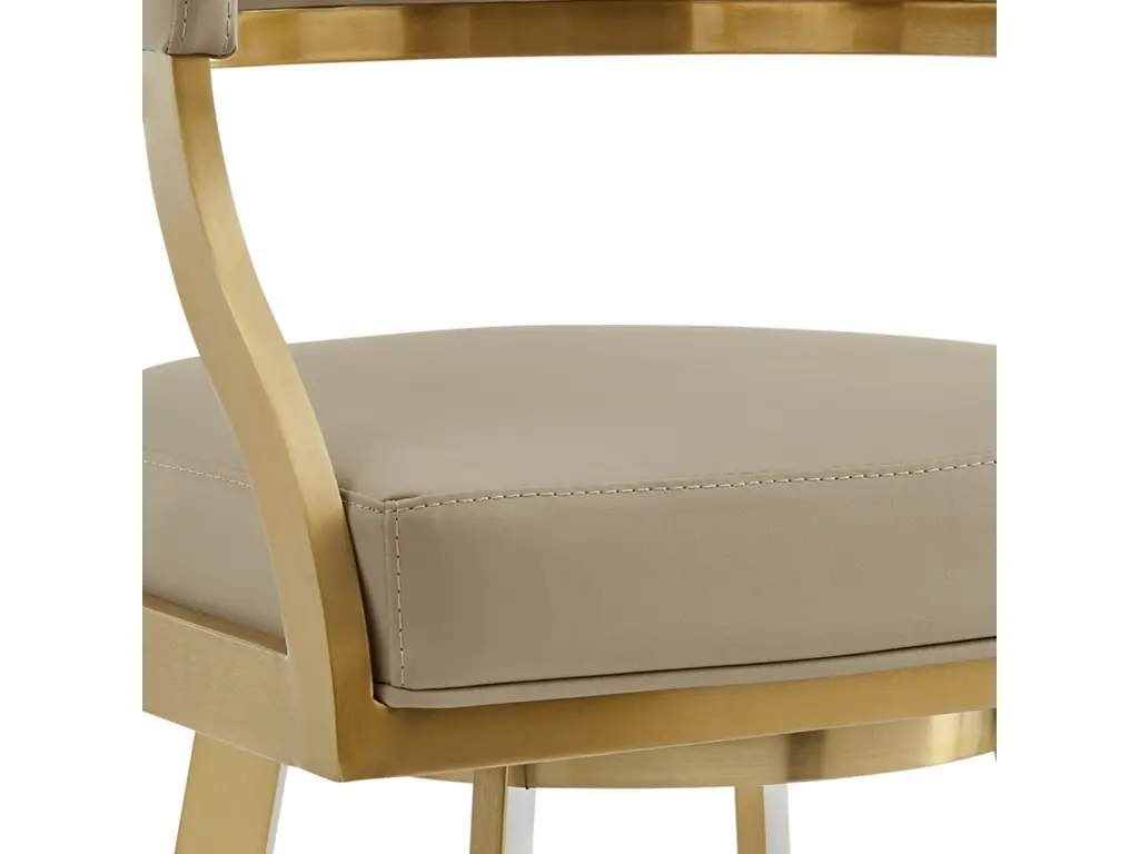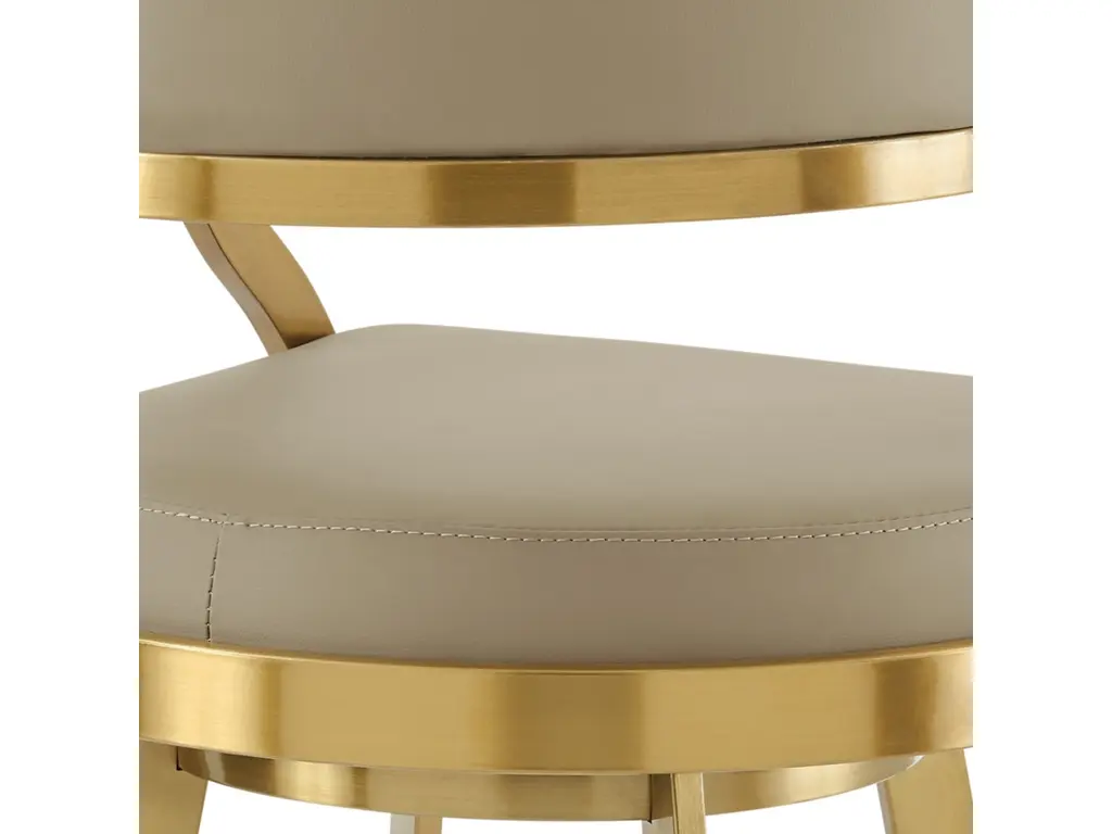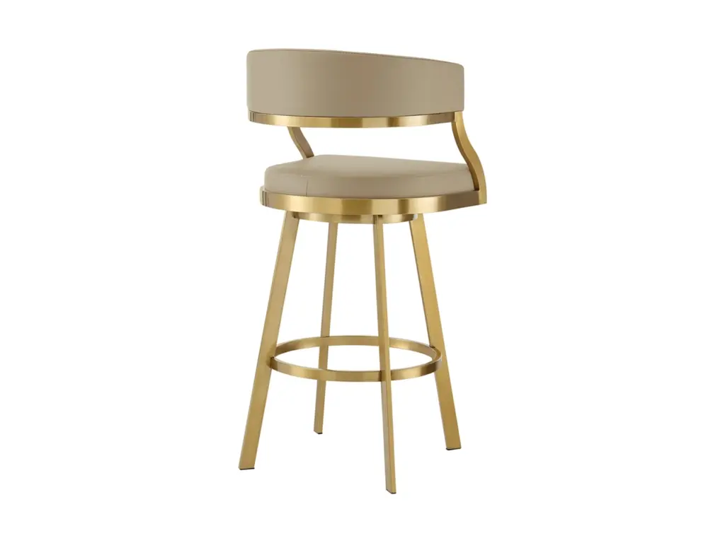 Bring sophisticated elegance and comfort to any corner of your space with the Saturn Swivel Counter or Bar Height Stool in Faux Leather and Stainless Steel by Armen Living. Refined design details and a mix of high-quality materials lend luxurious charm to our barstool. The beautifully stylized armrest and curved back offer a polished and sophisticated look. The generously padded, barrel back flows into the beautifully stylized armrests for maximum comfort and a sophisticated silhouette. Perched upon tapered stainless steel legs, the Saturn barstool effortlessly combines comfort and aesthetics. It adds a dose of style and practicality to your kitchen island, pub table, eat-in kitchen, home bar, or adjustable desk in a home office. This stool includes a built-in circular footstool for an added layer of comfort, along with the high-density foam cushions and supple faux leather. Each leg is tipped with floor protectors, ensuring that the bar stool will not slip on or scratch hardwood or tile floors, making this a durable bar stool that will last for many years to come. Its smooth 360-degree swivel function offers maximum mobility and will become your favorite spot to sit and enjoy conversations with friends and family. The Saturn Swivel Counter and Bar Height Stool is available in a Gold Brushed Stainless finish with Light Sand, White, or Black faux leather, or Brushed Stainless Steel finish in Gray or Black faux leather to bring lasting elegance to your home.