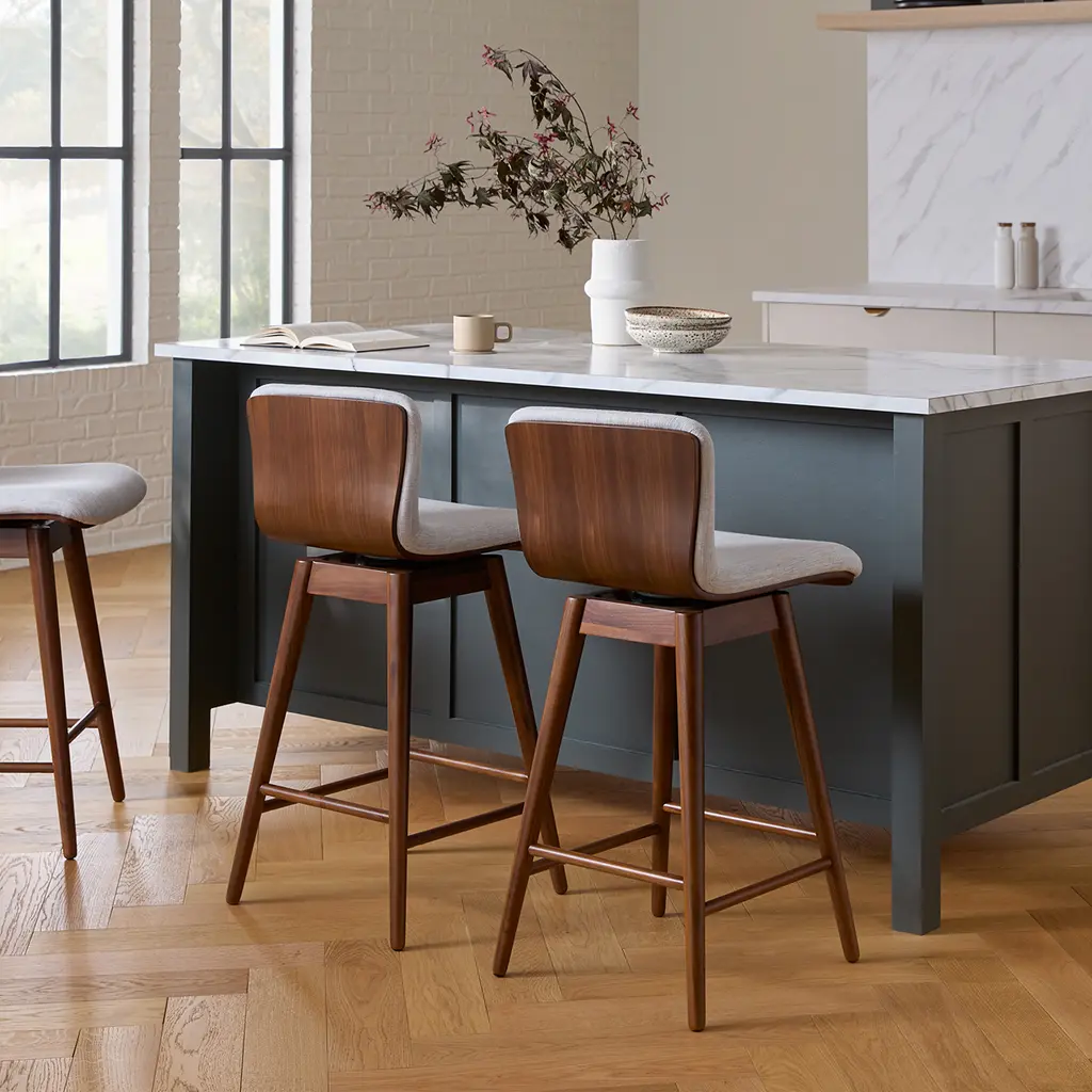Turn your day around. This Sede barstool turns on a swivel. Upholstered in durable fabric, the full-backed chair is set atop a solid-wood base. Keep the cook company, hold court in the living room — all without ever leaving your seat.