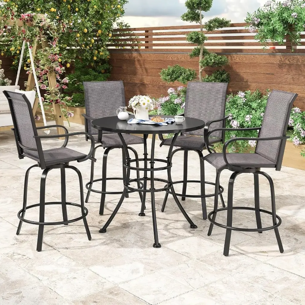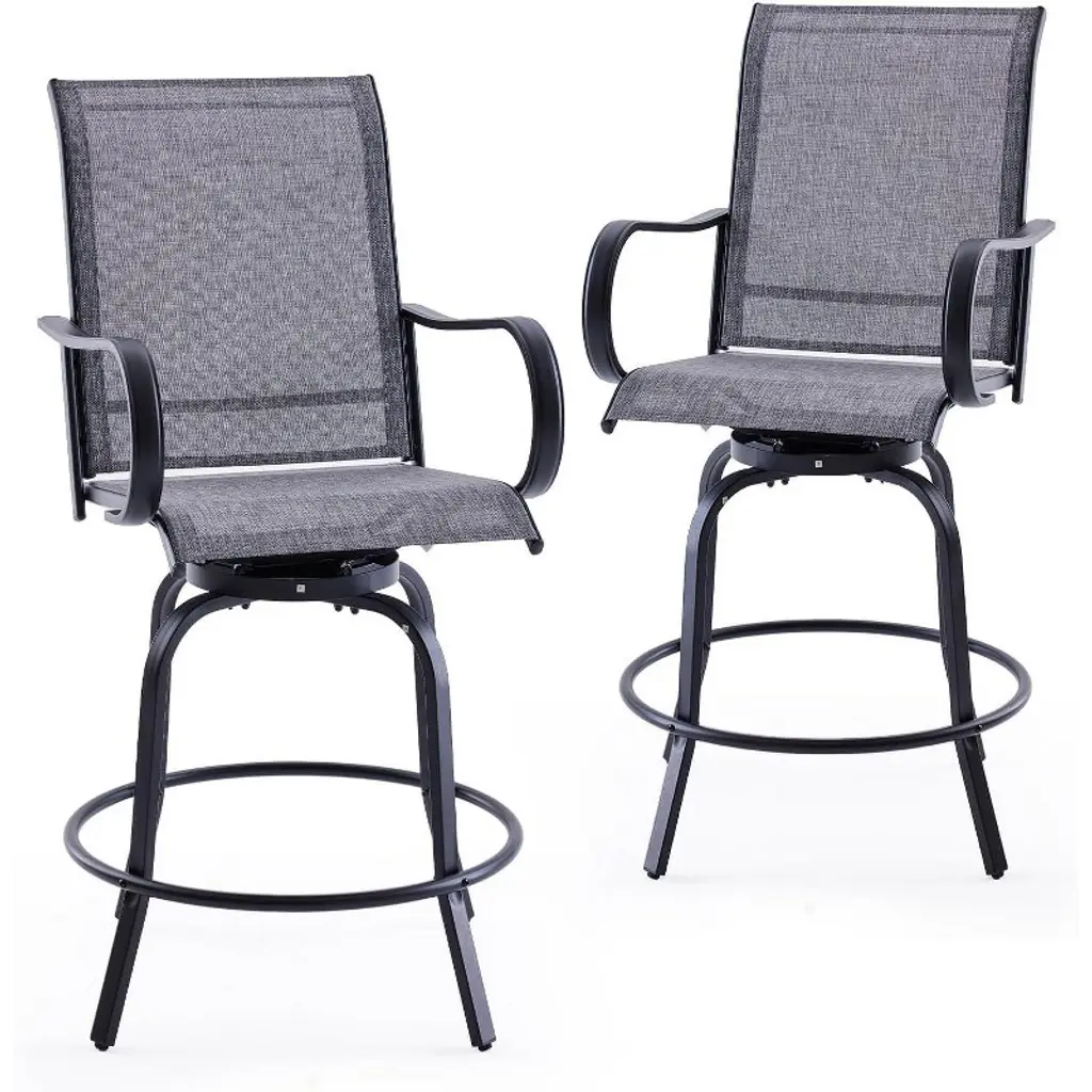 Enhance your outdoor seating area with this set of 2 swivel bar stools, featuring durable Textilene fabric and a 360° rotation mechanism for ultimate comfort and versatility. Designed to withstand all weather conditions, these ergonomic stools are perfect for adding a touch of style and functionality to your balcony or patio. Whether you're enjoying a casual drink or hosting a gathering, these stools provide a comfortable and inviting seating option that will complement any outdoor setting.
