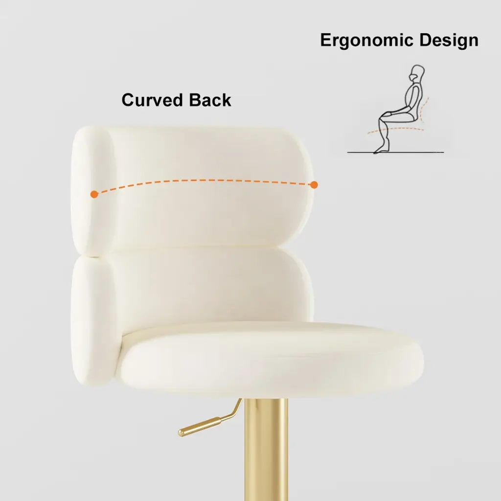 This 4-piece swivel bar stool set gives a complete renovation to your dining room or kitchen island. Each stool boasts a modernly curved back for ergonomic support and a plush, round seat upholstered in soft beige velvet for ultimate comfort. Further versatility is provided with an adjustable height and swivel function, while the sturdy gold stainless steel frame, complete with a built-in footrest, promises durability and stability. Sleek in design and of premium quality, a set of these bar stools surely brings sophistication and practicality to the modern home.