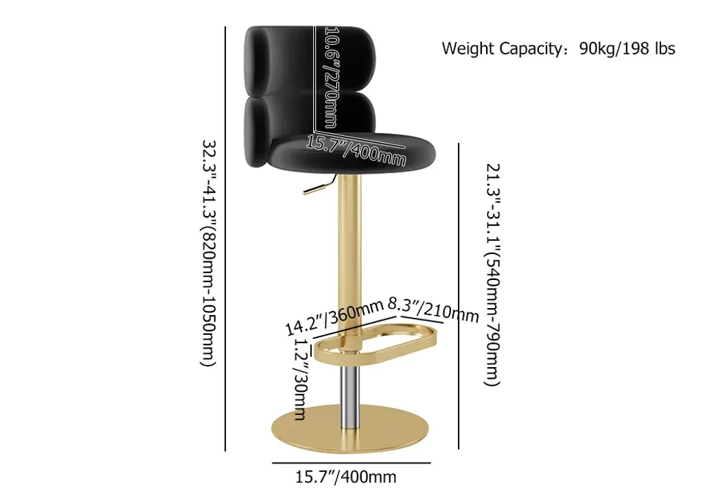 Give your dining or kitchen area a face-lift by placing this stylish modern swivel bar stool. It comes upholstered in the richness of black velvet, featuring a comfortable round seat and a curved backrest for support. The adjustable height function makes it appropriate for various counters, while the footrest adds an extra angle of comfort. Crafted with a sleek gold stainless steel frame, this stool infuses elegance and durability into your space. The perfect setting to enjoy your meals or socialize in style, this swivel bar stool will elevate any room.