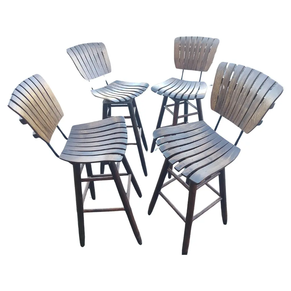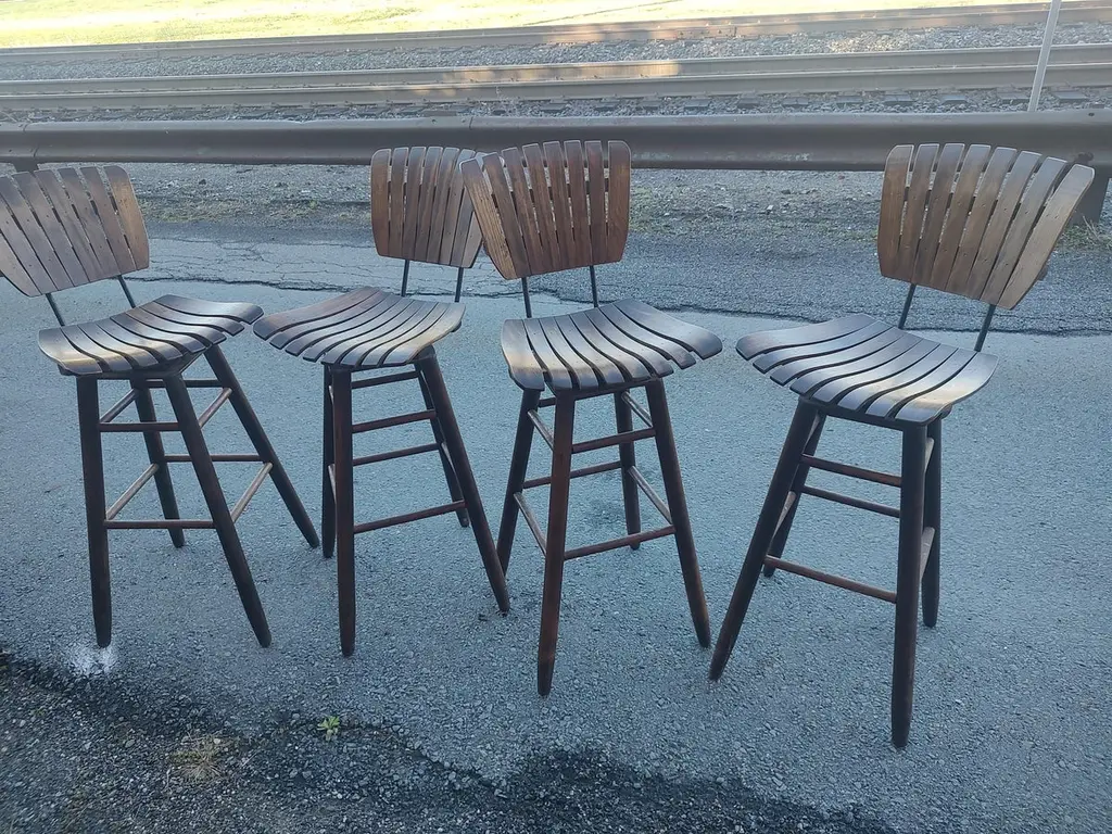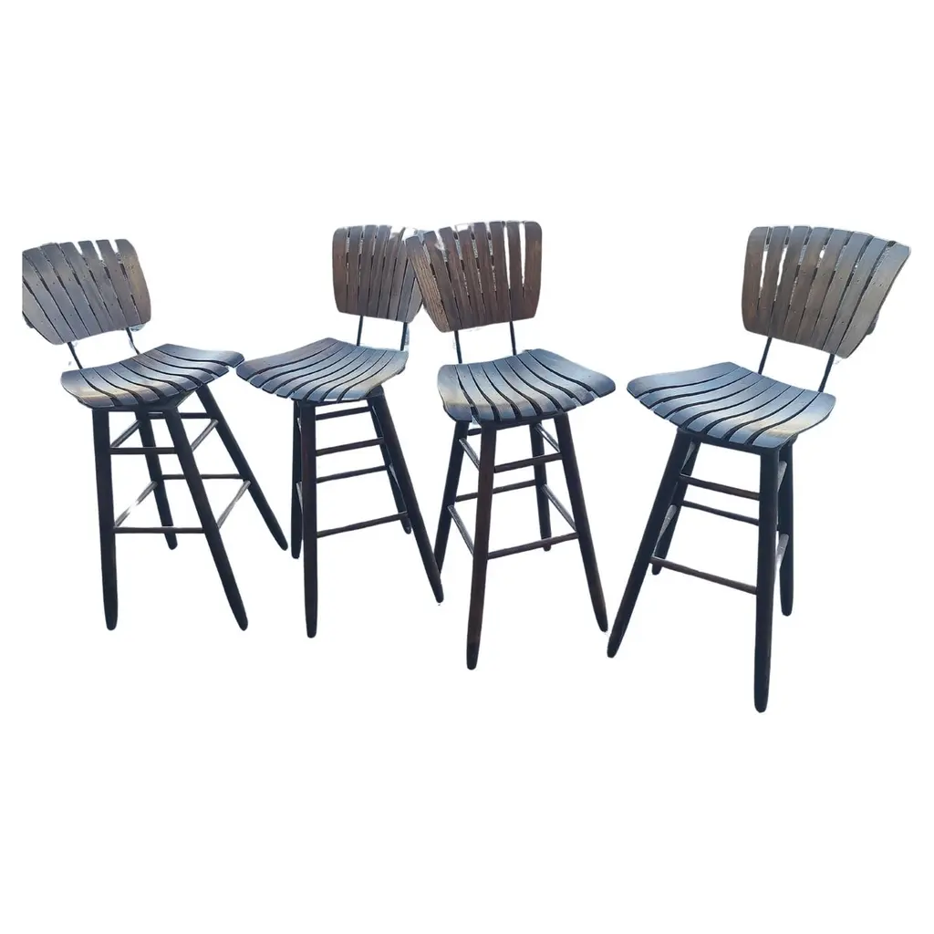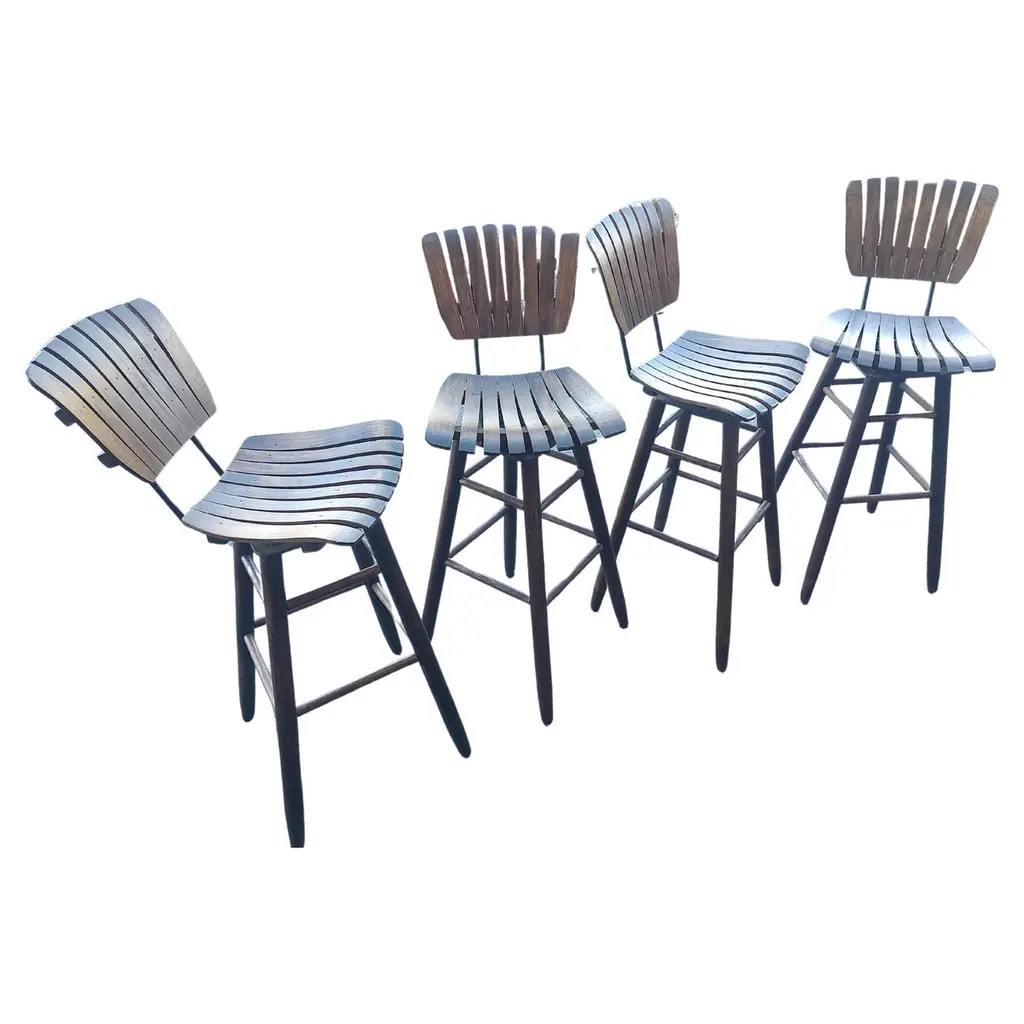 Set of four wood Slatted bar/counter stools with a seat height of 30 inch. All hardwood with iron connectors brackets for support. Will sell as pairs or all four together. In excellent vintage condition with minimal wear. All swivel. Priced individually.Please see all pics as that is part of the description