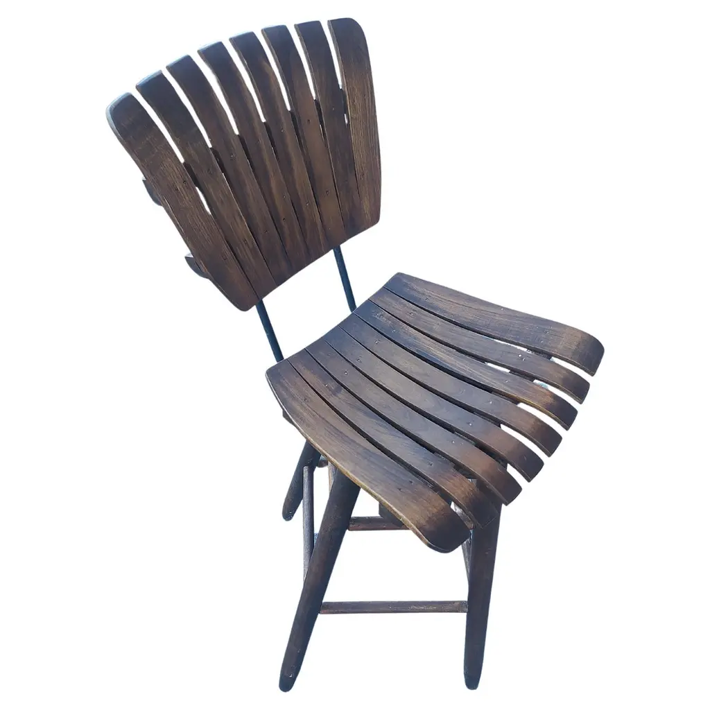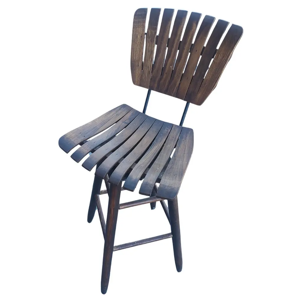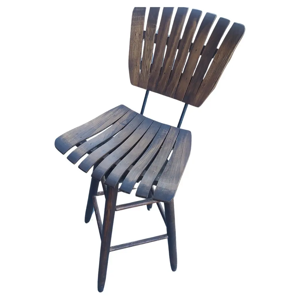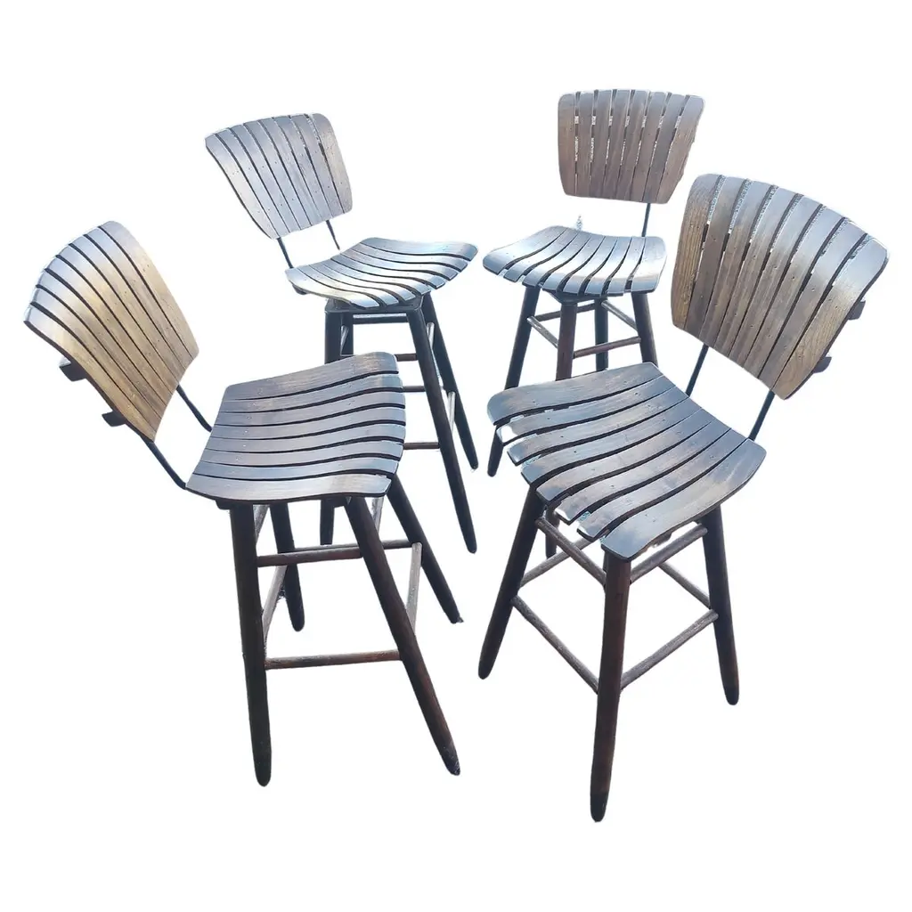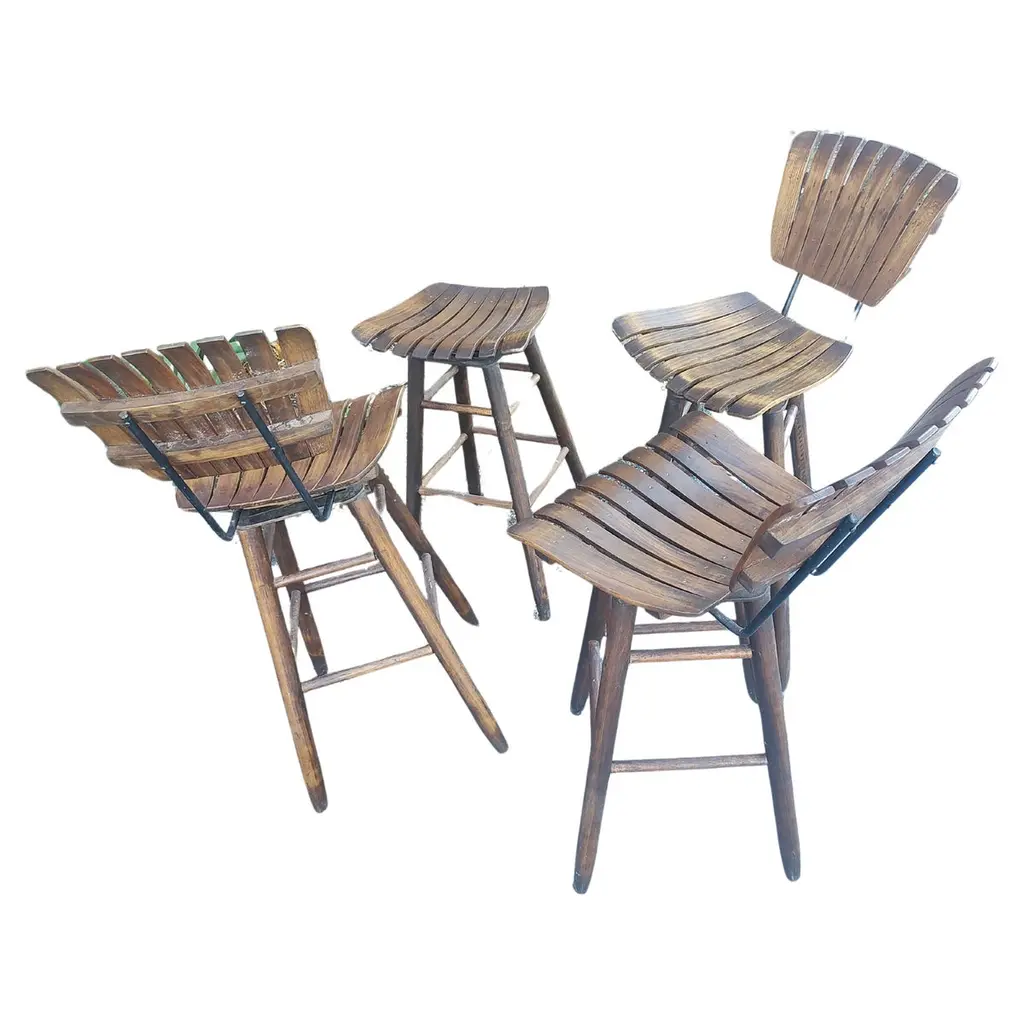 Set of four wood Slatted bar/counter stools with a seat height of 30 inch. All hardwood with iron connectors brackets for support. Will sell as pairs or all four together. In excellent vintage condition with minimal wear. All swivel. Priced individually.Please see all pics as that is part of the description