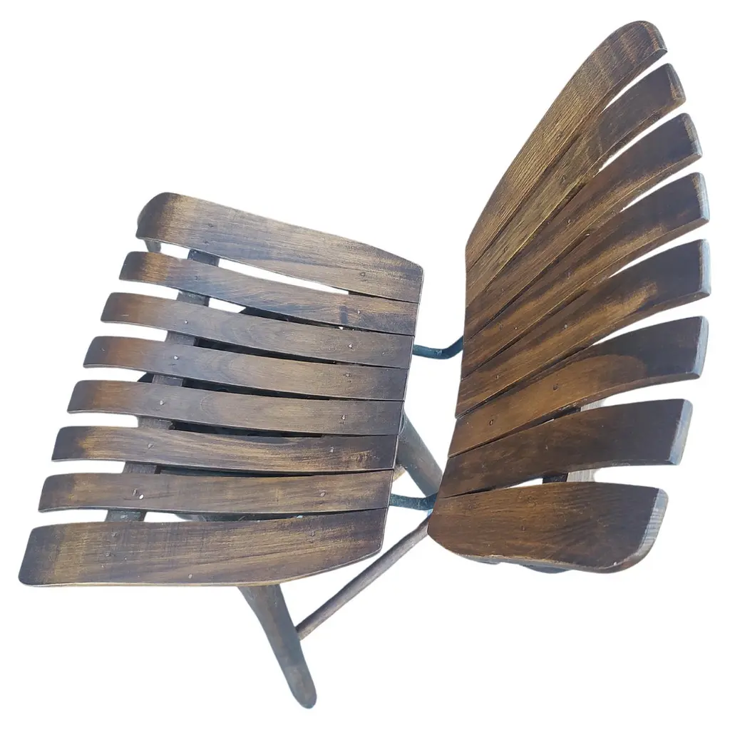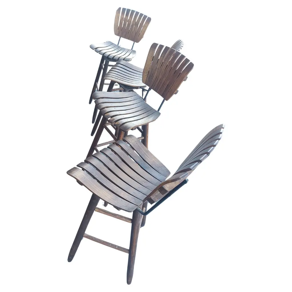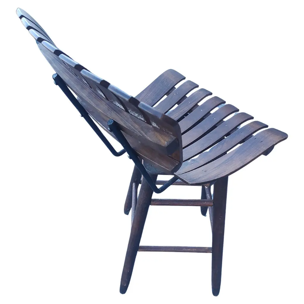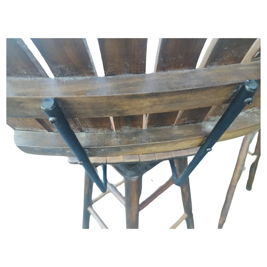 Set of four wood Slatted bar/counter stools with a seat height of 30 inch. All hardwood with iron connectors brackets for support. Will sell as pairs or all four together. In excellent vintage condition with minimal wear. All swivel. Priced individually.Please see all pics as that is part of the description