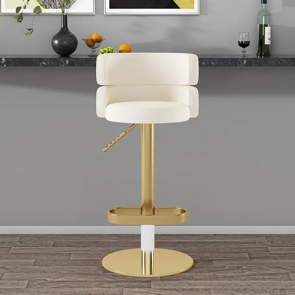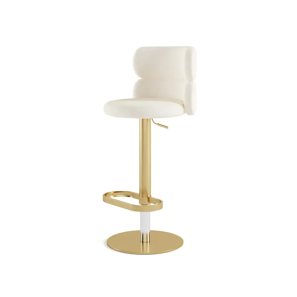 Bring a touch of affordable luxury into your kitchen with this swivel bar stool. Upholstered in soft beige velvet, it features a curved backrest for added support and comfort. The adjustable height mechanism ensures the most perfect fit on any counter or bar, while the gold-finished stainless steel legs add modern style and class. The round seat is filled with foam for extra comfort while sitting for long periods, completed with a footrest. This stool manages to effortlessly bring style and functionality together, making it ideal for any contemporary home.
